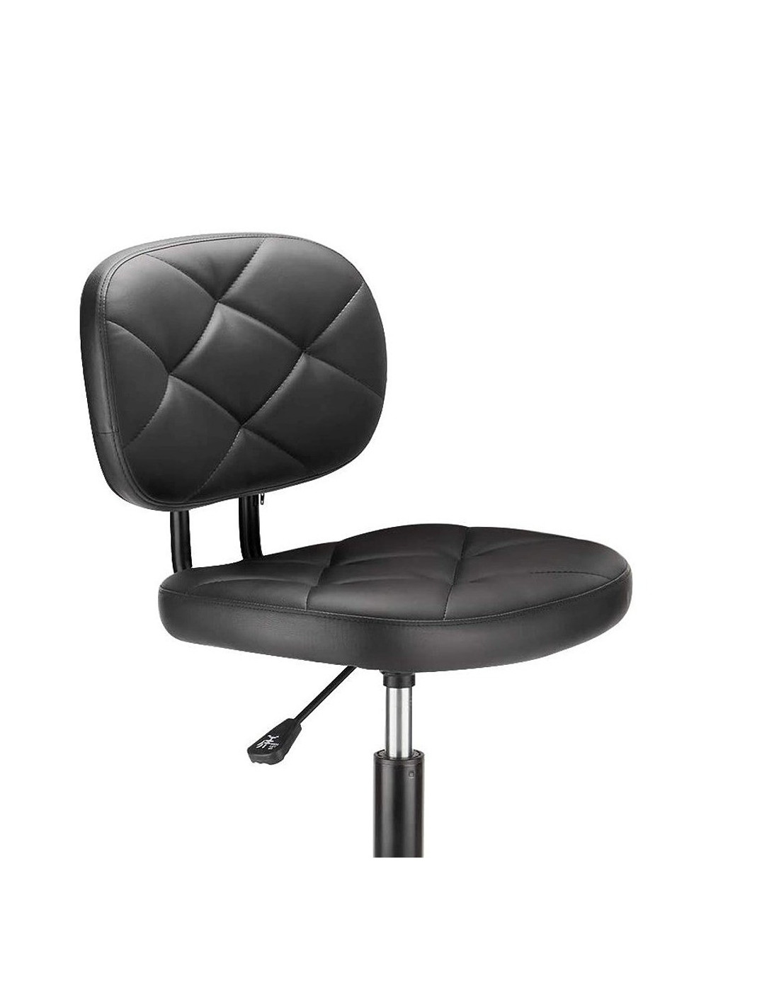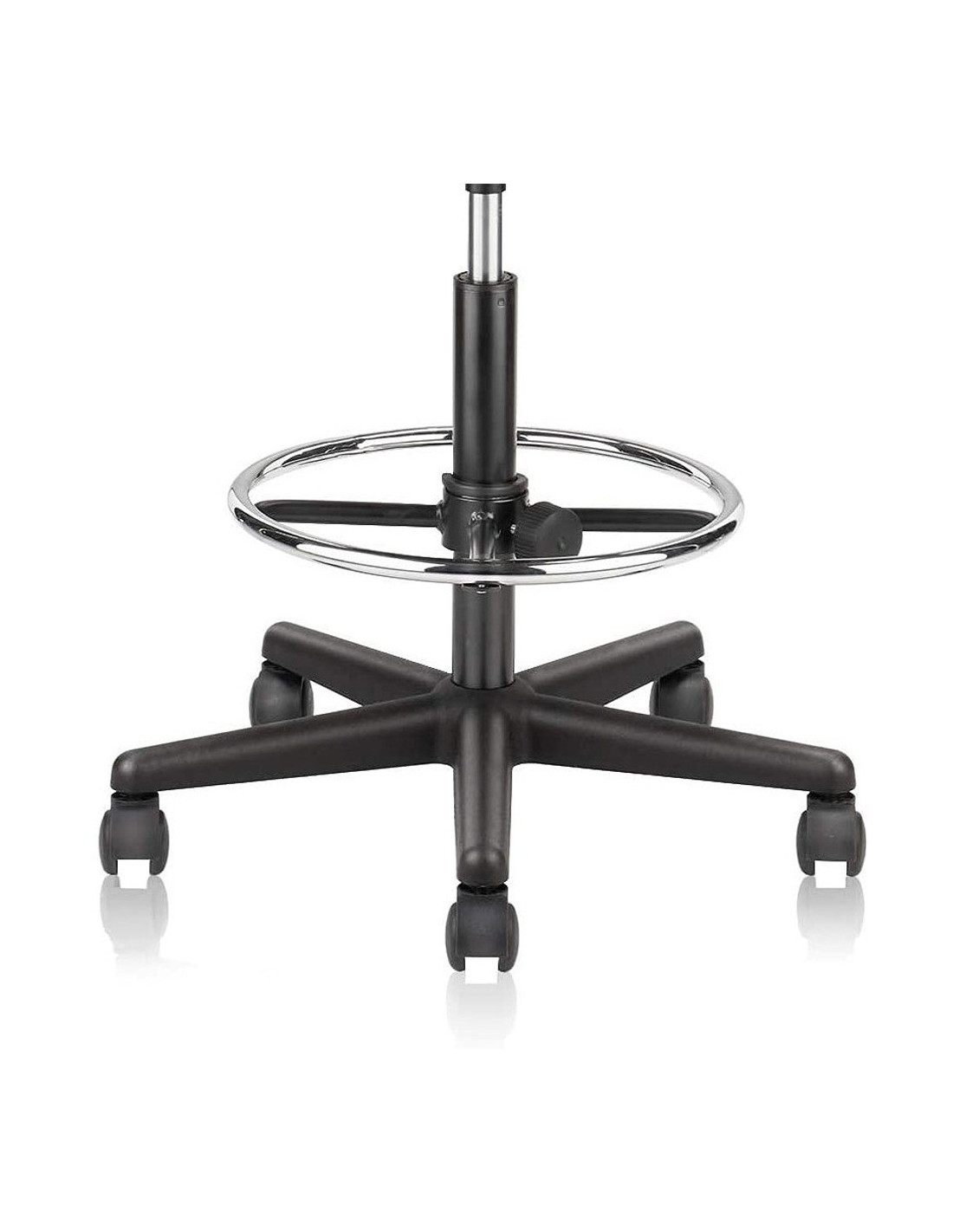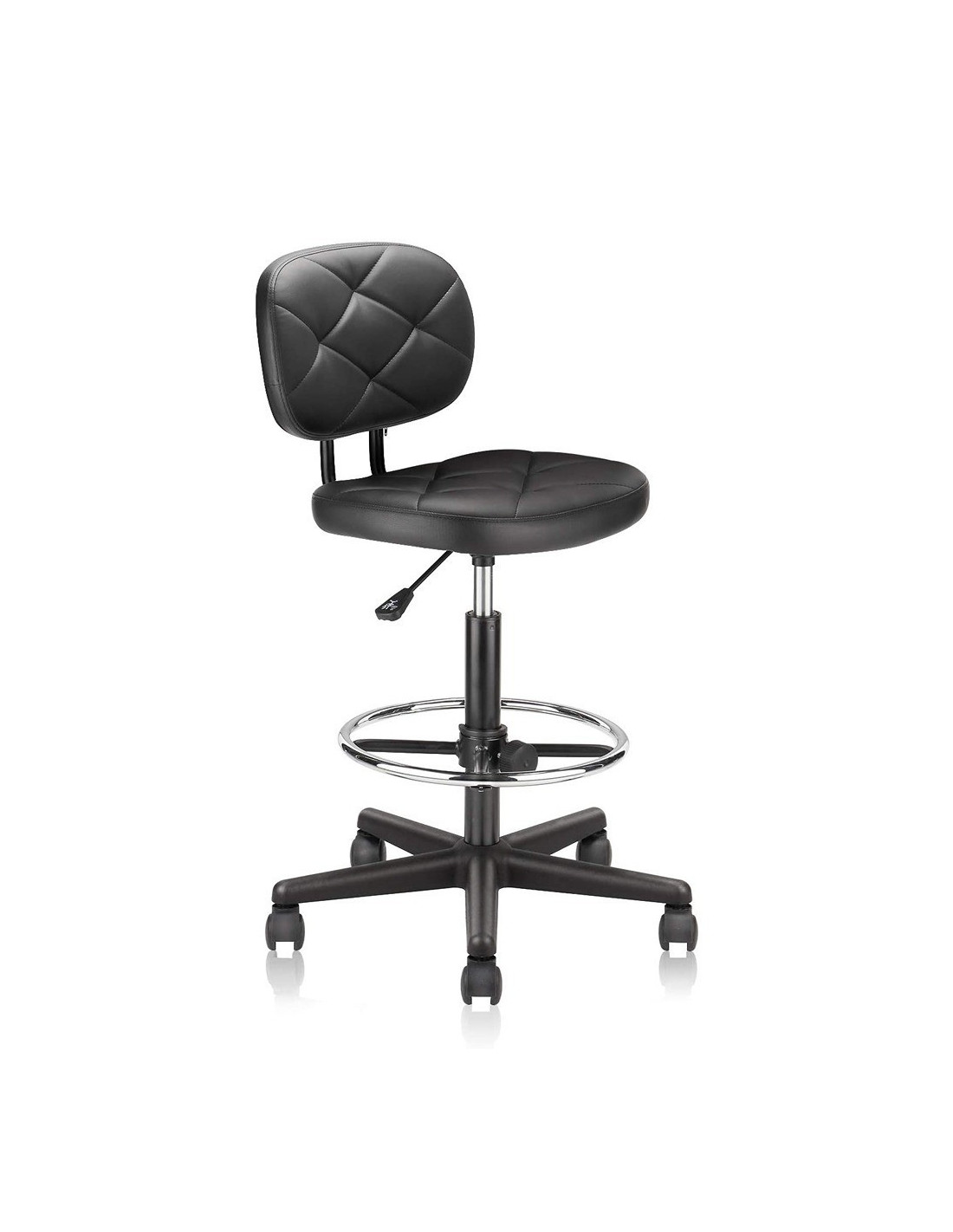 Ova moderna barska stolica opremljena je osloncem za noge za ugodno iskustvo sjedenja. Stolica je okretna i podesiva po visini, sa plinskim mehanizmom u bazi. Sjedalo i naslon presvučeni su kvalitetnom PU kožom crne boje prošivene ukrasnim šavovima za uljepšavanje izgleda stolice. Petokraka baza s kotačićima izrađena je od najlona.