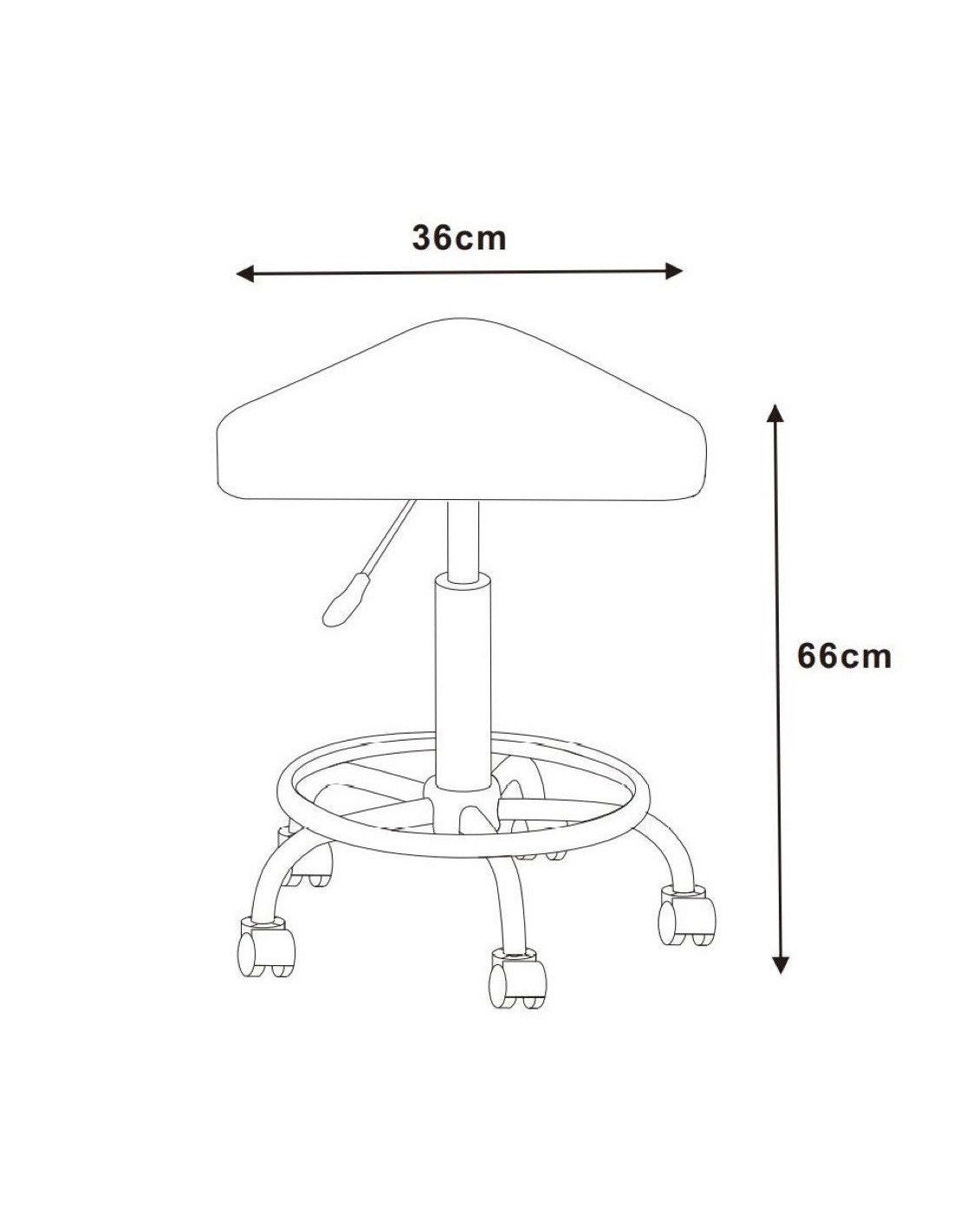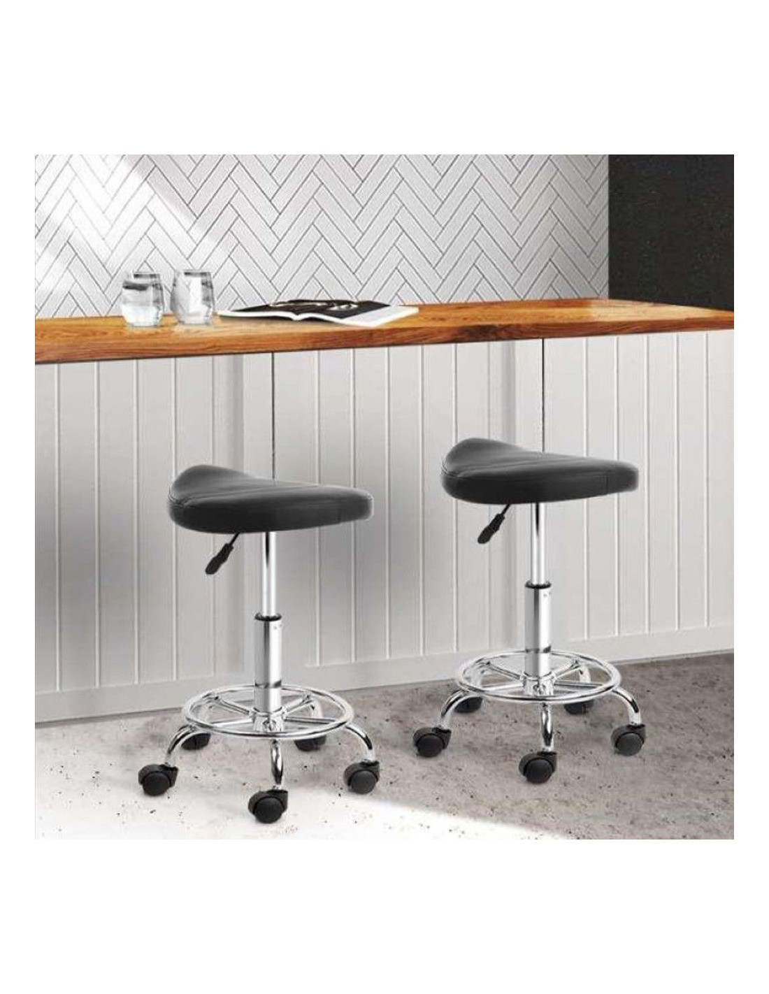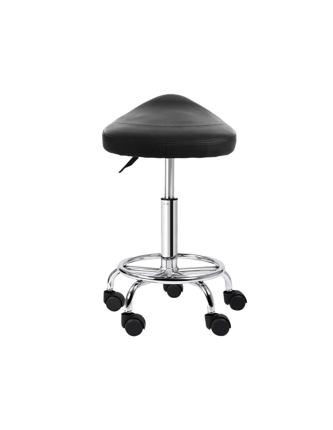 Moderna barska stolica na kotačićima, sa sjedalom u obliku sedla. Stolica je potpuno okretna i podesiva po visini, s plinskim mehanizmom u glavnom potpornom stupu. Sjedalo je presvučeno crnom PU kožom i široko je 36 cm u najširem dijelu, a baza je kromirana s mat završnom obradom. Baza je također opremljena okruglim osloncem za noge i pet kotačića koji omogućuju brzo i jednostavno pomicanje stolice po prostoriji. Maksimalna nosivost stolice je 120 kg.