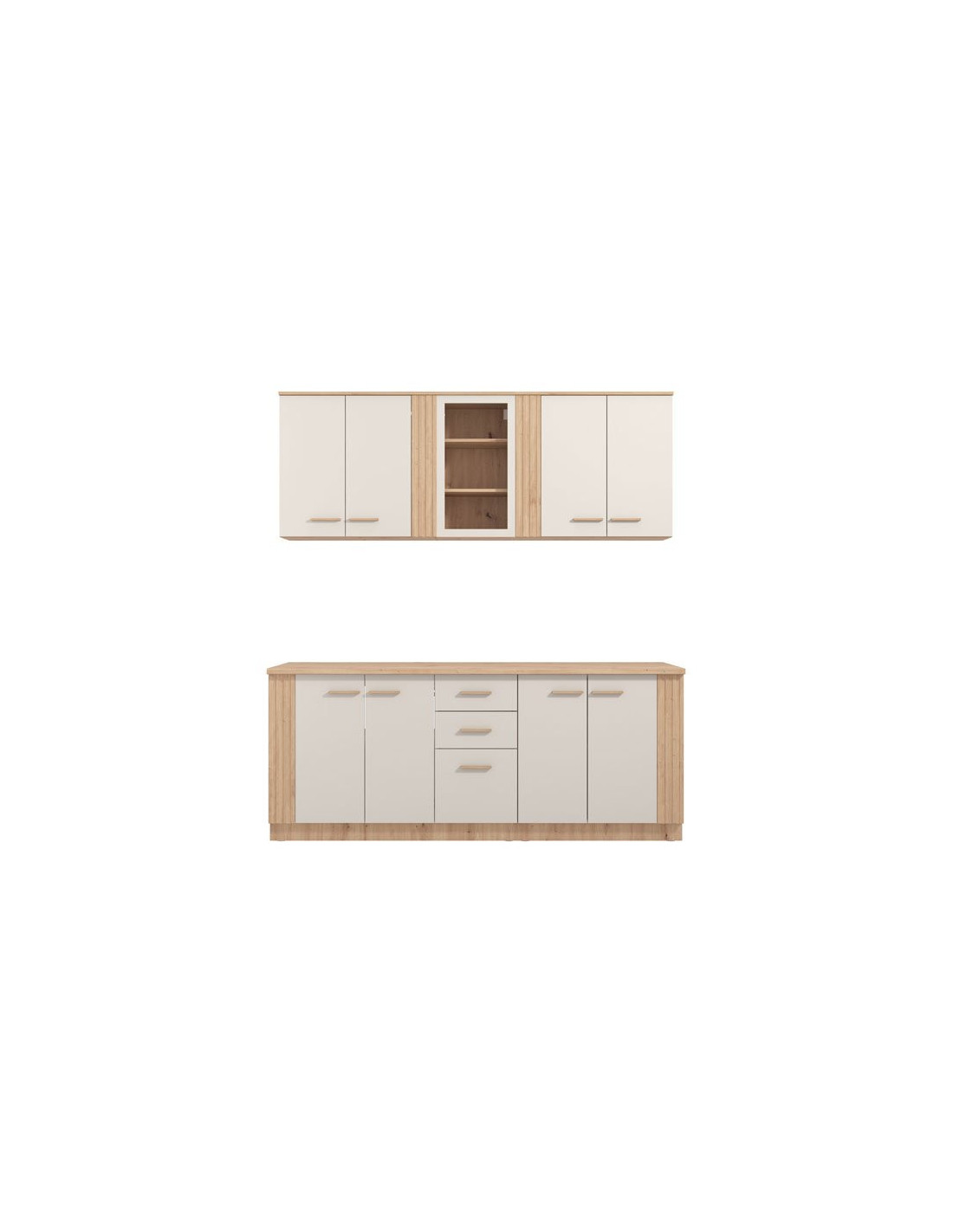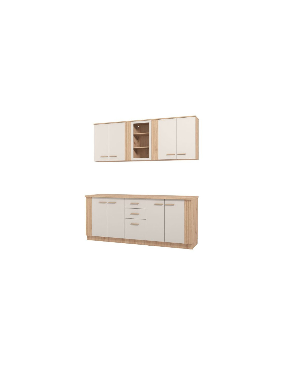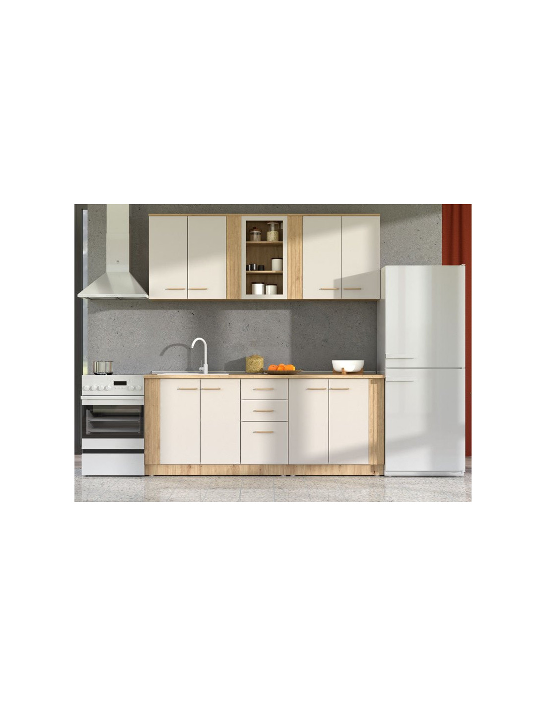 Kuhinja BELFORT 200 je cjelovito rješenje za uređenje kuhinjskih prostora. Kombinacija kašmirskog dekora, umjetničke hrastove folije i kašmirske mat folije daje ovom modelu kuhinje jedinstven suvremeni dizajn i izvanrednu estetiku. Zahvaljujući funkcionalnom rasporedu viseće zatvorene i jedne ostakljene pregrade, kao i donjih pregrada i jednog segmenta s ladicama, zadovoljava sve zahtjeve modernog doma.