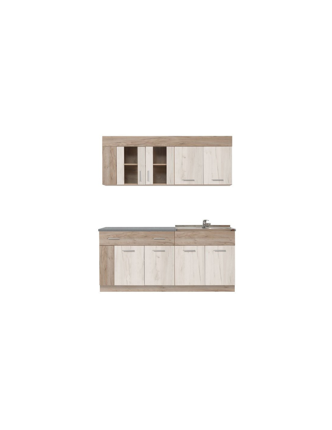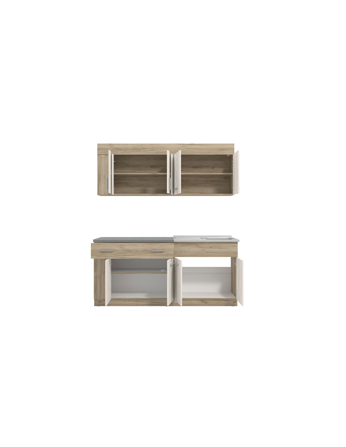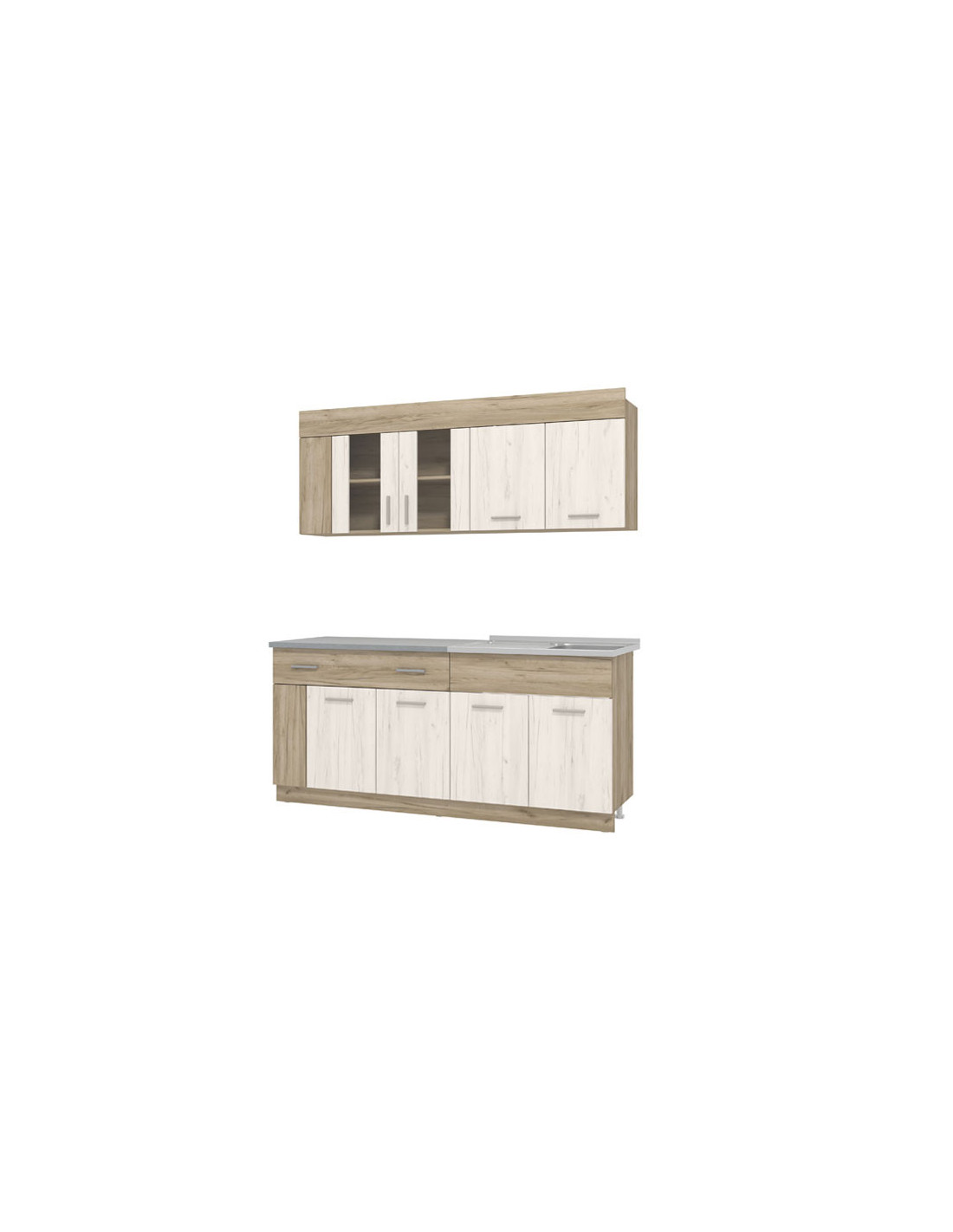 Kuhinja LEONA idealan je izbor za opremanje prostora različitih veličina, a svojim dizajnom, koji je u skladu s trendovima uređenja interijera, učinit će ambijent ugodnim i praktično organiziranim. Ovaj model odlikuje se poluostakljenim visećim elementima koji razbijaju ustaljenu monotoniju.