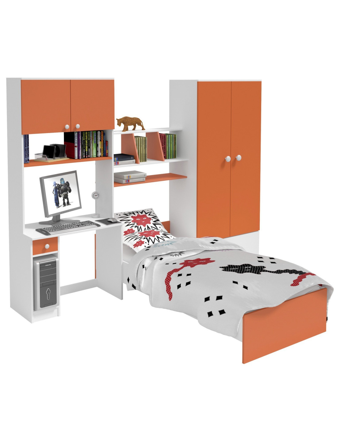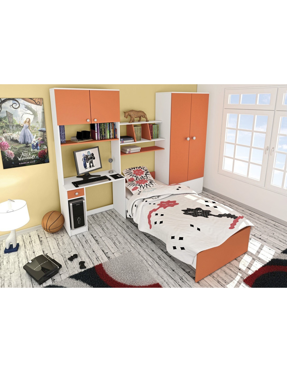 Moderna soba bijele boje s narančastim frontama, sastoji se od ormara s dvoja vrata i jednom ladicom, kreveta s površinom za spavanje od 90x200 cm i pisaćeg stola. Obogaćena je lijepo zamišljenim detaljima i funkcionalnim rješenjima, koji će omogućiti dovoljno prostora za odlaganje stvari.