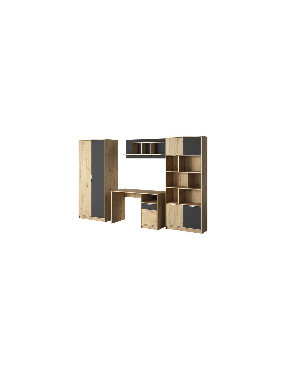 Soba se sastoji od regala, ormara za odjeću i pisaćeg stola. Svi komadi su izrađeni od kvalitetnih materijala koji osiguravaju dugotrajnost i izdržljivost. Namještaj također ima pregršt polica koje osiguravaju dosta mjesta za pohranu raznovrsnih dodataka te ormar mjesto za pohranu odjeće.