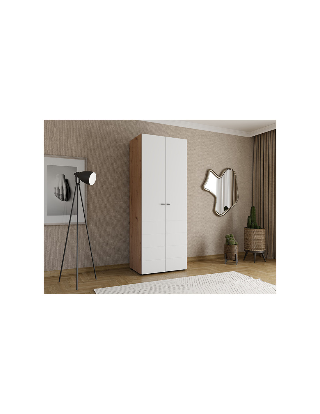 Ormar NEVIS 2K h207, u kombinaciji hrasta i bijele boje, praktično je i funkcionalno rješenje za pohranu odjeće. Opremljen je iskoristivim prostorom s vješalicom za odjeću, što omogućuje urednu organizaciju odjeće. Jednostavan i moderan dizajn čini ovaj model lakim za uklapanje u različite interijere. Pripada kolekciji NEVIS i može se kombinirati s drugim modelima iz iste linije.