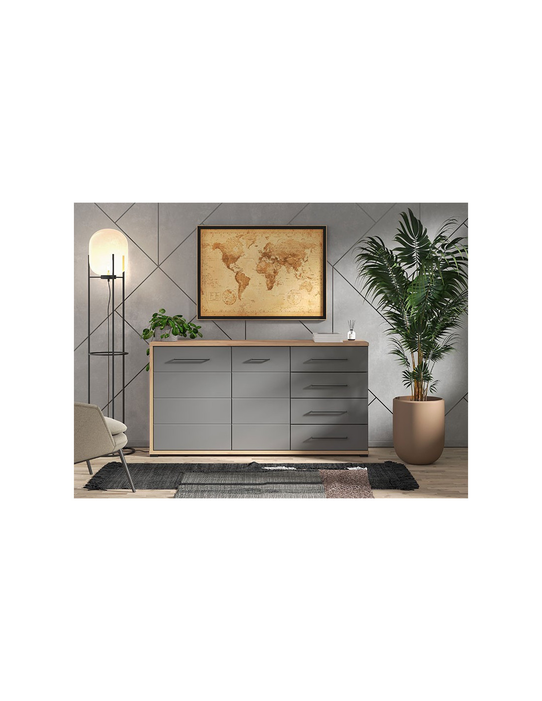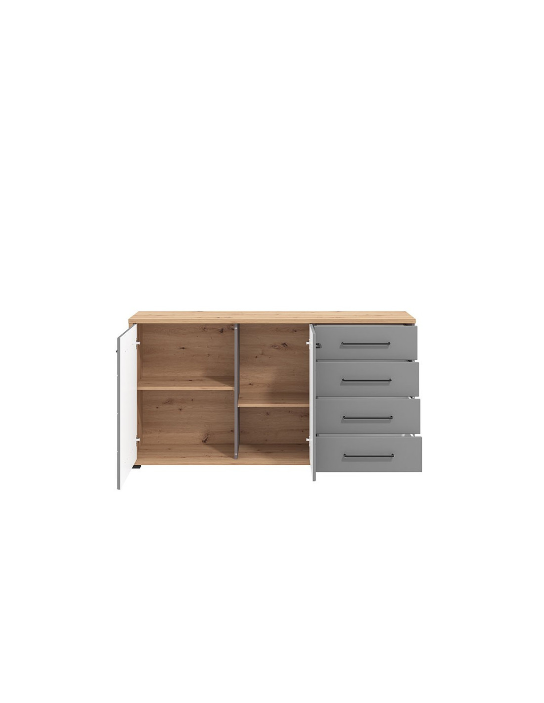 Komoda LISABON 3K4F atraktivno je i estetski privlačno rješenje za uređenje ambijenta doma. Korištenje prostora sastoji se od praktičnih ladica i dvije zatvorene pregrade. Ispravna geometrijska linija koja prati dizajn ove serije elemenata u skladu je s jednostavnim dizajnom ručki koje podržavaju zadani stilski smjer.