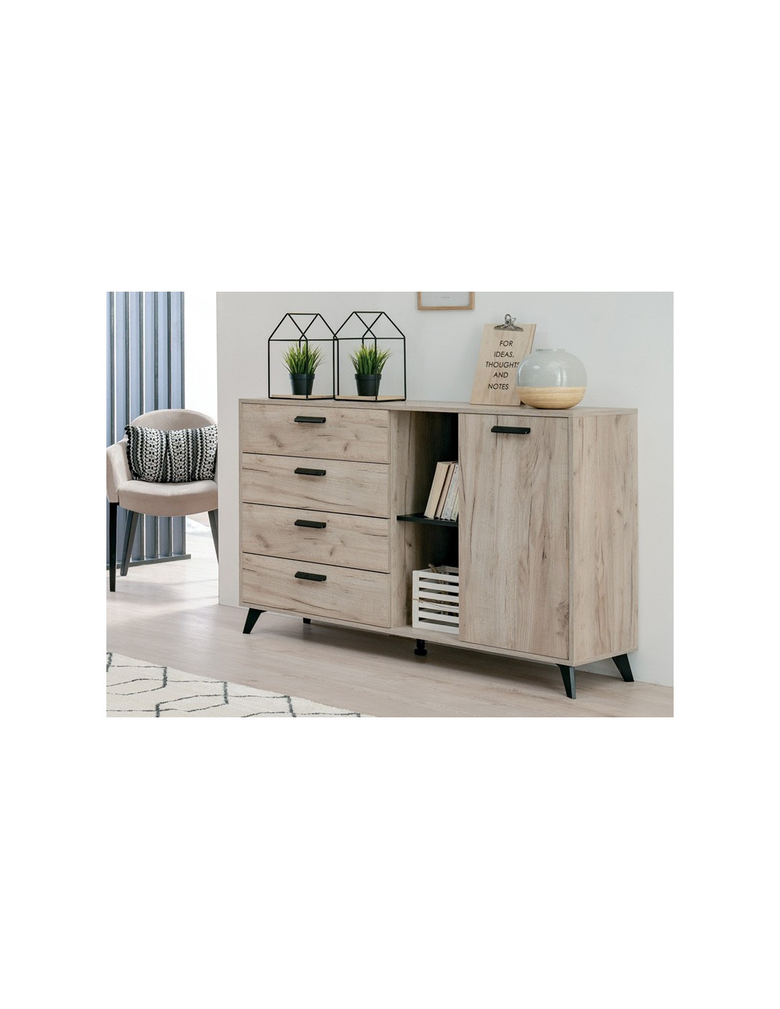 Komoda UMBRIA 3K4F, u kombinaciji sivog hrasta i crnog drva, dio je istoimene kolekcije koja će pridonijeti tome da vaš dom bude opremljen prema najnovijim standardima interijera. Sastoji se od tri dijela koji se sastoje od 4 prostrane ladice, kao i jednog otvorenog frontalnog dijela s unutarnjim pregradama. Zbog svoje funkcionalnosti idealno će se uklopiti u vašu spavaću sobu, dnevni boravak ili predsoblje.