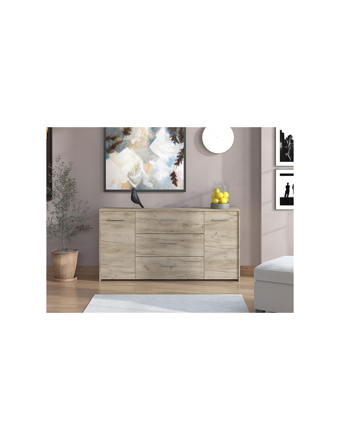 Komoda GARONA 3K3F u dekoru sivog hrasta doprinosi funkcionalnosti i eleganciji cijelog ambijenta. Savršeno raspoređen iskoristiv prostor ove komode sastoji se od dva zatvorena dijela s policom s lijeve i desne strane, kao i tri praktične ladice u srednjem dijelu.