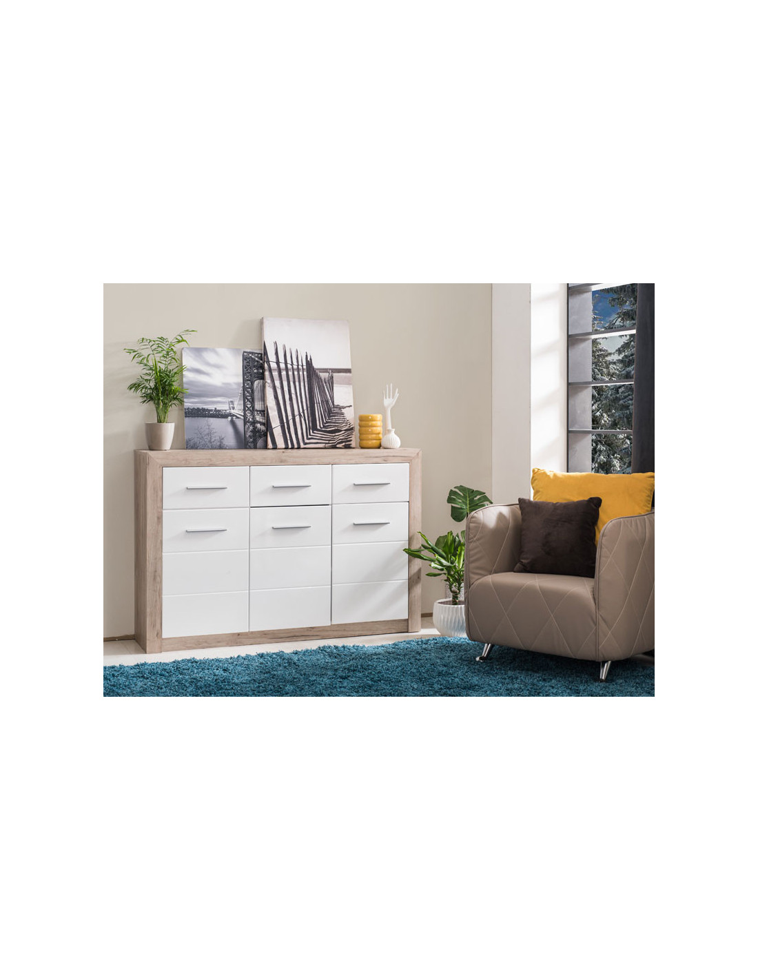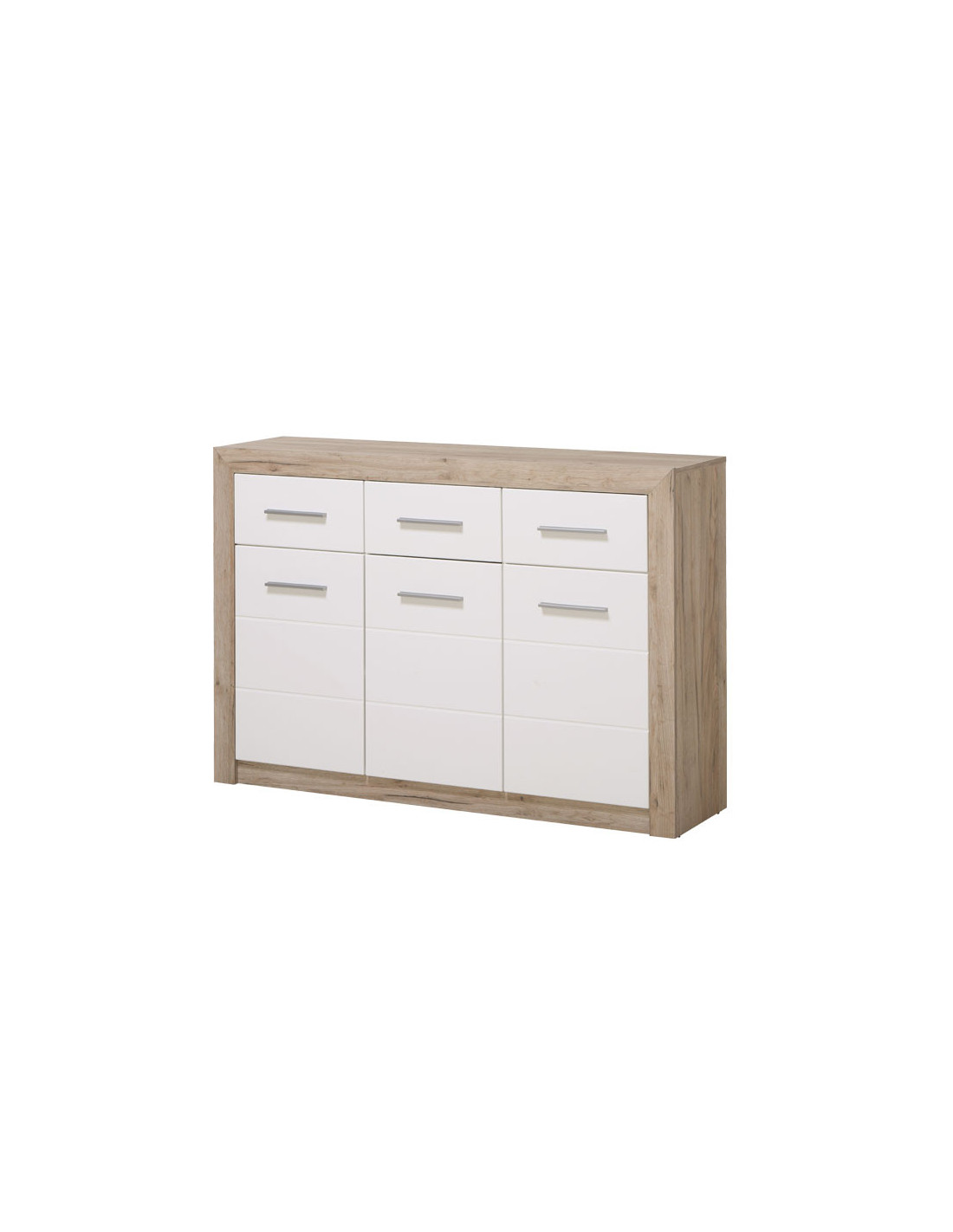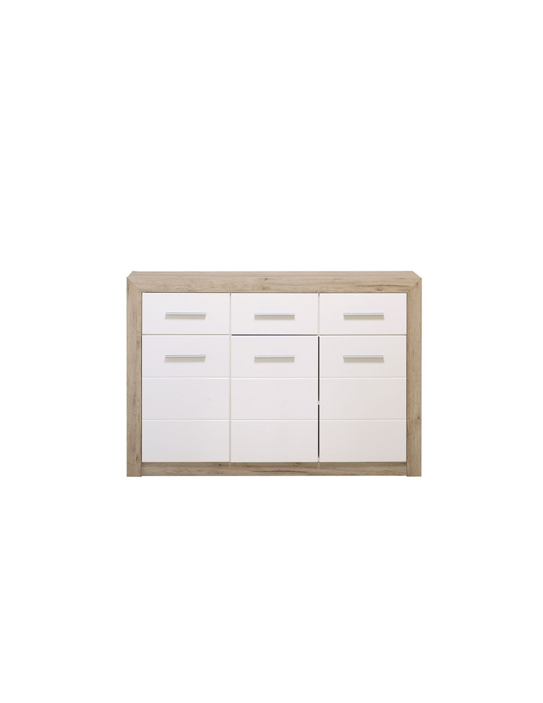 Komoda ETNA 3K3F u kombinaciji korpusa u dekoru sivog hrasta i fronta obloženih bijelom lak folijom ima tri praktična segmenta s pregradnim policama i tri ladice. Zahvaljujući svom dizajnu, komoda ETNA 3K3F kompatibilna je s različitim modelima namještaja namijenjenim opremanju dnevnog boravka, spavaće sobe ili hodnika.