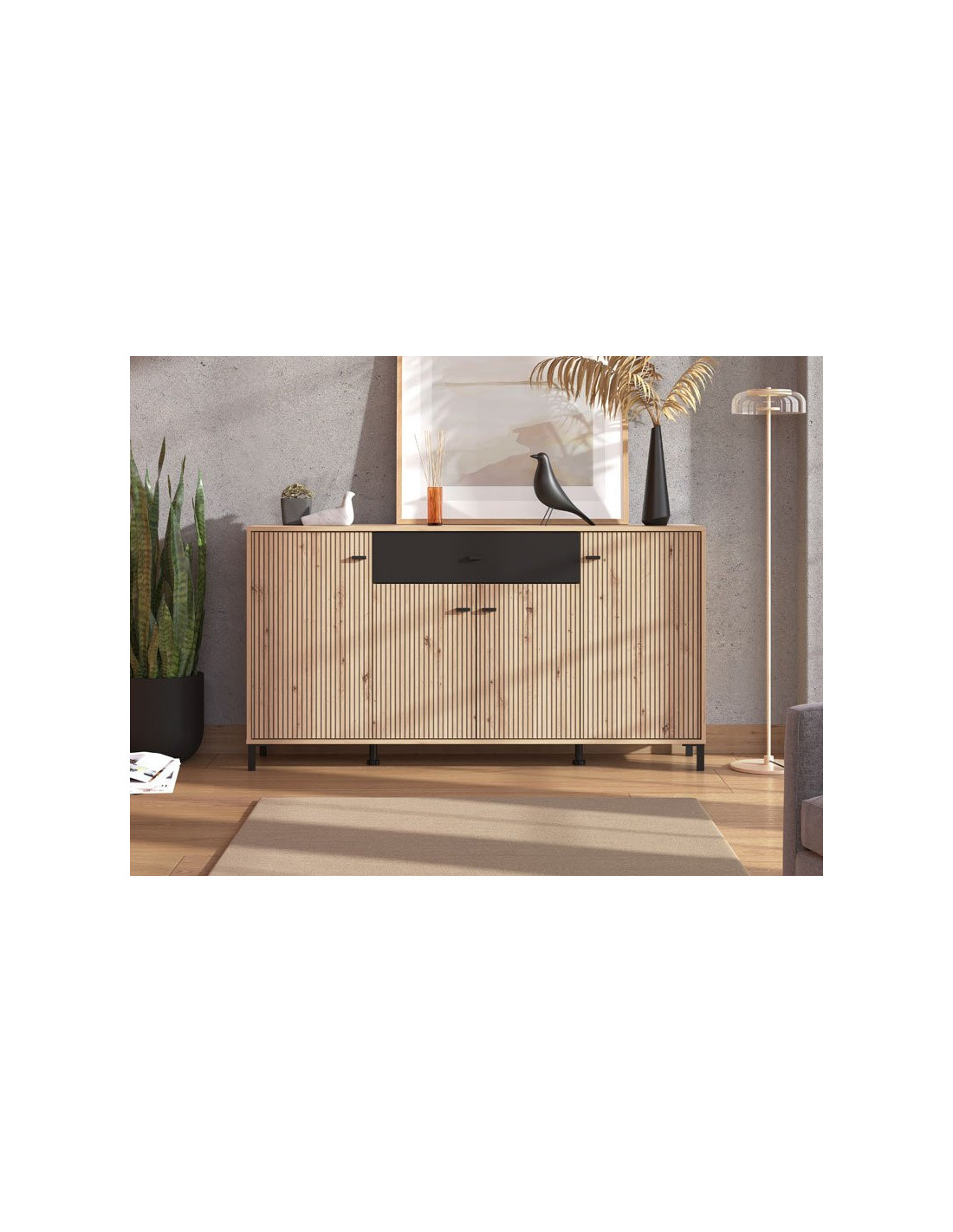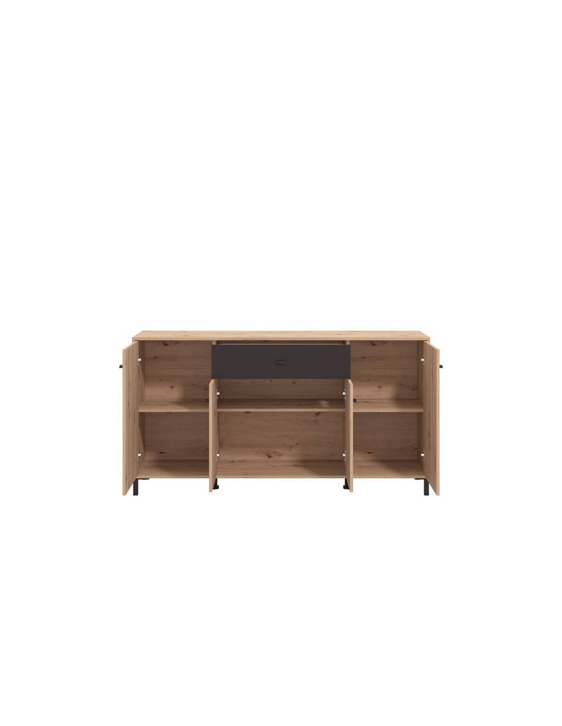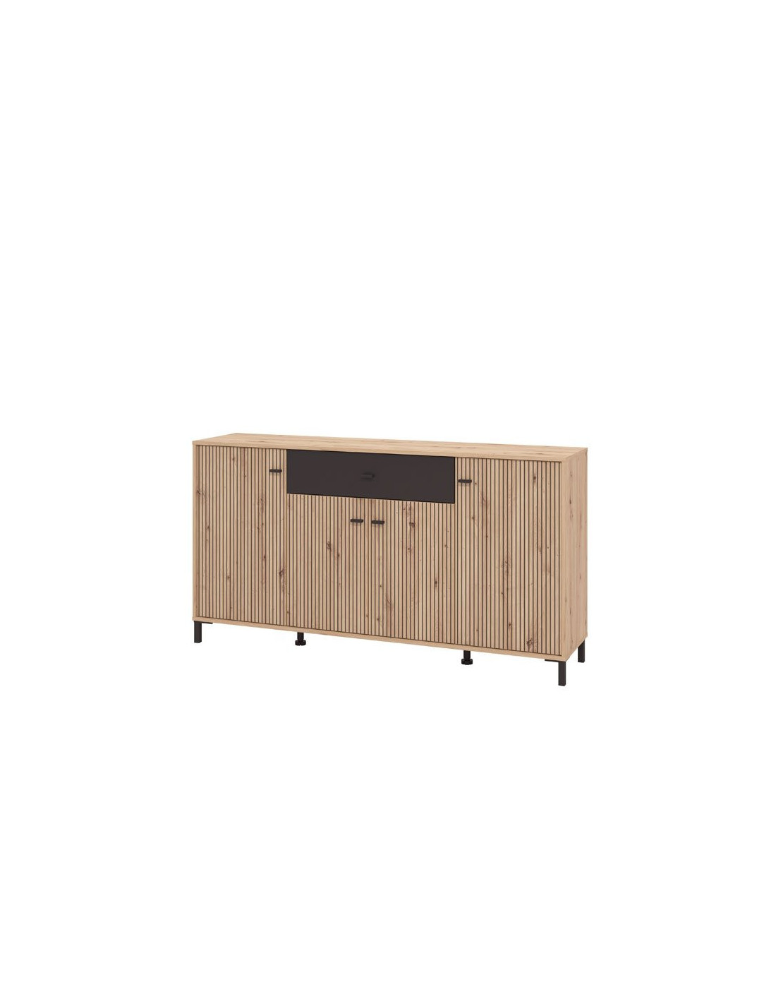 Ormarić AVIGNON 170 4K1F4V u dekoru hrasta artisan, crnom dekoru i hrastu artisan s prugama, moderno je dizajnirano rješenje za uređenje funkcionalnih i atraktivnih kućnih okruženja. Izvrsno raspoređen iskoristiv prostor ove komode sastoji se od četiri zatvorene pregrade i jedne praktične ladice u središnjem dijelu.