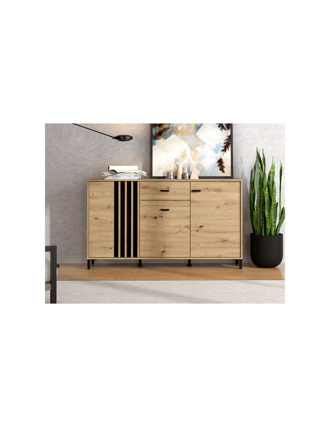 Komoda LAVAL 157 3K1F3V u kombinaciji hrasta umjetničkog stila, folije od hrasta umjetničkog stila, kao i crnog dekora, funkcionalan je komad namještaja koji je potreban u svakom kućnom okruženju. Dio je istoimene kolekcije koja će doprinijeti da vaš dom bude opremljen prema najnovijim standardima interijera, unoseći u prostor notu elegancije i sofisticiranog stilskog izričaja. Dobro raspoređen iskoristiv prostor ove komode sastoji se od tri zatvorena pretinca i jedne praktične ladice.