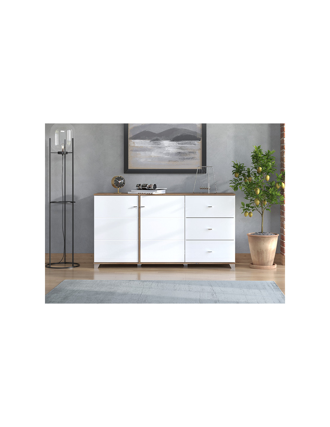 Komoda BURGUNDY 3K3F karakterizira se kombinacijom toplog dekora hrasta flagstaff i bijele lakirane folije. Predstavlja novu razinu estetske smjelosti koja karakterizira najmodernije domove, dok metalne ručke unose dodatnu ozbiljnost u dizajn ovog sustava elemenata. Dobro raspoređen iskoristiv prostor sastoji se od tri praktične ladice i dva zatvorena dijela, koje karakterizira sustav zatvaranja "soft close".