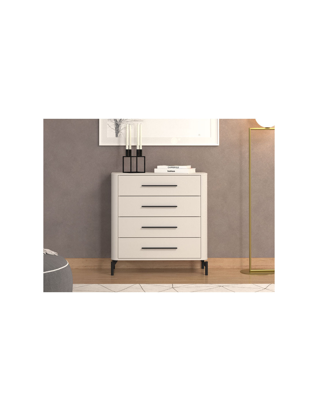 Komoda SERDICA 90 4F u kombinaciji dekora kašmira i mat folije kašmira, doprinosi profinjenosti i eleganciji cijelog okruženja. Dobro raspoređen iskoristiv prostor komode sastoji se od četiri prostrane ladice. Dio je istoimenog sustava namještaja za spavaće sobe SERDICA, s modernim dizajnom, zaobljenim rubovima na elementima i visokim nogama koje doprinose atraktivnosti moderno dizajniranog interijera.