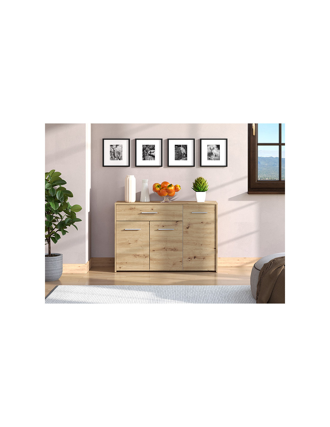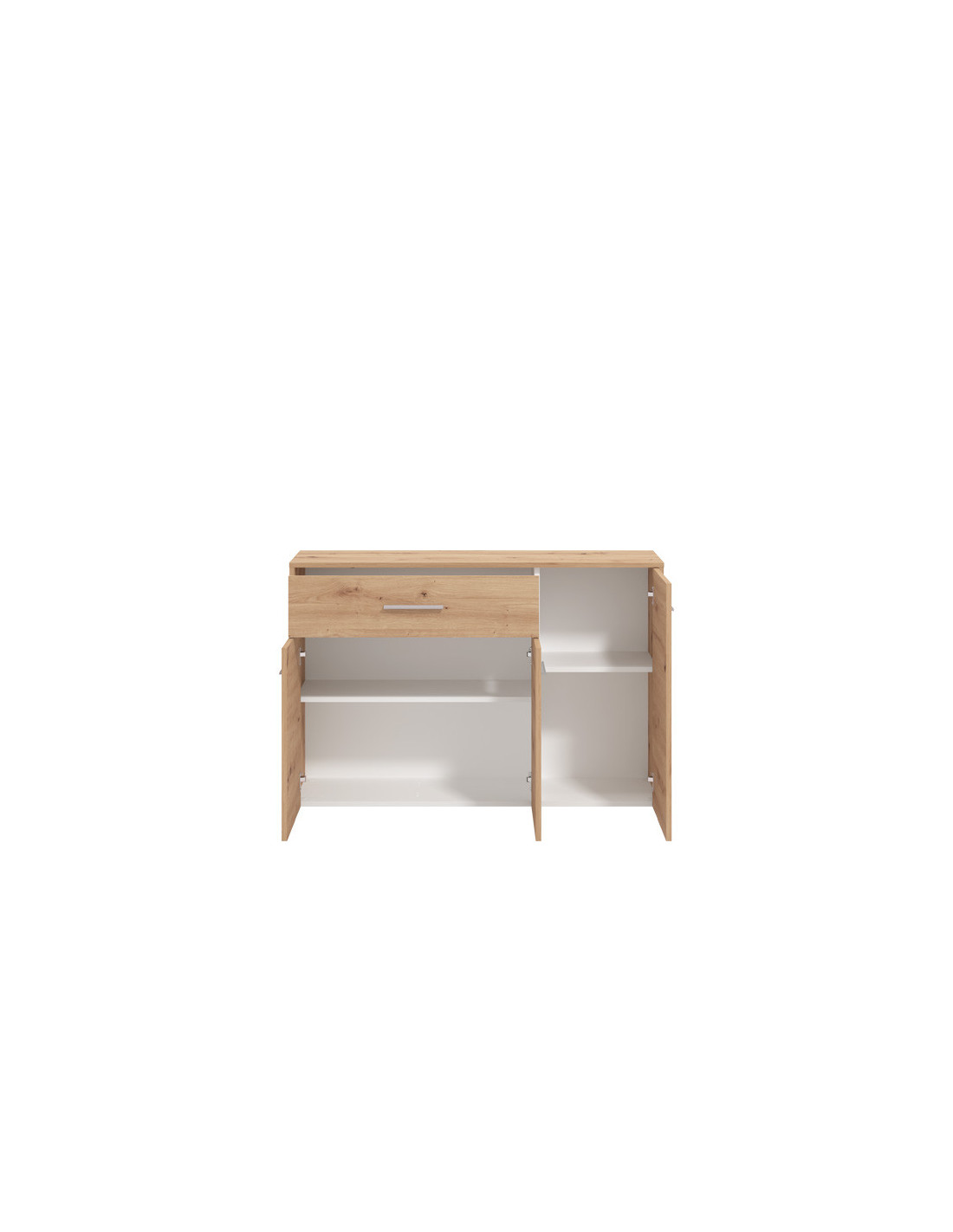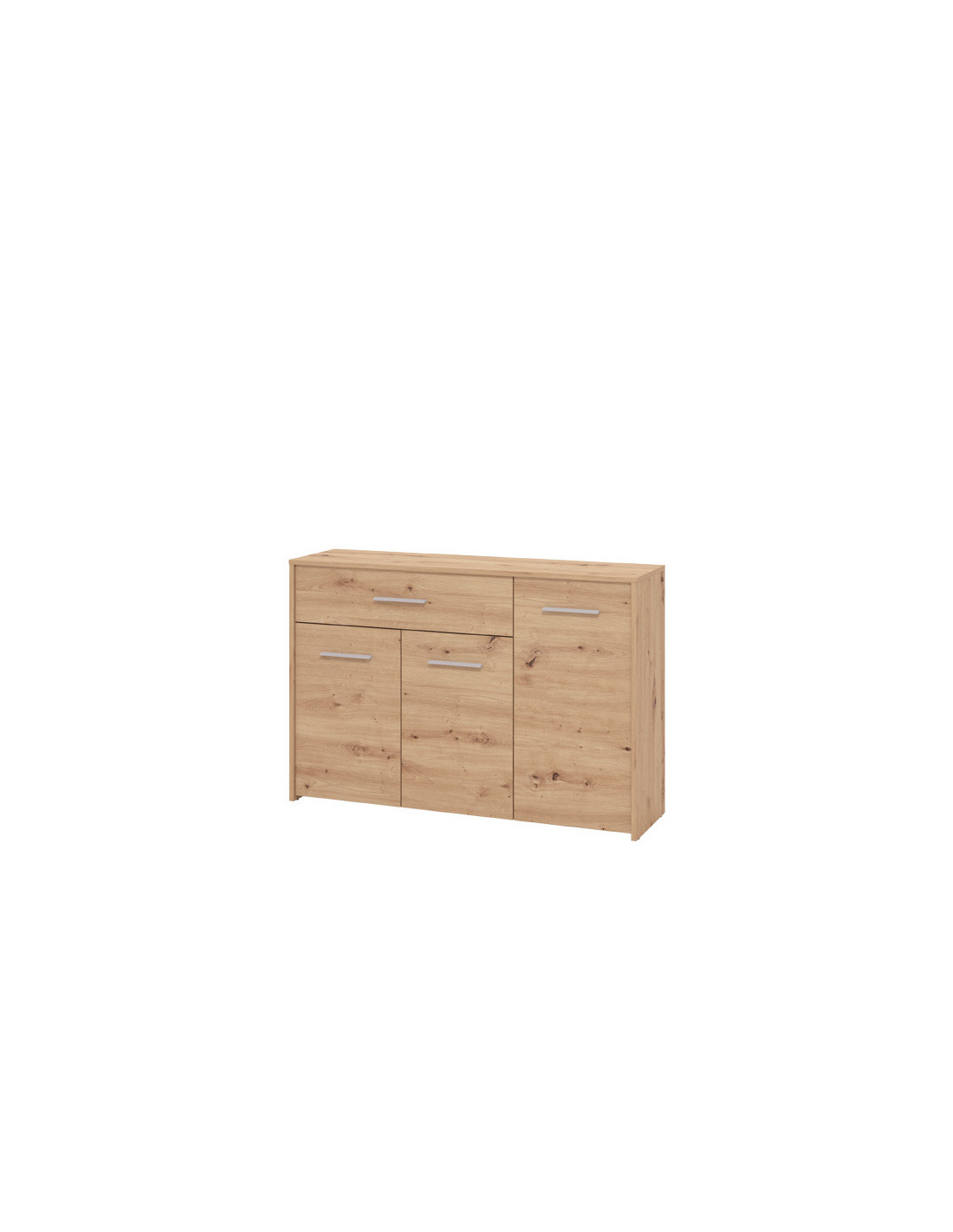 Komoda GARONA 3K1F, u dekoru artisan hrasta, doprinosi funkcionalnosti i eleganciji čitavog ambijenta. Odlično raspoređen upotrebni prostor ove komode čine dva zatvorena dijela sa policom sa lijeve i desne strane, kao i tri praktične ladice u središnjem dijelu.