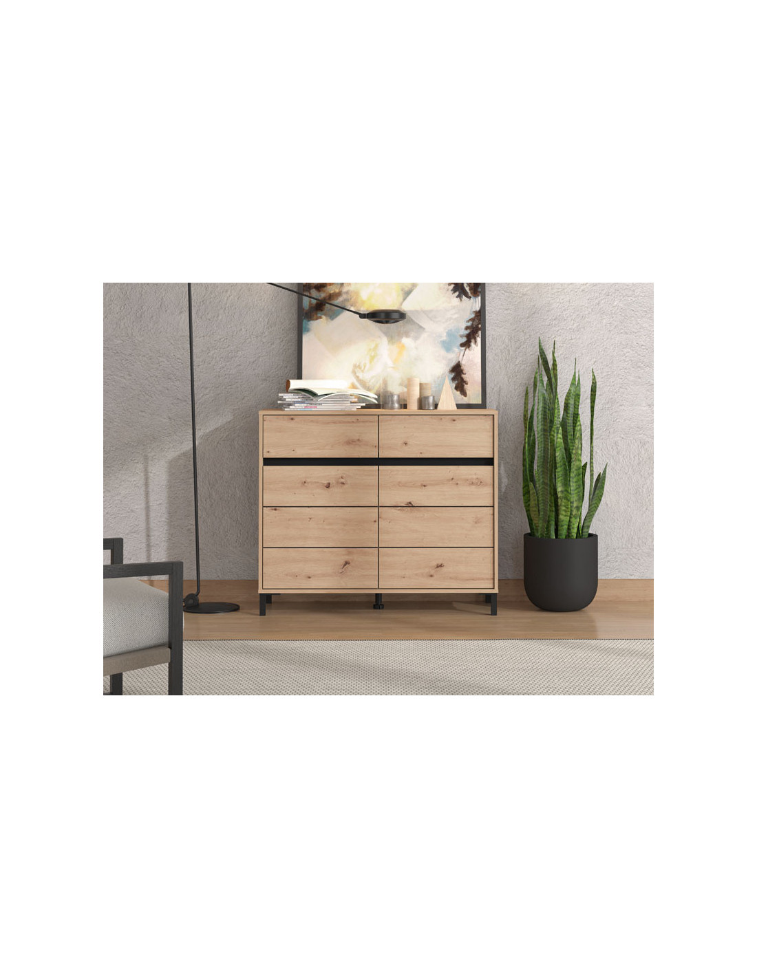 Komoda MARRON 106 2K2F2V u kombinaciji artisan hrastovog dekora sa crnom mat folijom, funkcionalan je komad namještaja koji je potreban svakom ambijentu doma. Odlično raspoređen upotrebni prostor ove komode čine dva zatvorena pregradna djela i dvije praktične ladice.