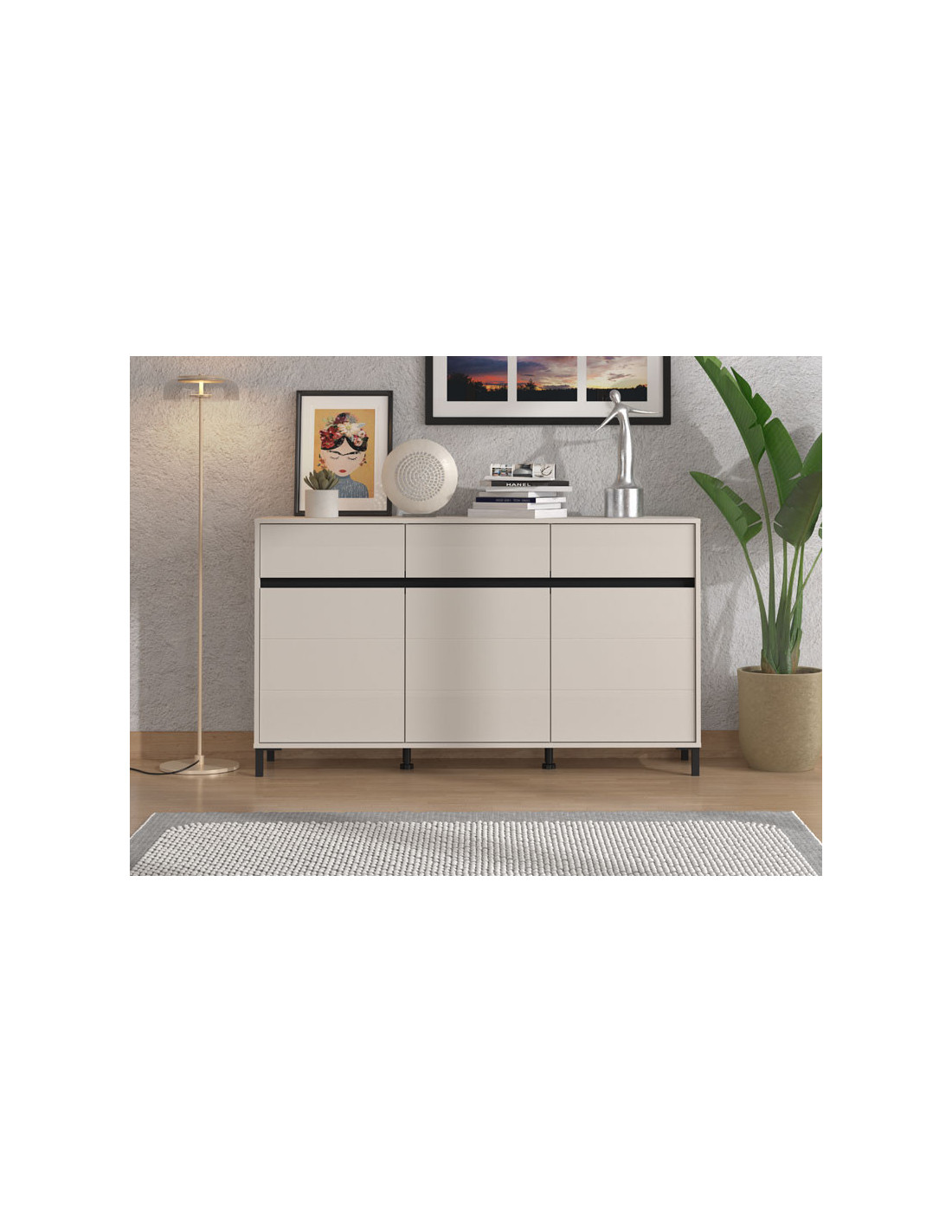 Komoda MARRON 157 3K3F3V u kombinaciji kašmir dekora i crne mat folije funkcionalan je komad namještaja koji je potreban svakom ambijentu doma. Odlično raspoređen upotrebni prostor ove komode čine tri zatvorena pregradna djela i tri praktične ladice.
