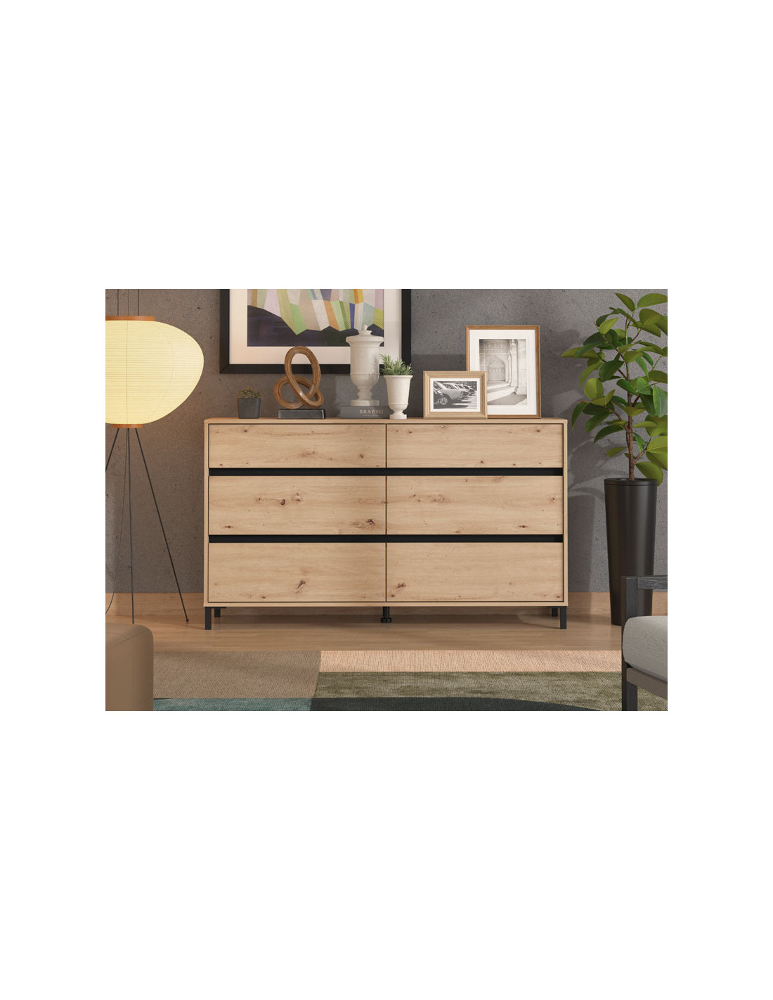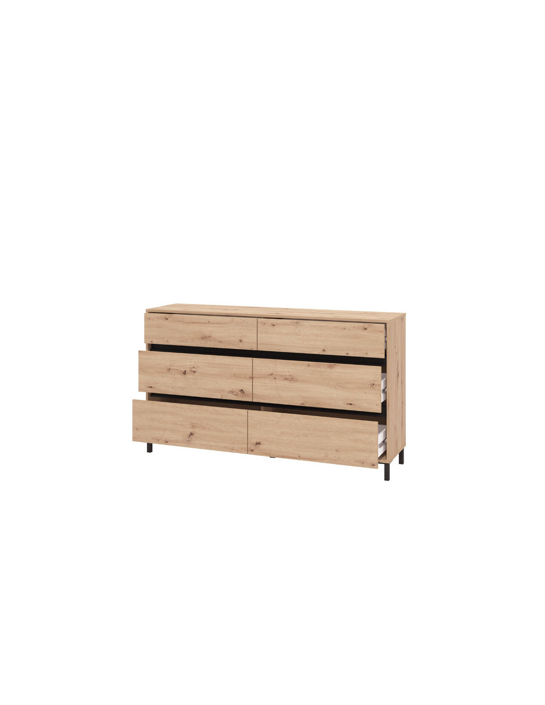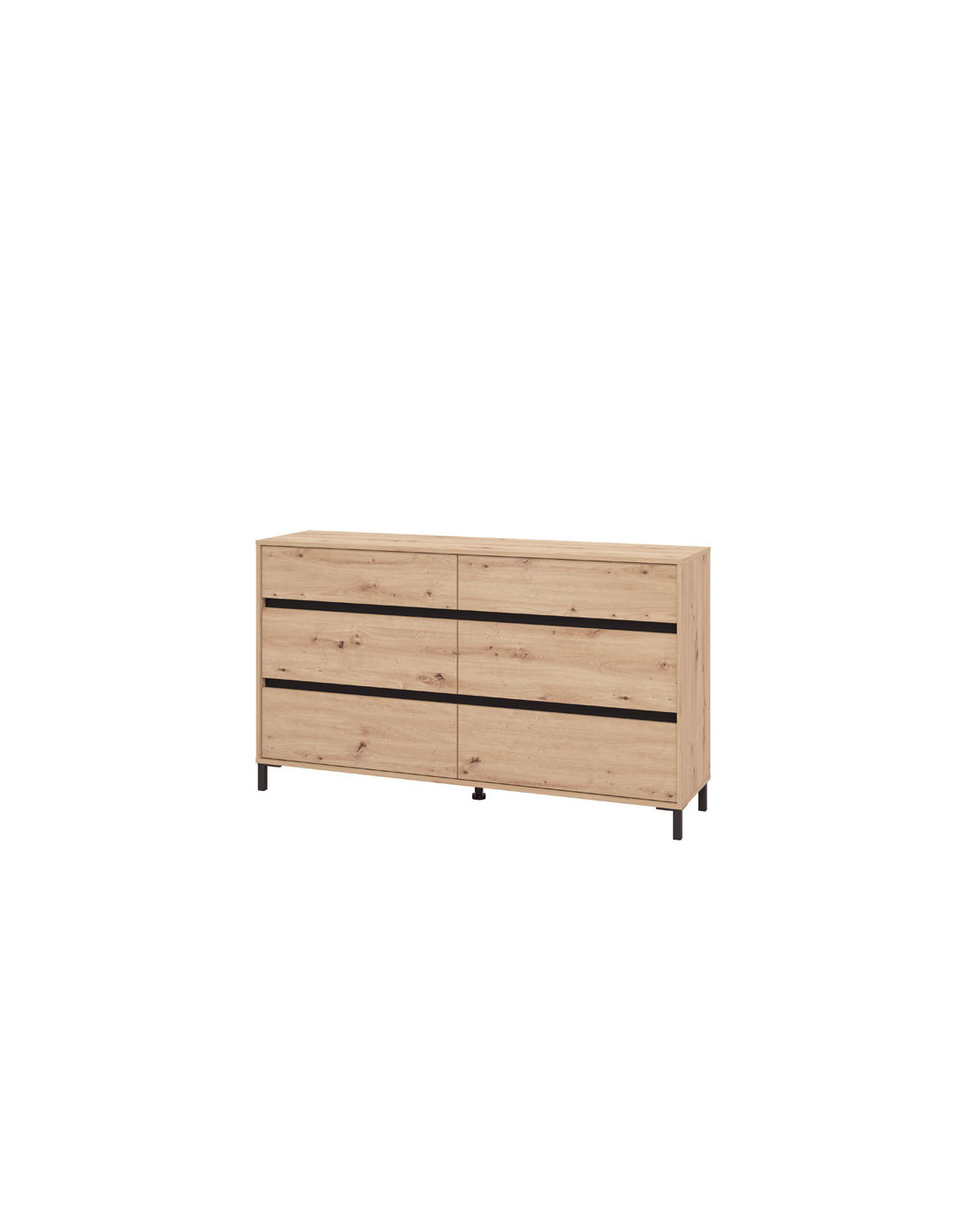 Komoda MARRON 157 6F u kombinaciji dekora artisan hrasta i crne mat folije, dizajnirana je tako da zahvaljujući upotrebnom prostoru koji pruža šest prostranih ladica, spada u elemente s velikom upotrebnom vrijednošću. Komoda MARRON 157 6F je pogodna za opremanje predsoblja, dnevne sobe, spavaće sobe, kao i blagovaonice.