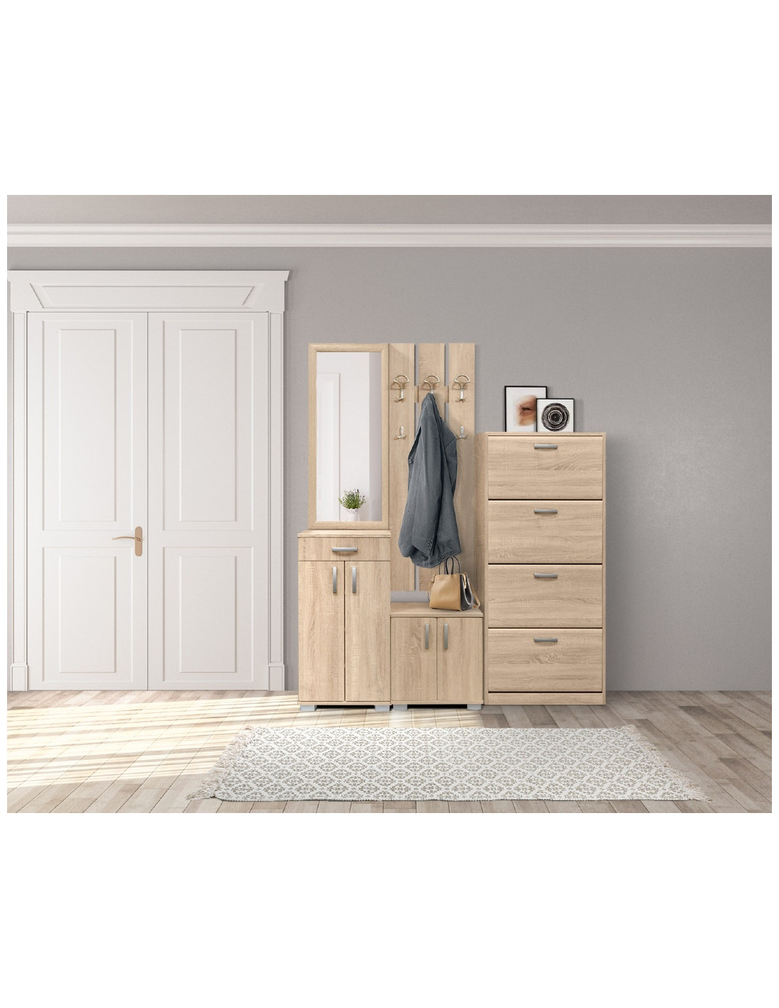 Dio seta APOLON predsoblja je komoda Apollo PA3 koja se zbog svojih dimenzija i funkcionalnosti savršeno uklapa kako u vaš predsoblje, tako i u druge manje prostore vašeg doma. Prostor za odlaganje je prostran, podijeljen s 2 police, a na vrhu se nalazi i ladica.