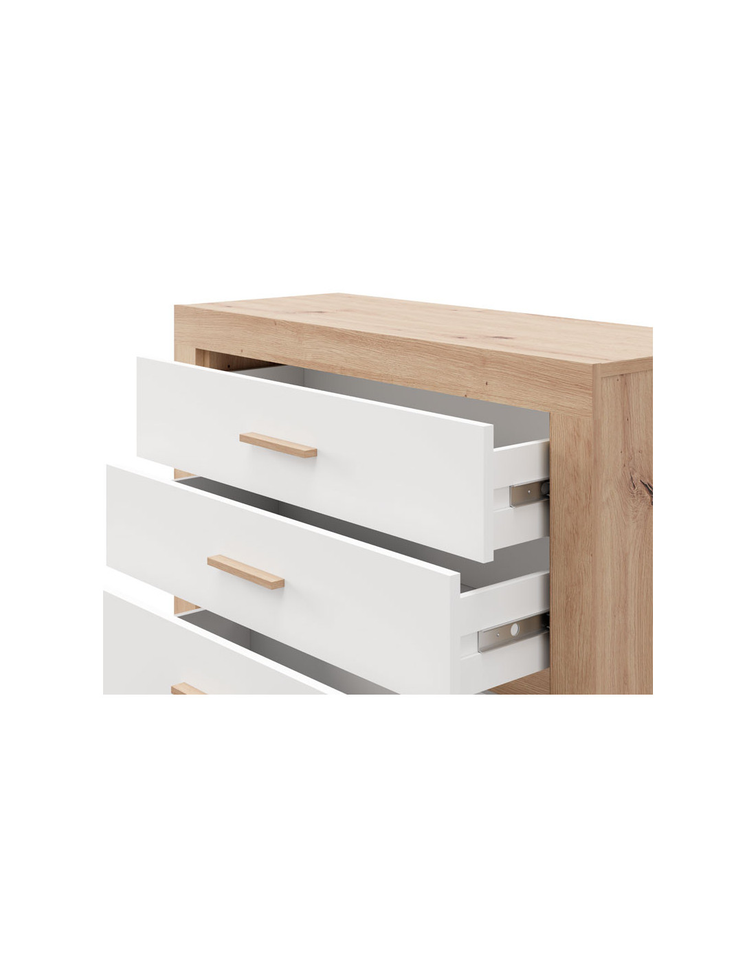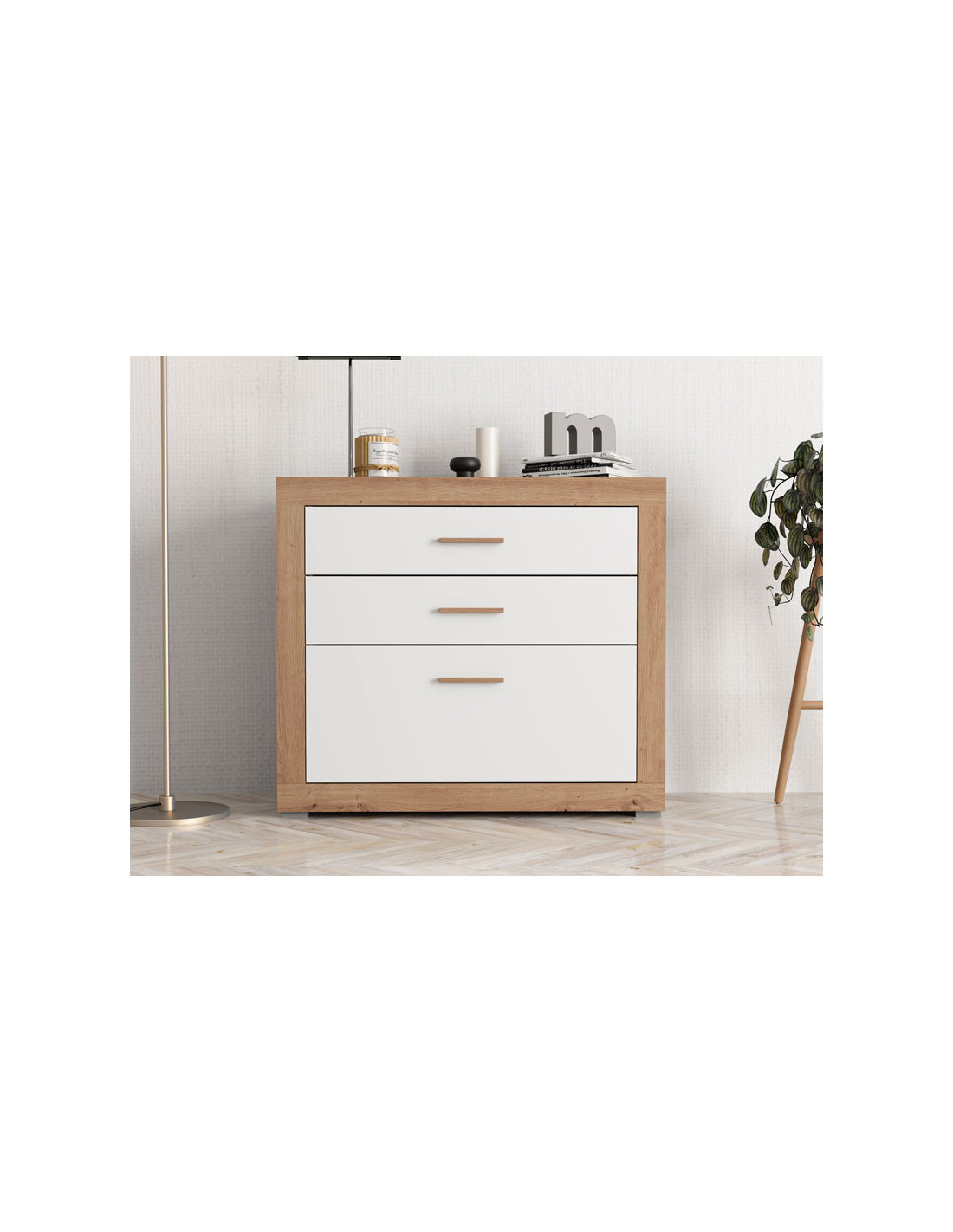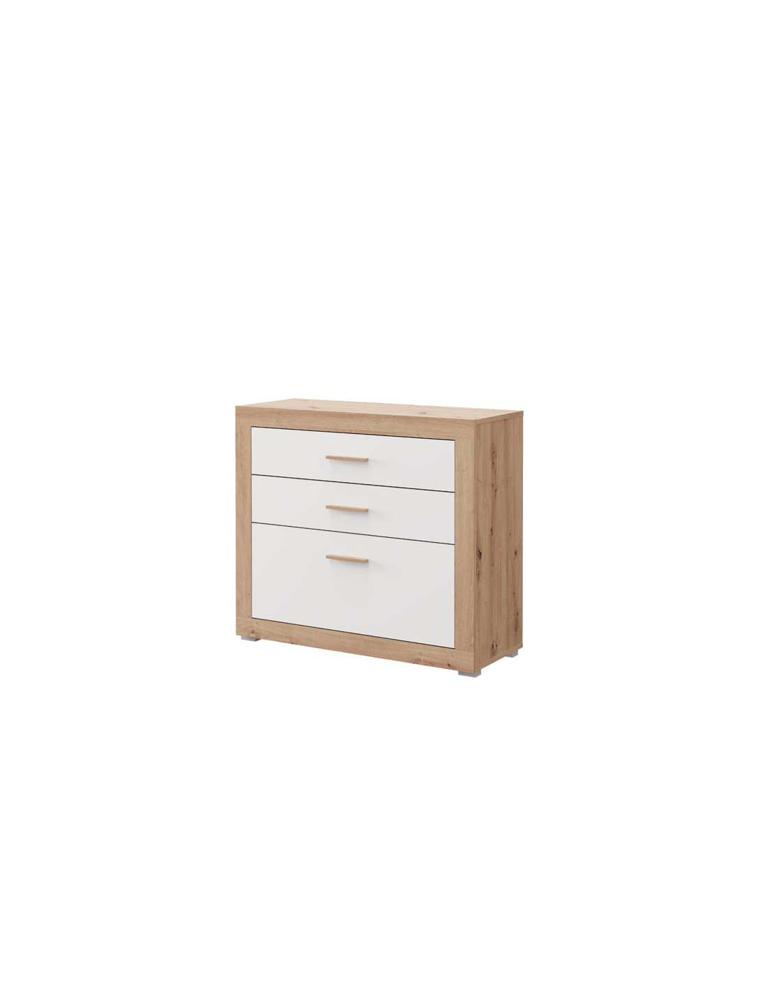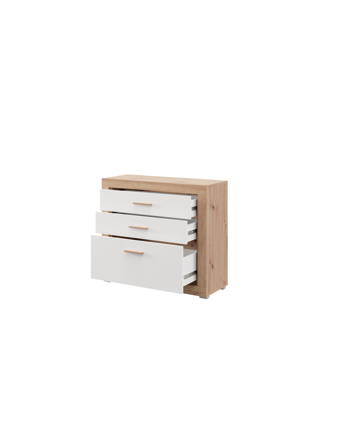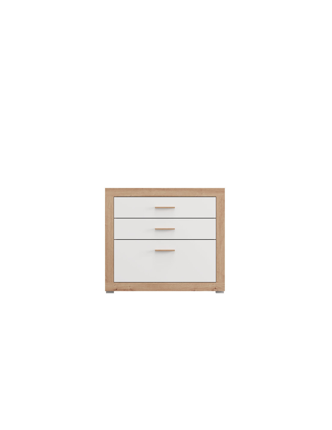 Komoda CARTENA 90 3F, izrađena u kombinaciji bijelog dekora, hrasta i folije od hrasta, doprinosi modernom i elegantnom izgledu spavaće sobe, naglašavajući kontrast materijala i preciznu geometrijsku liniju dizajna.