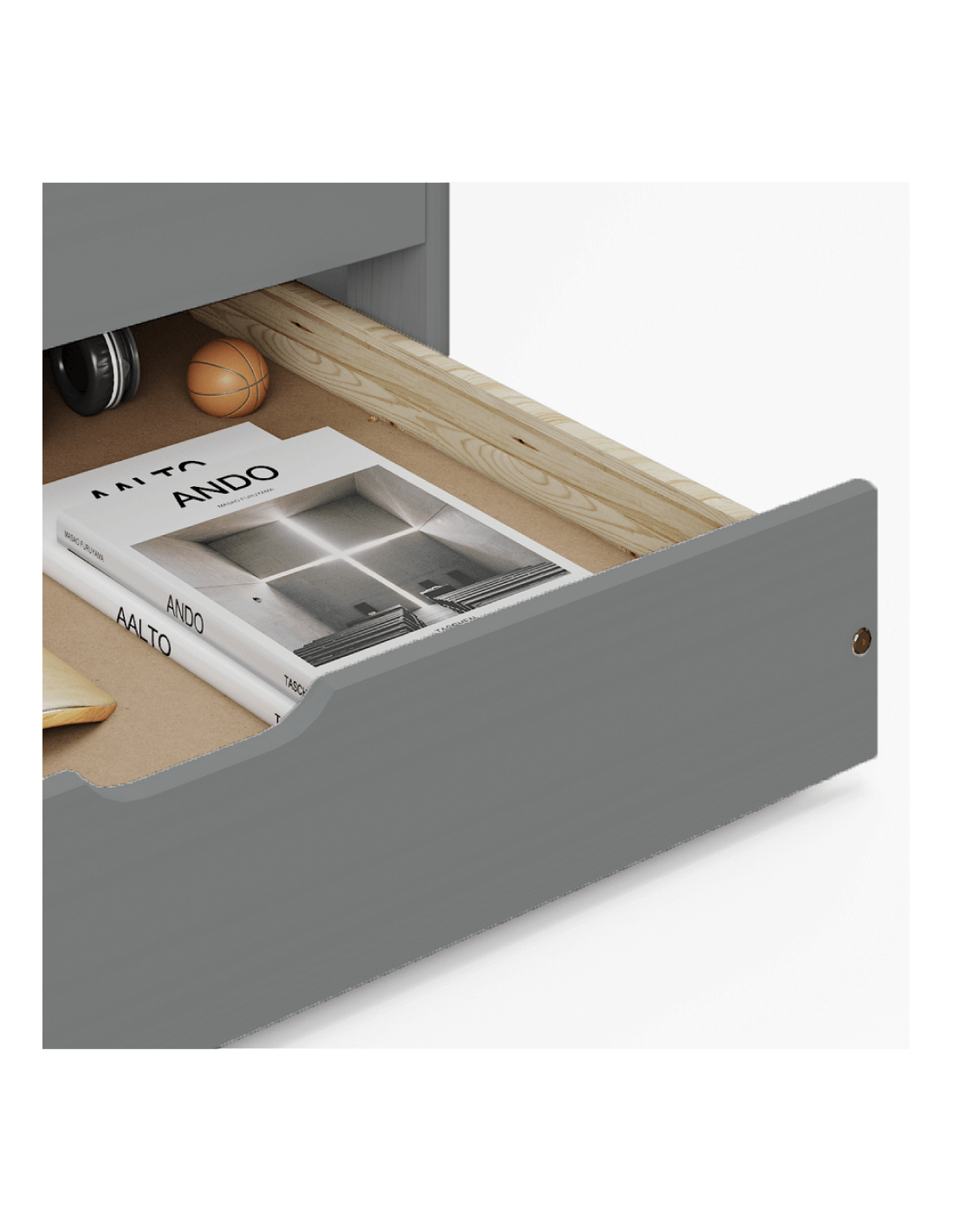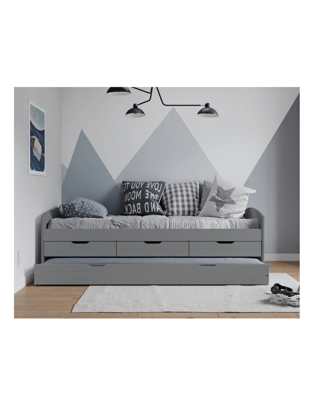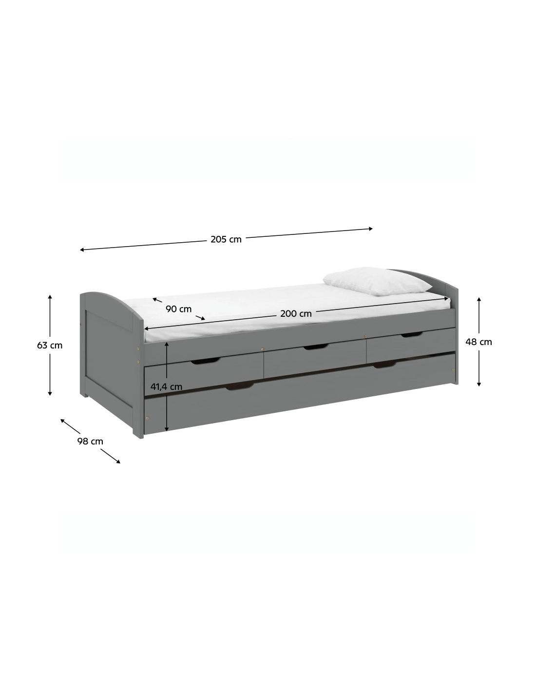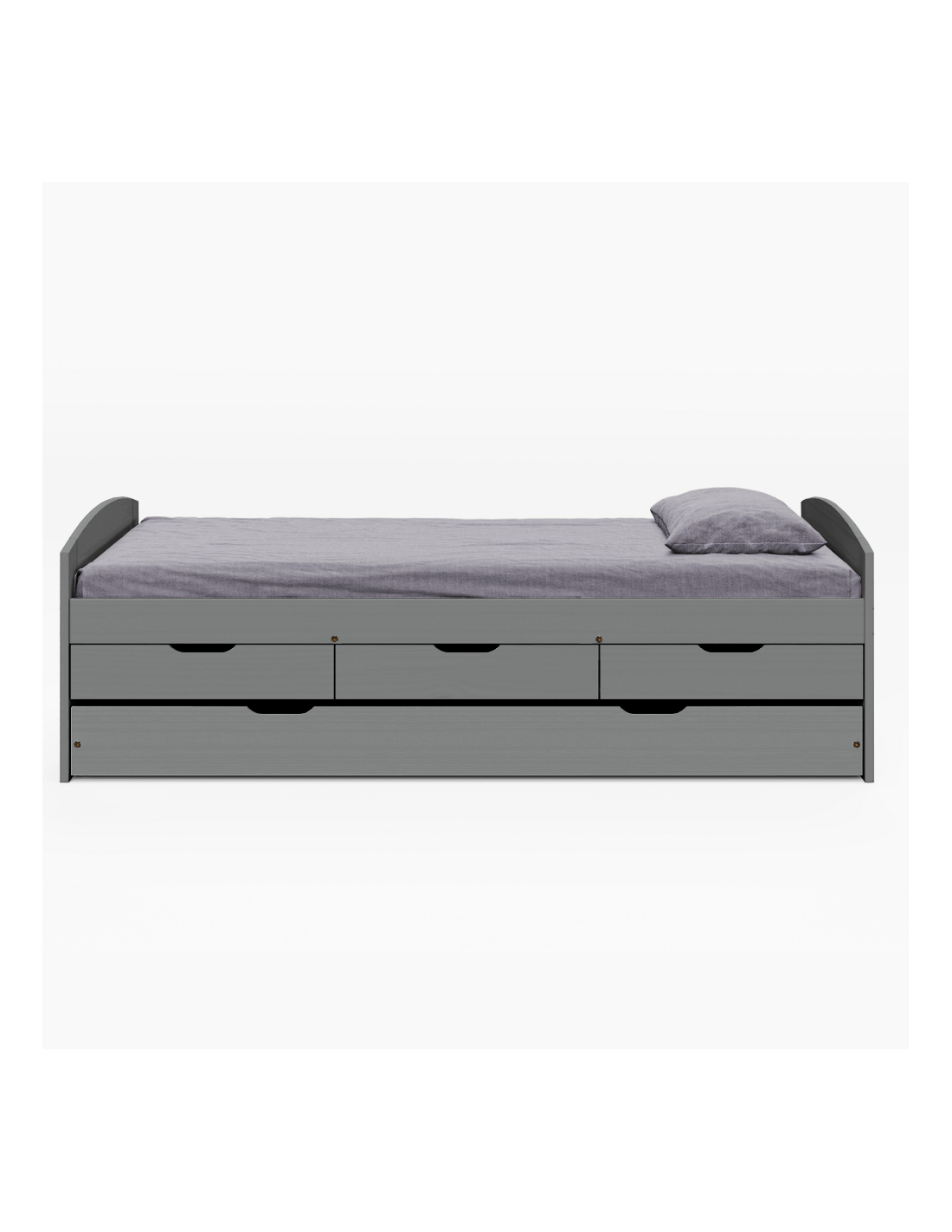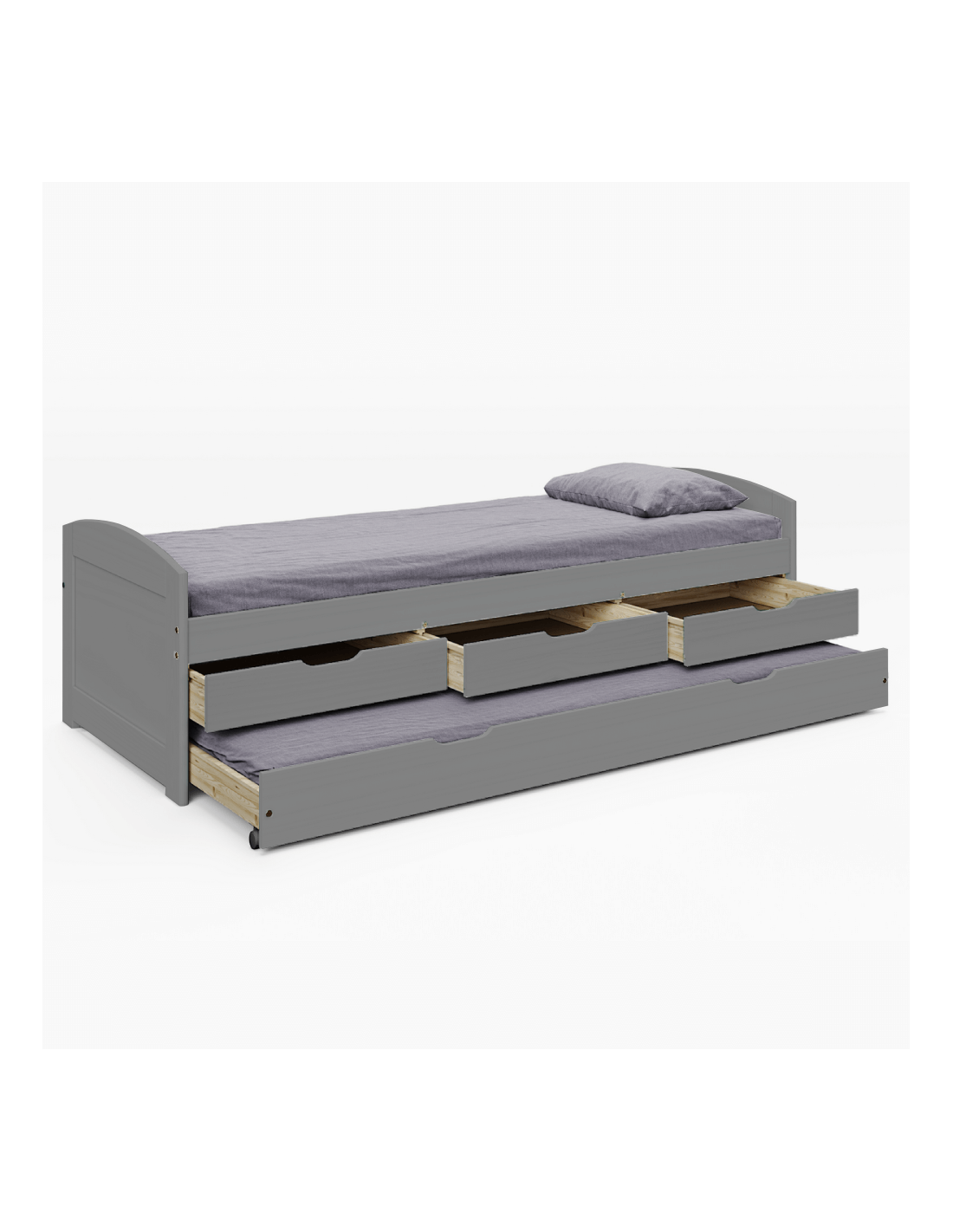 Krevet ima izvlačni pomoćni ležaj - donji dio kreveta na kotačićima. Uključuje i tri ladice koje će vam poslužiti za pohranu raznih stvari, a istovremeno će uštedjeti prostor. Konstrukcija kreveta izrađena je od lakiranog borovog masivnog drva u sivoj boji. Površina kreveta ima veličinu 90x200 cm. Krevet MARINELLA NEW karakterizira velika nosivost, koja je do 110 kg za svaki krevet. Preporučujemo kupnju madraca iz naše ponude dimenzija 90x200 cm, pomoćnog ležaja dimenzija 90x194 cm.