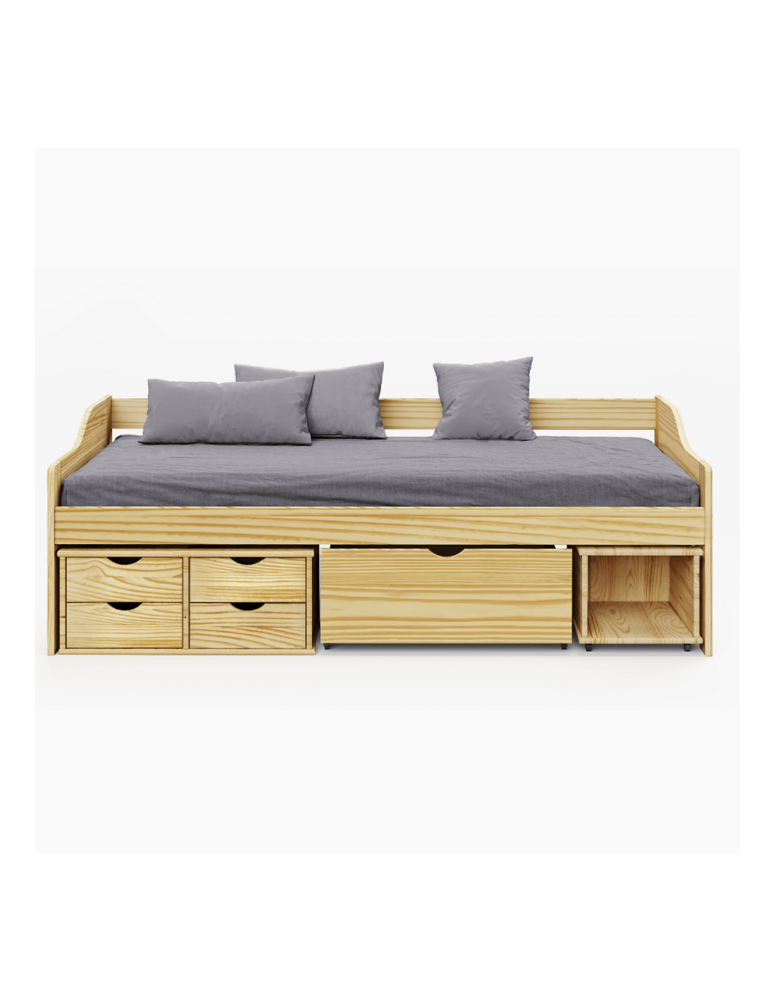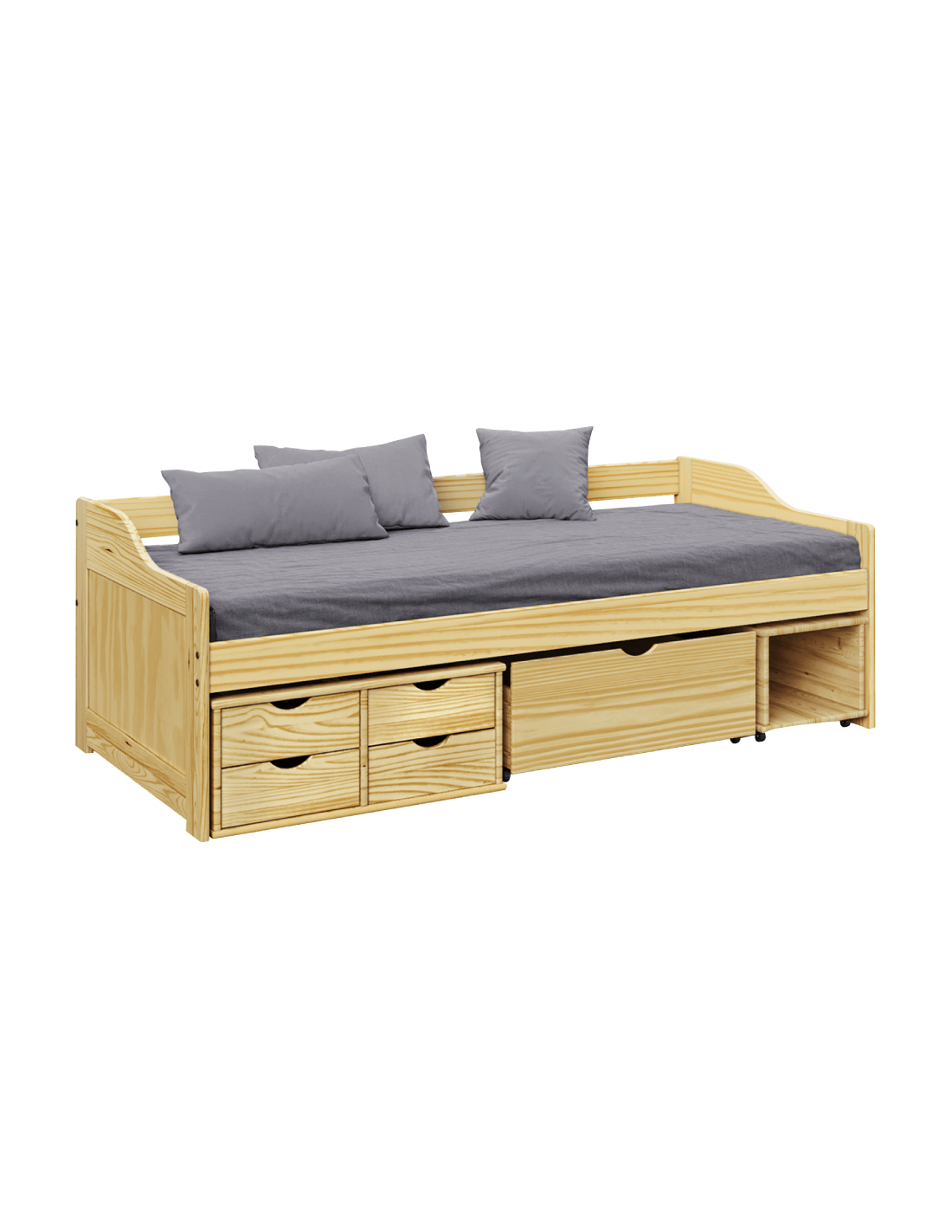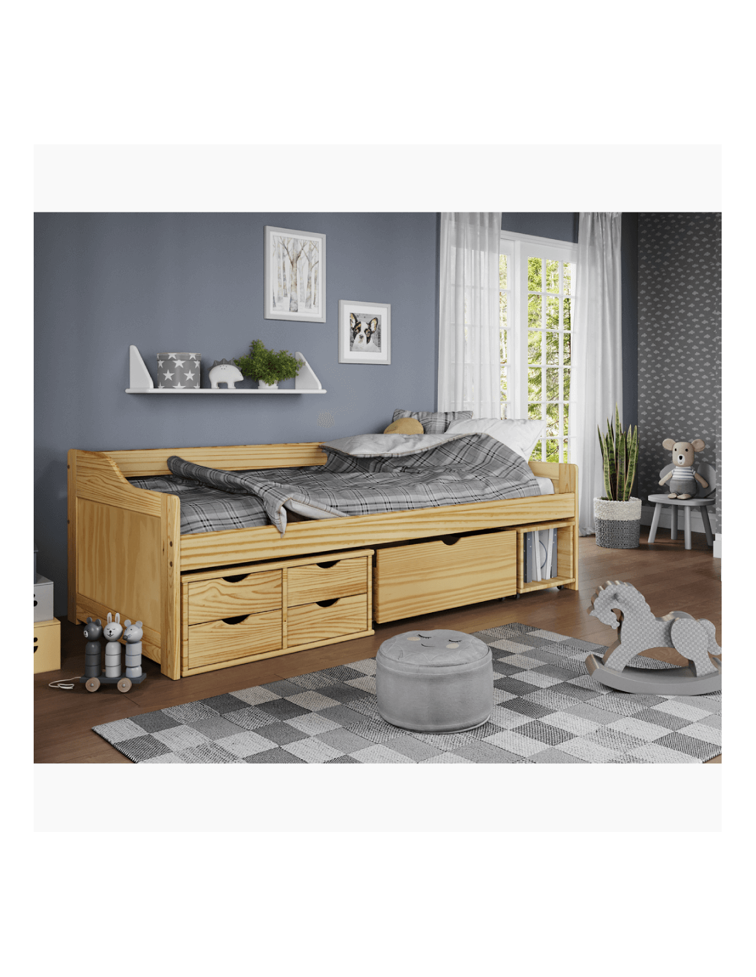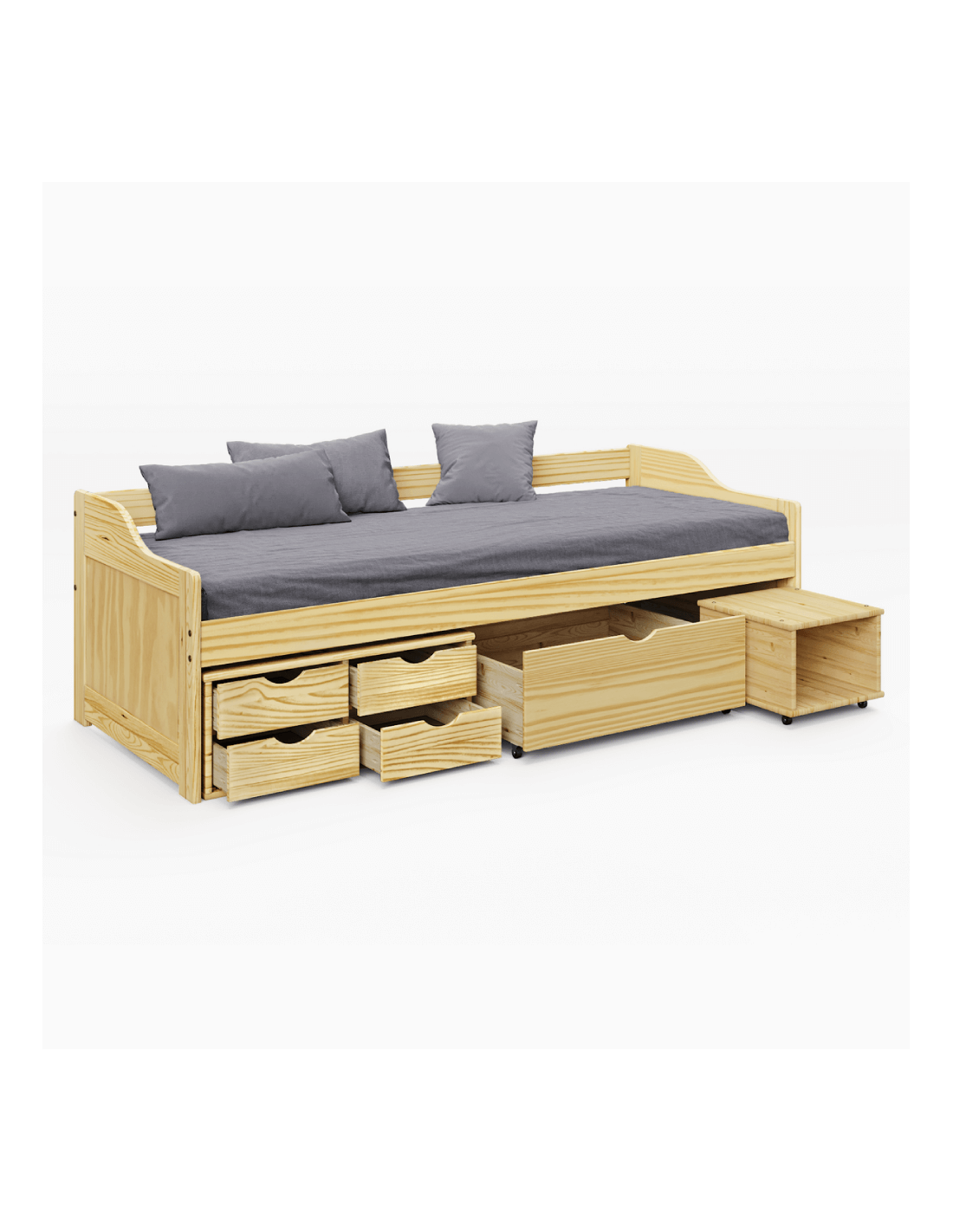 Nije to bilo kakav krevet, vaše će ga dijete doživljavati kao svoj mali svijet. Dječaci će odmah postati kapetan vlastitog broda, a djevojčice princeze u vlastitom kraljevstvu. MAXI NEW višenamjenski krevet namijenjen je dječjoj ili studentskoj sobi. Ima puno prostora za pohranu. Krevet uključuje četiri male ladice, jednu veću ladicu na kotačima i jednu kutiju za pohranu na kotačima. Kutija za pohranu po potrebi lako može zamijeniti noćni ormarić. Krevet je izrađen od visokokvalitetnog lakiranog masivnog drva, unoseći dašak prirode u sobu. Dolazi s letvičastom podnicom, ali bez madraca, koji možete naručiti iz naše ponude. Pravim odabirom osigurat ćete svom djetetu kvalitetan san i vrijedan odmor, tako da će ujutro biti puno energije, a lice puno osmijeha.