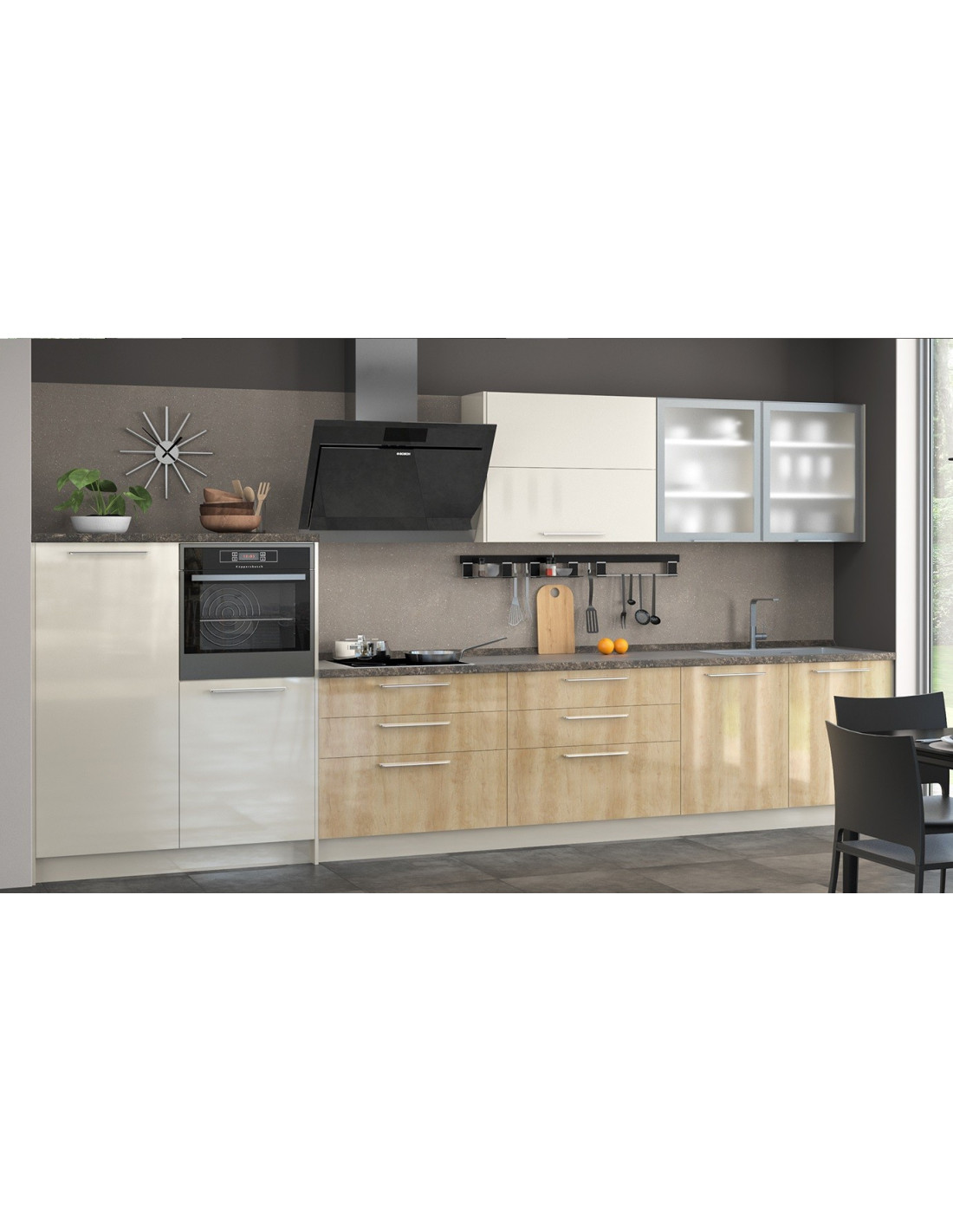 Kuhinja Lira lakirana UV lakom visokog sjaja u kombinaciji bež ili bijele boje sa dekorima drveta. Ova kuhinja predstavlja savršenu ravnotežu između atraktivnosti, funkcionalnosti