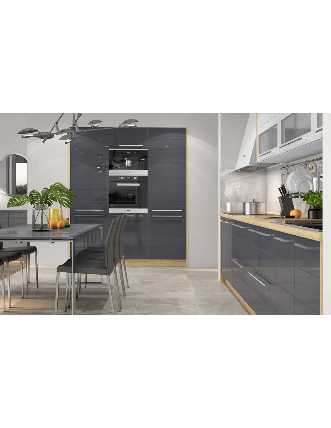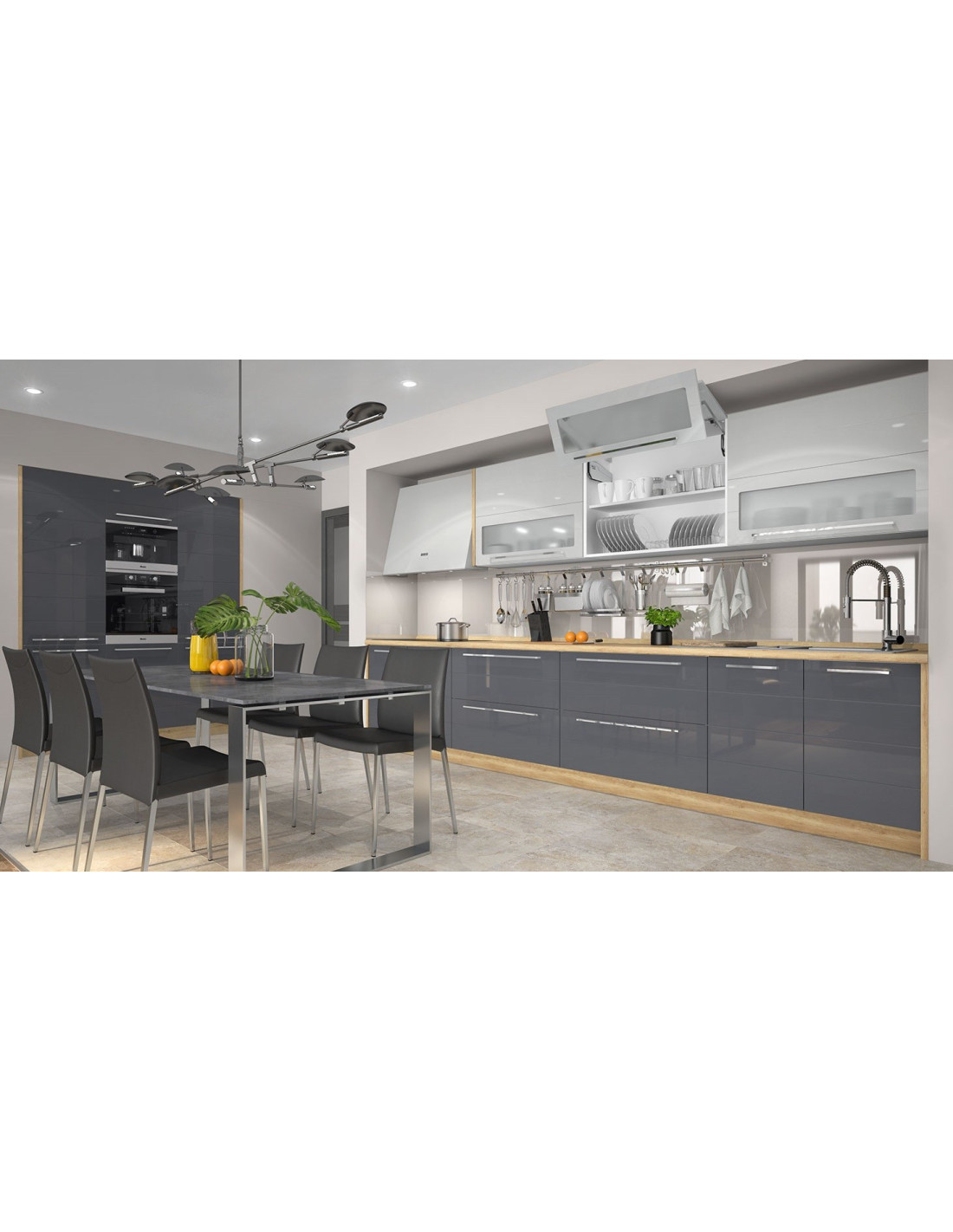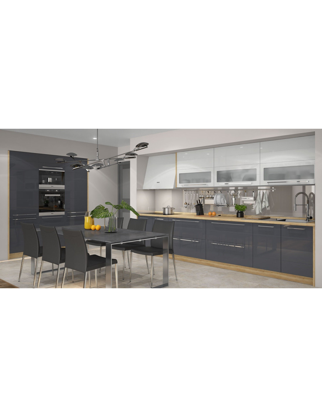 Kuhinja Highline sa frontovima od medijapana u Onyx sivoj boji u visokom sjaju. Frontovi u atraktivnim bojama daju kuhinji jednostavan i moderan izgled. Stakleni frontovi su izrađeni od kaljenog stakla. Duboke ladice omogućuju bolju organizaciju posuđa raznih veličina.