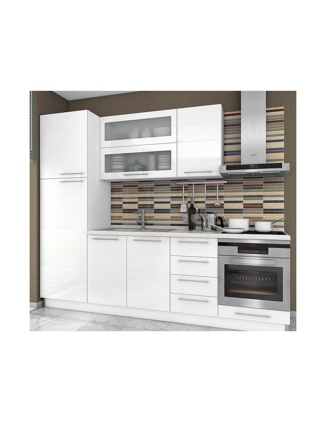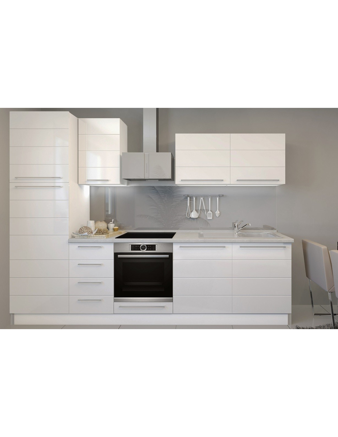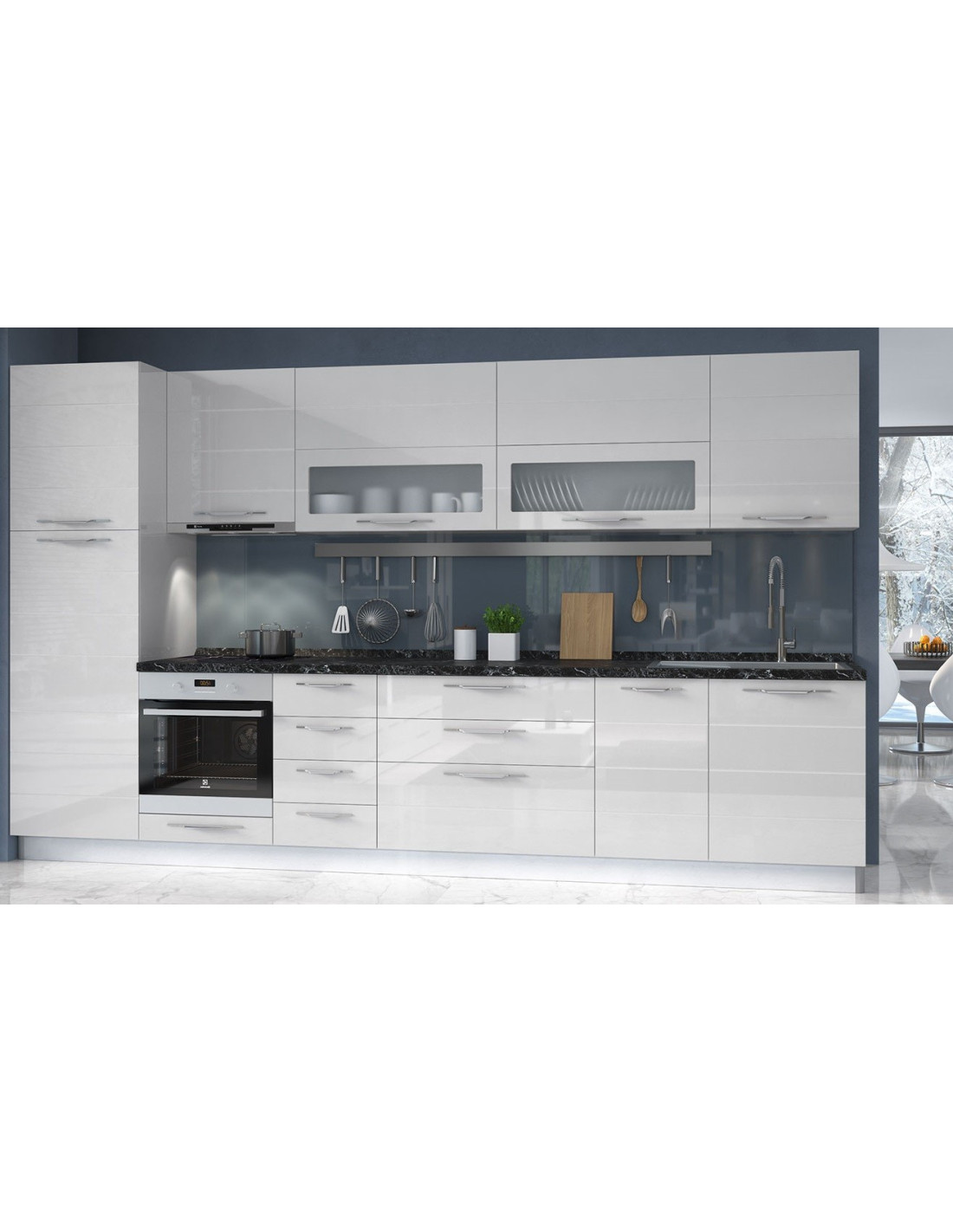 Kuhinja Highline sa frontovima od medijapana u Onyx sivoj boji u visokom sjaju. Frontovi u atraktivnim bojama daju kuhinji jednostavan i moderan izgled. Stakleni frontovi su izrađeni od kaljenog stakla. Duboke ladice omogućuju bolju organizaciju posuđa raznih veličina.