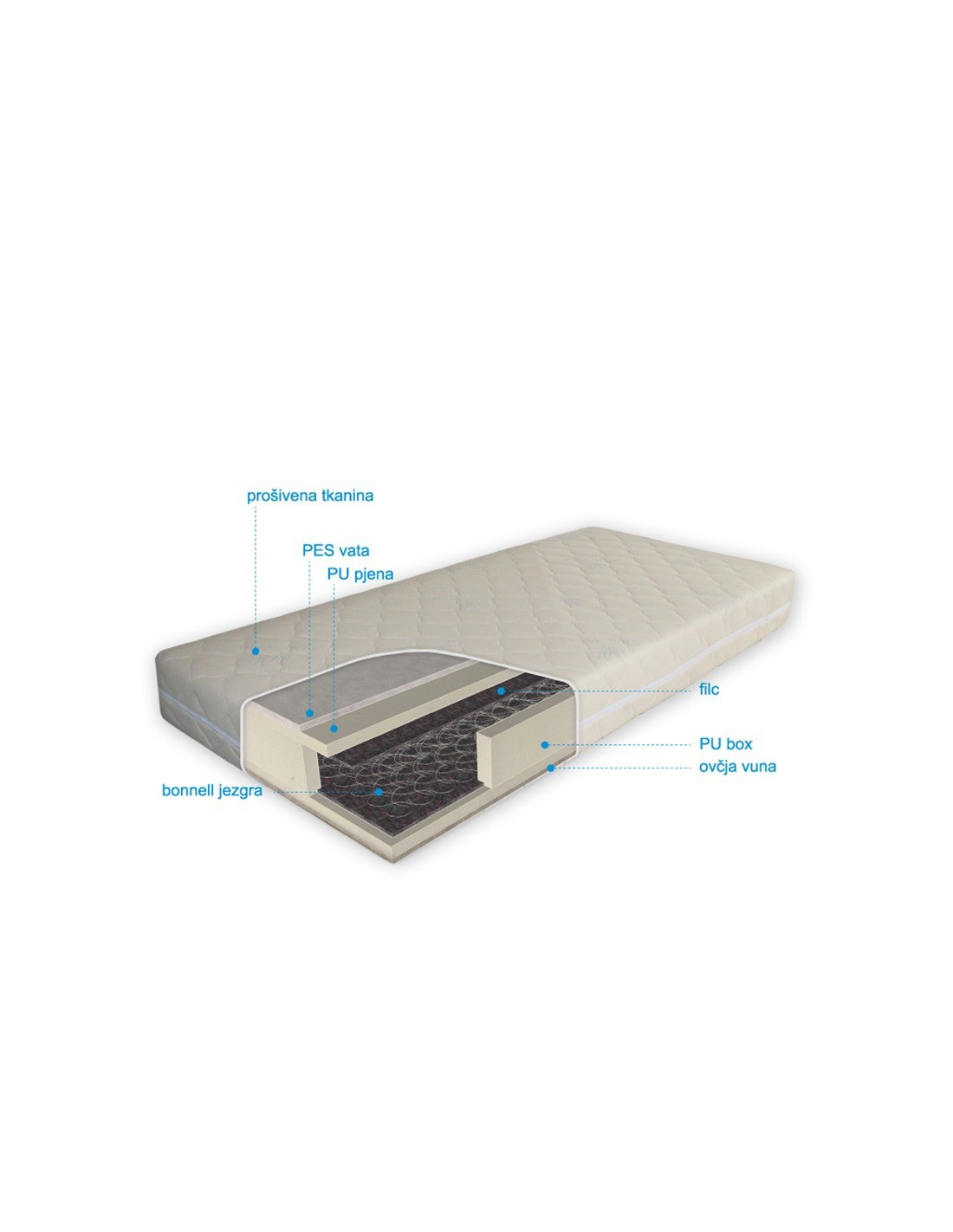 Madrac FRESH u svojoj osnovi ima bonnell opružnu jezgru na kojoj su obostrano postavljene plohe posebno obrađenog termofiksiranog filca otpornog na temperature i klimatske promjene. Bonnell jezgra se prilagođava stupnju opterećenja, a ujedno omogućuje nesmetano strujanje zraka kroz samu unutrašnjost madraca prilikom korištenja. Filc omogućava elastičnost ali istovremenao i čvrstoću i dugotrajnost jezgre. Udobnost madraca FRESH jamči sloj od 3cm visokokvalitetne PU pjene, a sloj PES vate na ljetnoj strani madraca osigurava svježinu i osjećaj hlađenja tjekom ljetnih noći, dok sloj ovčje vune u zimskim noćima daje osjećaj topline i ugode. Madrac FRESH Vam omogućava udobnost kod spavanja, a kad se probudite bit ćete svježi i napunjenih baterija, spremni za dnevne obaveze.