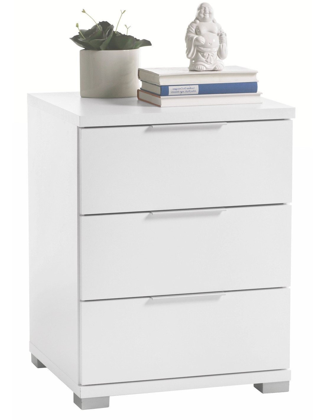 Spavaću sobu nadopunite praktičnim i modernim noćnim ormarićima koji će s krevetom činiti savršenu cjelinu. Noćni ormarić "Nako" oduševljava svojim modernim dizajnom. Izrađen je od kvalitetnog drvenog materijala u bijeloj boji. Sadrži 3 praktične ladice koje će Vam dobro doći za odlaganje stvari za koje želite da su Vam uvijek nadomak ruke. Cjelokupnom dizajnu pridonose duge ručke i četvrtaste noge u boji srebra. Priuštite si ovaj atraktivan noćni ormarić, dimenzija 46 x 61 x 42 cm i osigurajte mjesto za svoje naočale, knjige i budilicu.