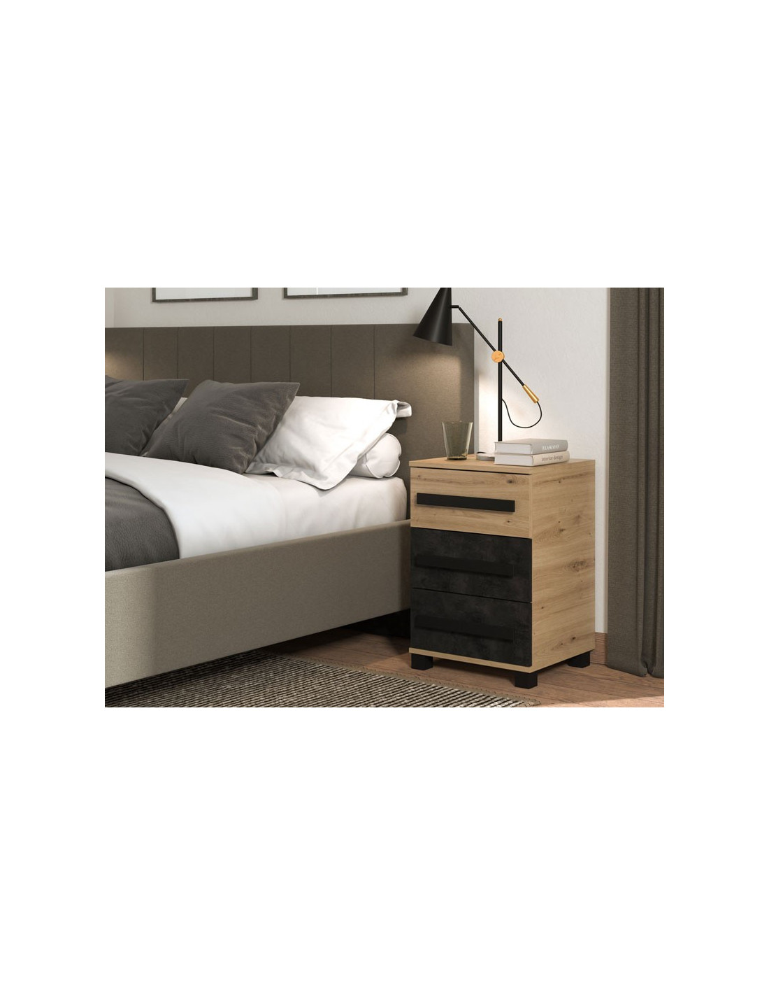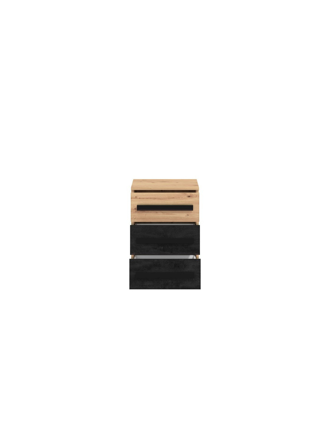 Noćni ormarić MADEIRA NO3F, u kombinaciji artisan dekora hrasta i dekora karbona, dio je kolekcije elemenata spavaće sobe. Može se samostalno pozicionirati u modernom ambijentu spavaće sobe, ali i s ostalim elementima spavaće sobe MADEIRA s kojima čini jedinstvenu interijersku cjelinu. Ima tri funkcionalne ladice za odlaganje.