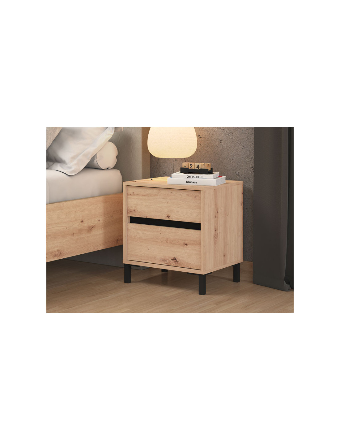 Noćni ormarić MARRON NO2F u kombinaciji artisan hrastovog dekora i crne mat folije, moderno je dizajniran i autentičan komad namještaja koji je neophodan i vrlo praktičan element u svakom ambijentu spavaće sobe. Upotrebni prostor noćnog ormarića čine dvije praktične ladice.
