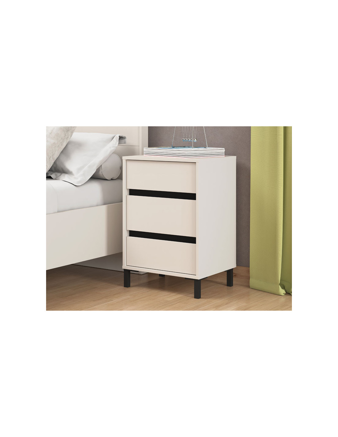 Noćni ormarić MARRON NO3F u kombinaciji kašmir dekora i crne mat folije, moderno je dizajniran i autentičan komad namještaja koji je neophodan i vrlo praktičan element u svakom ambijentu spavaće sobe. Upotrebni prostor noćnog ormarića čine tri praktične ladice.