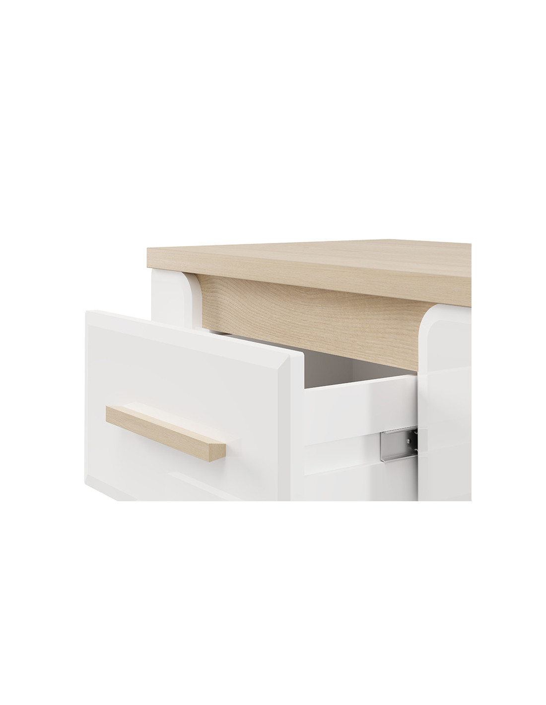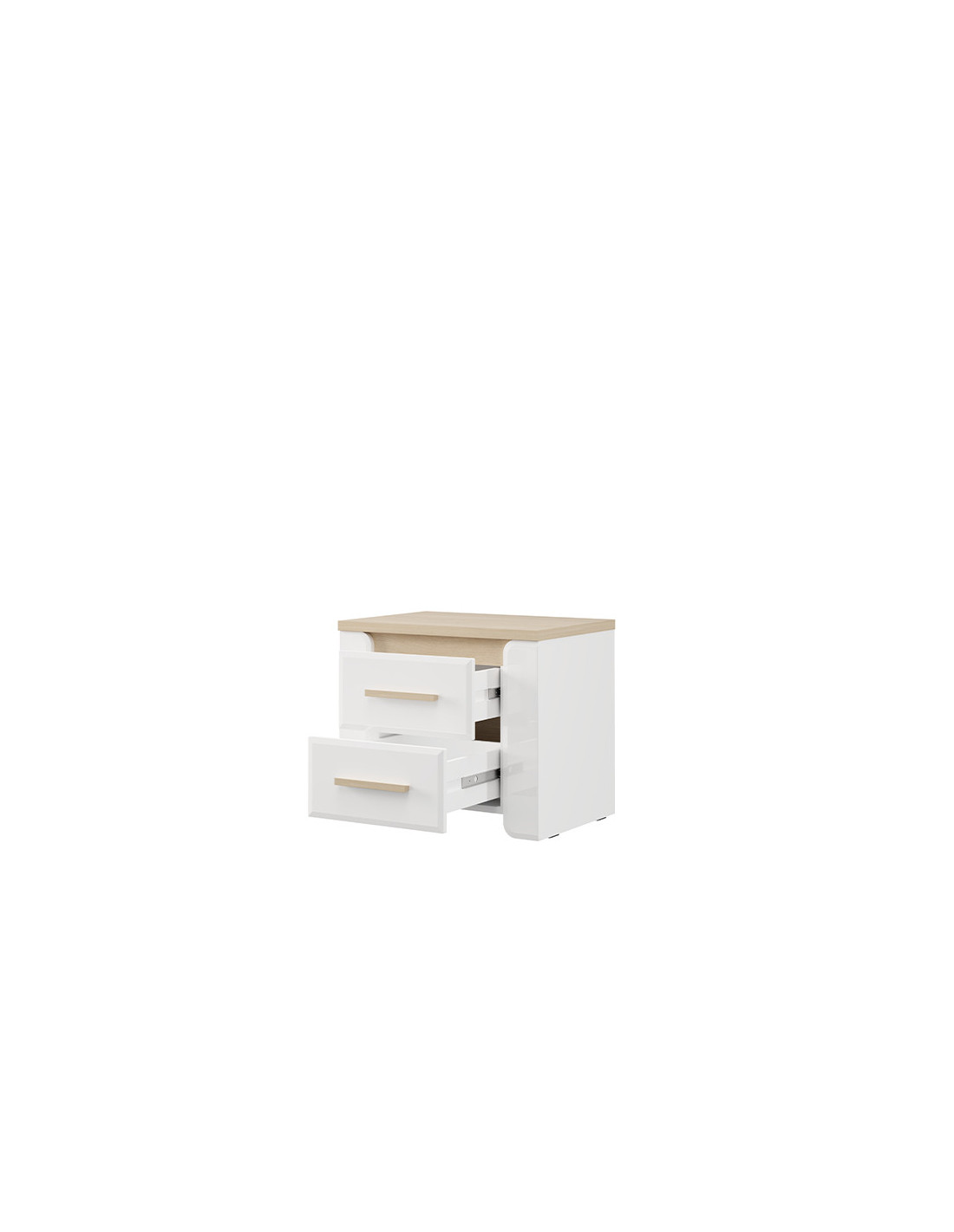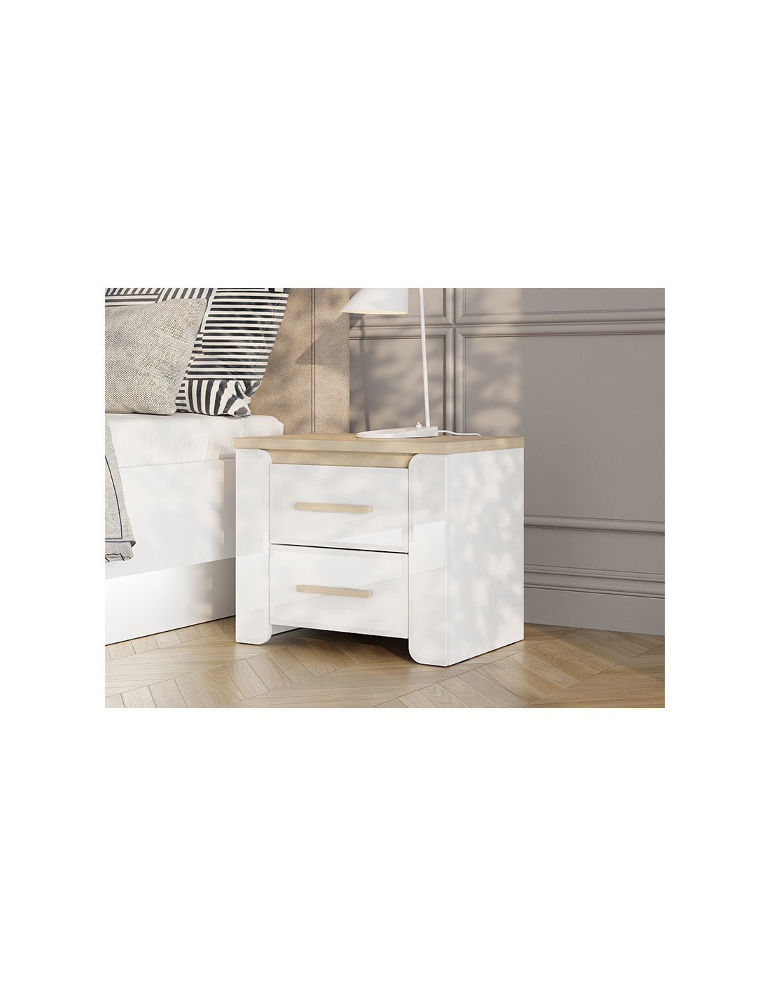 Noćni ormarić ABERDEEN NO2F, izrađen u kombinaciji neprozirno bijele, svijetlog port hrasta i bijele lakirane folije, doprinosi modernom i elegantnom izgledu spavaće sobe, a istovremeno pruža funkcionalan i čist prostor uz krevet.