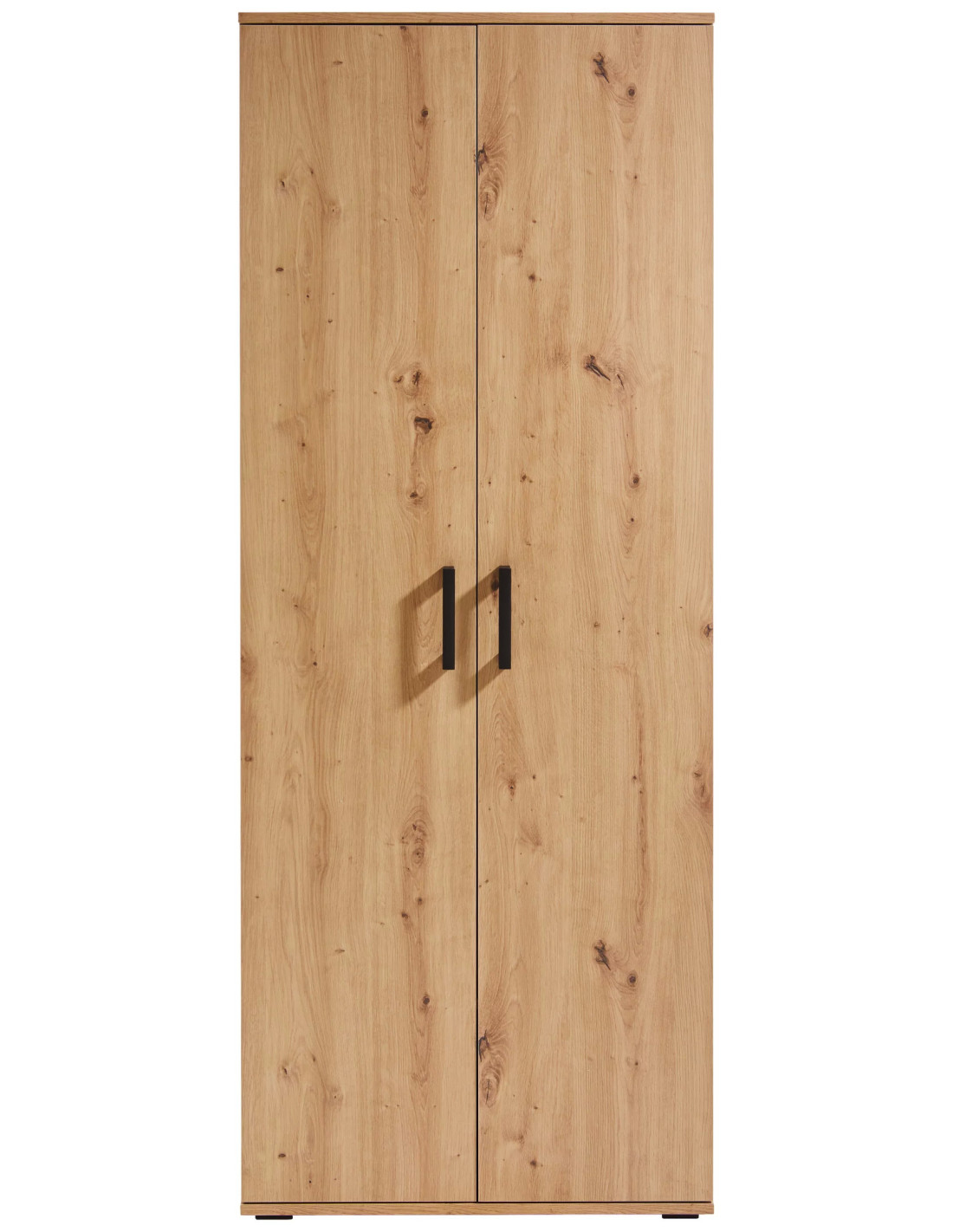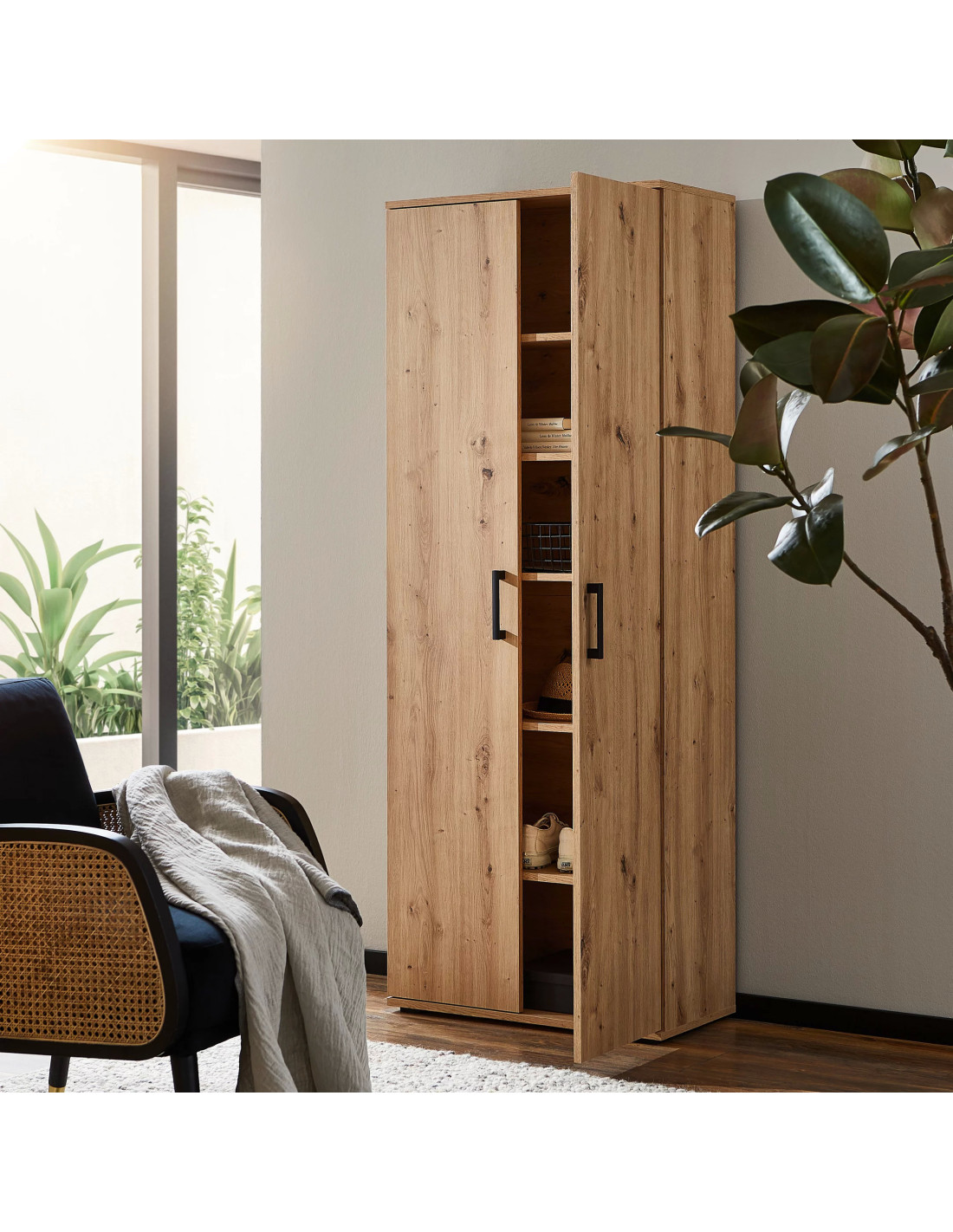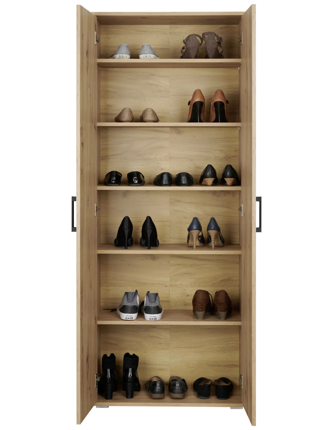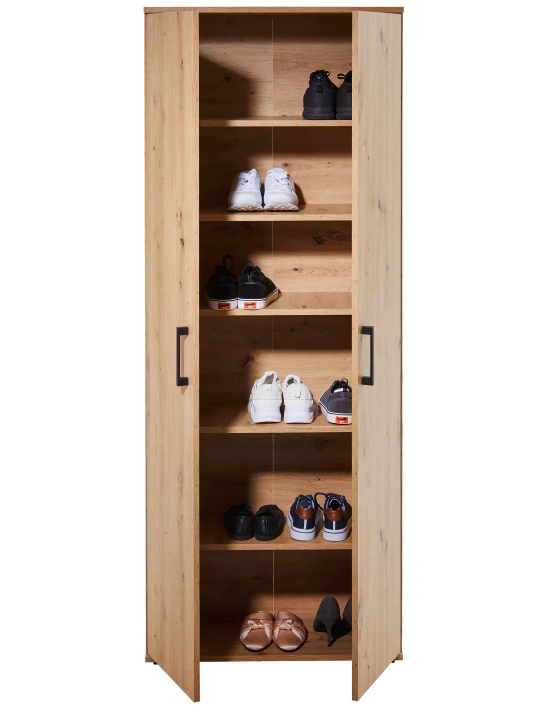 Neka Vas veličina hodnika ili predsoblja ne ograničava kod odabira namještaja koji će istaknuti Vaš stil, ali će se istovremeno i savršeno uklopiti u prostor. Kod dizajna predsoblja bitnu ulogu ima organizacija i urednost koju možete postići pomoću ovog višenamjenskog ormara "Alex". Dizajn u boji hrasta moći ćete uklopiti sa drugim namještajem i stilom u Vašem domu. Cjelokupnom dizajnu pridonose i zaobljene ručke u crnoj boji te četvrtaste crne noge, visine cca 1,5 cm koje osiguravaju stabilnost. Osim dizajna kod odabira namještaja važna je i praktičnost. Ovaj ormar u kojem možete organizirati Vašu obuću sadrži 5 polica, debljine materijala cca 16 mm i maksimalne opteretivosti po polici do cca 6 kg. Priuštite si kvalitetu i sjajan dizajn uz ovaj višenamjenski ormar.