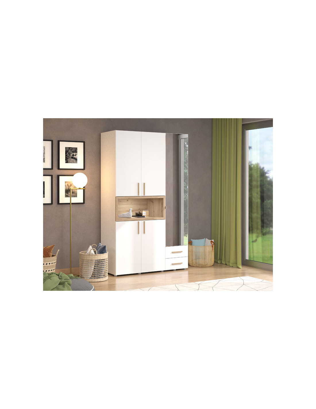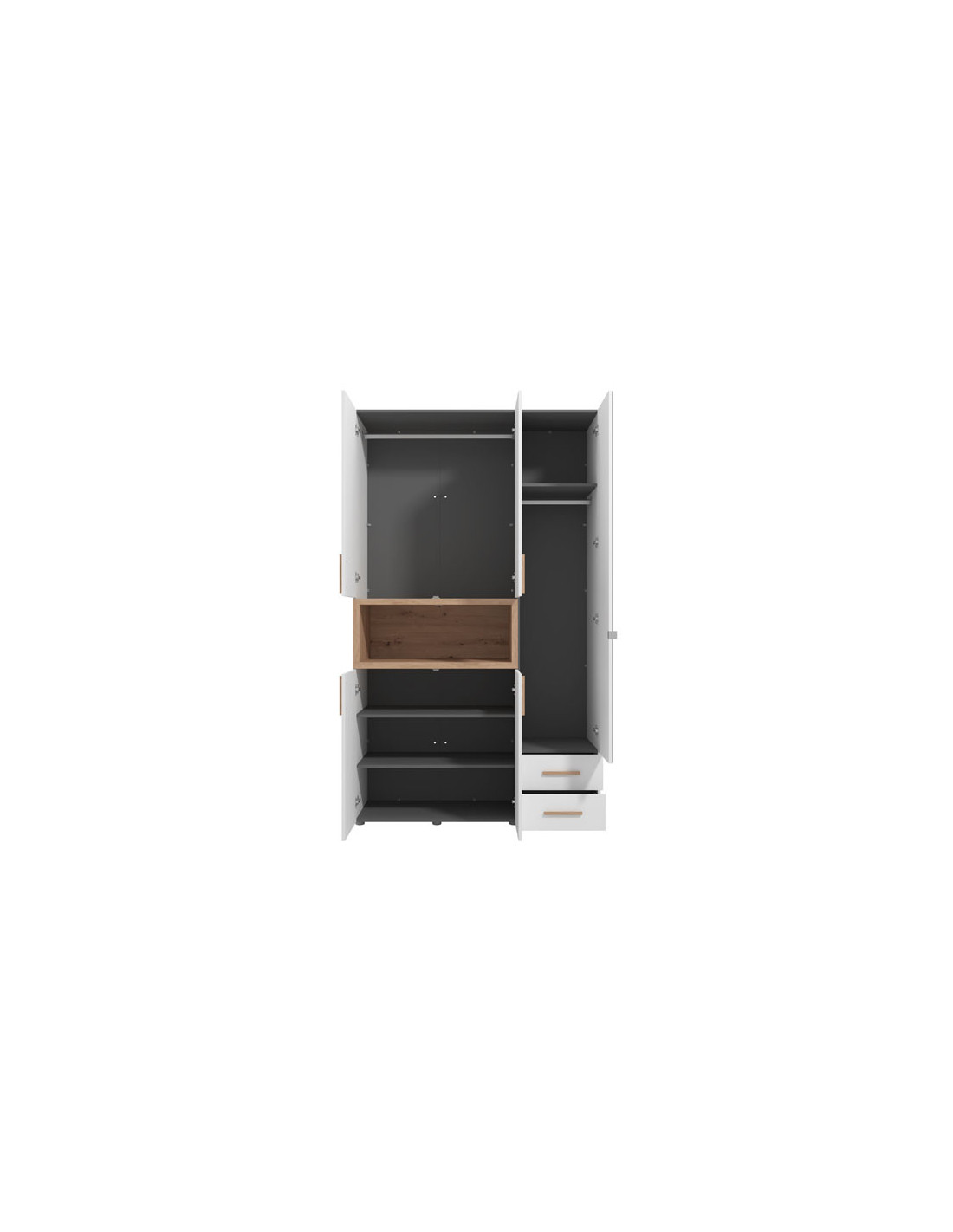 Ormar DONALD 3K2F1O h227, u kombinaciji dekora bijele boje, dekora artisan oak i folije artisan oak, dio je kolekcije ormara DONALD. Korisni prostor ovog trokrilnog ormara sastoji se od dijela s garderobnom šipkom, dvije zatvorene pregrade, dvije ladice i jedne otvorene police. Ovaj model ormara također ima ogledalo, što doprinosi njegovoj funkcionalnosti i estetici ambijenta te ga čini izvrsnim izborom za različite ambijente u modernom domu. Ima mogućnost ugradnje dodatne rasvjete.