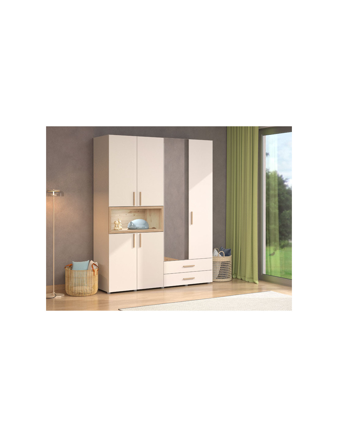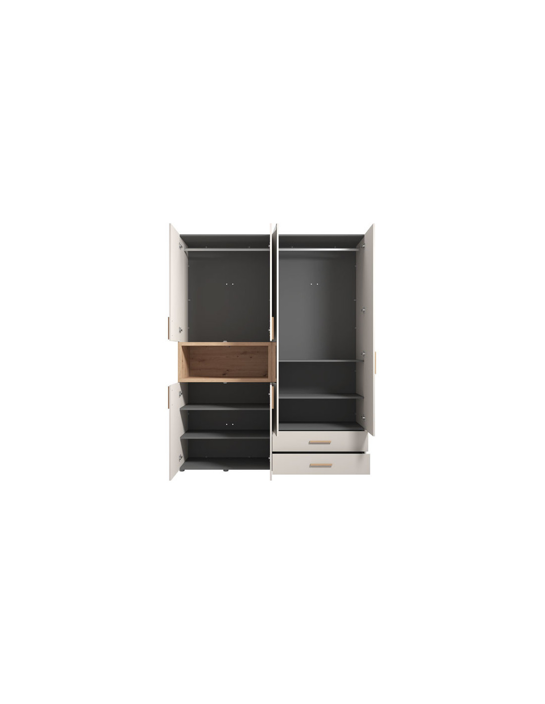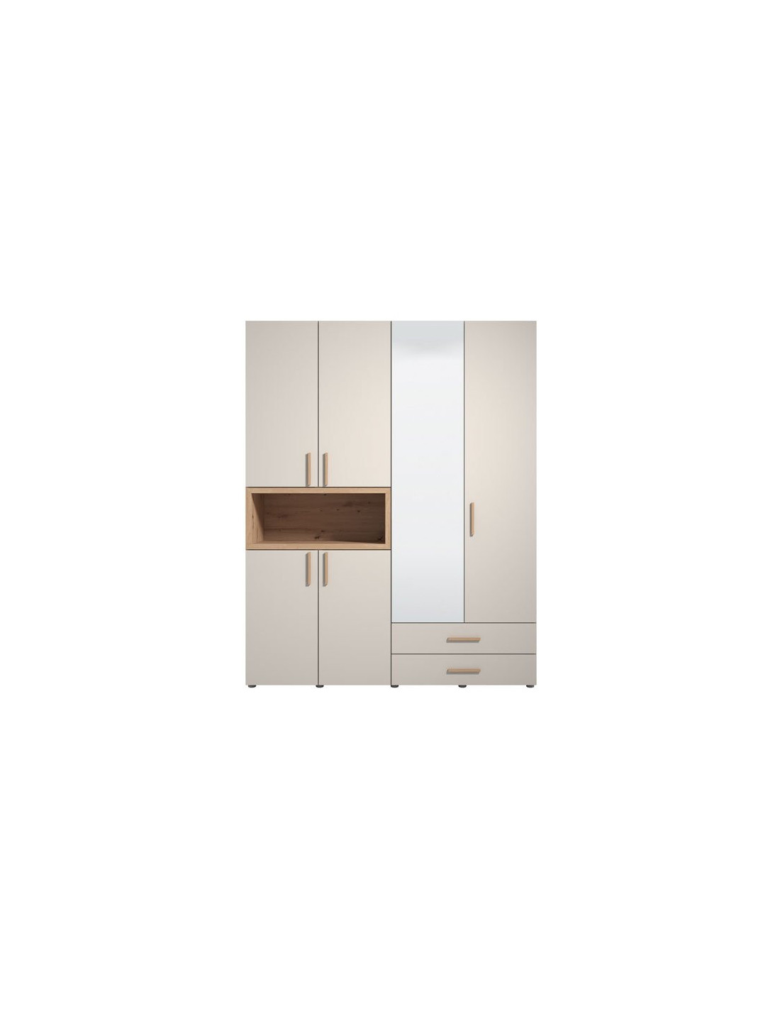 Ormar DONALD 4K2F1O h227 u kombinaciji kašmir dekora i dekora artisan hrasta, dio je kolekcije ormara DONALD. Korisni prostor ovog četverokrilnog ormara sastoji se od dva dijela s garderobnom šipkom, dva zatvorena pregradna dijela, dvije ladice i jedne otvorene police. Ovaj model ormara također ima ogledalo, što doprinosi njegovoj funkcionalnosti i estetici ambijenta te ga čini izvrsnim izborom za različite ambijente u modernom domu. Ima mogućnost ugradnje dodatne rasvjete.