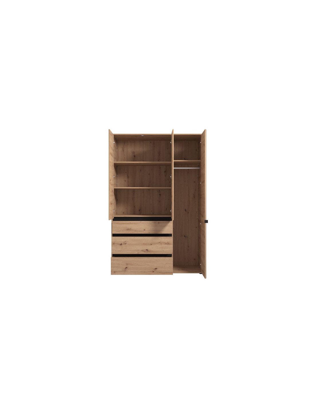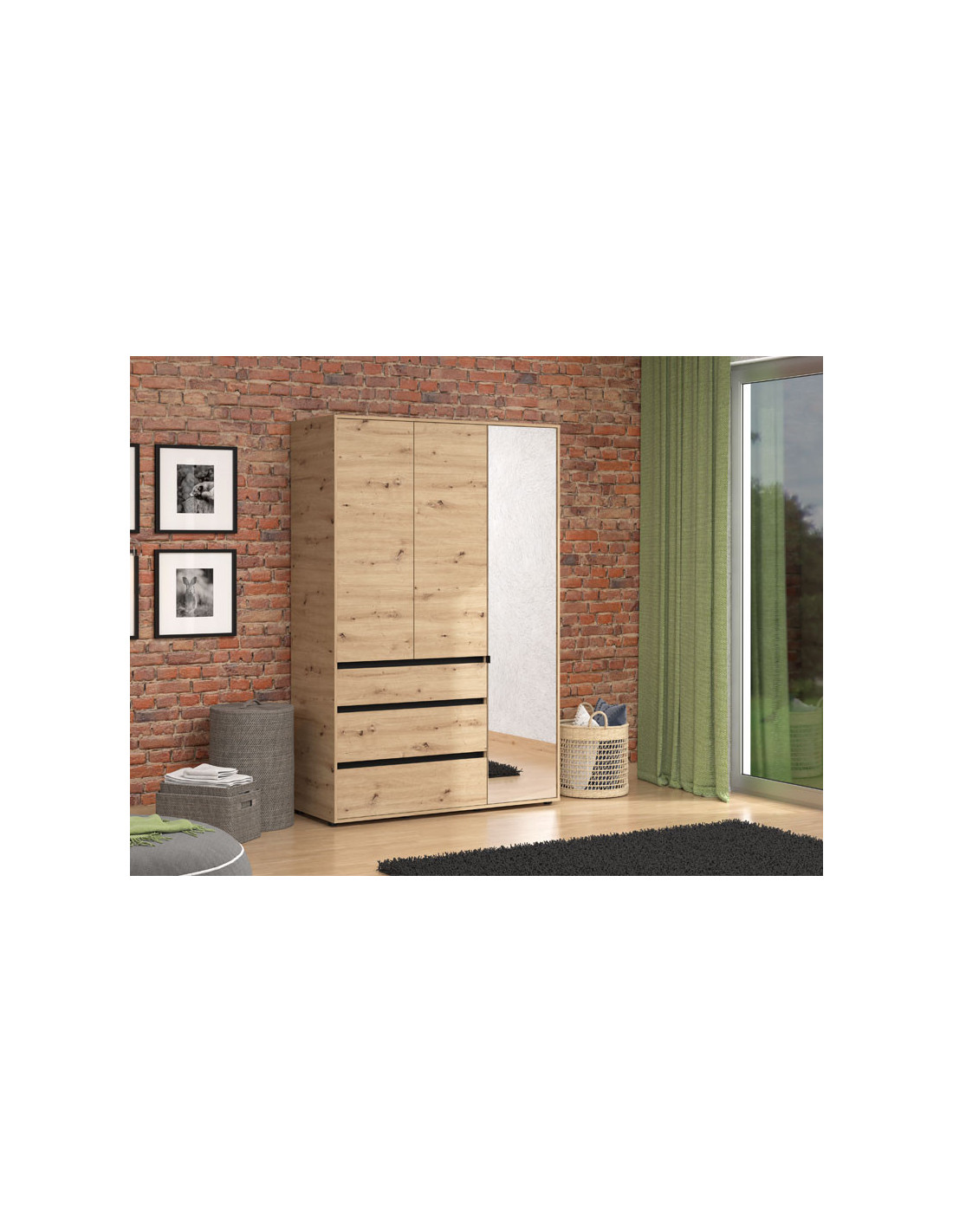 Ormar CORBETT 3K3F1O h211 u kombinaciji dekora artisan hrasta i crne mat folije, dio je kolekcije CORBETT ormara. Upotrebni prostor čine garderobna šipka u krilu iza ogledala, dok gornji i donji dio srednjeg i lijevog krila čine zatvoreni pregradni dijelovi. U središnjem dijelu jedna je praktična ladica. Ovakav model ormara funkcionalno će doprinijeti organizaciji ambijenta, ali i unaprijediti njegovu estetiku.