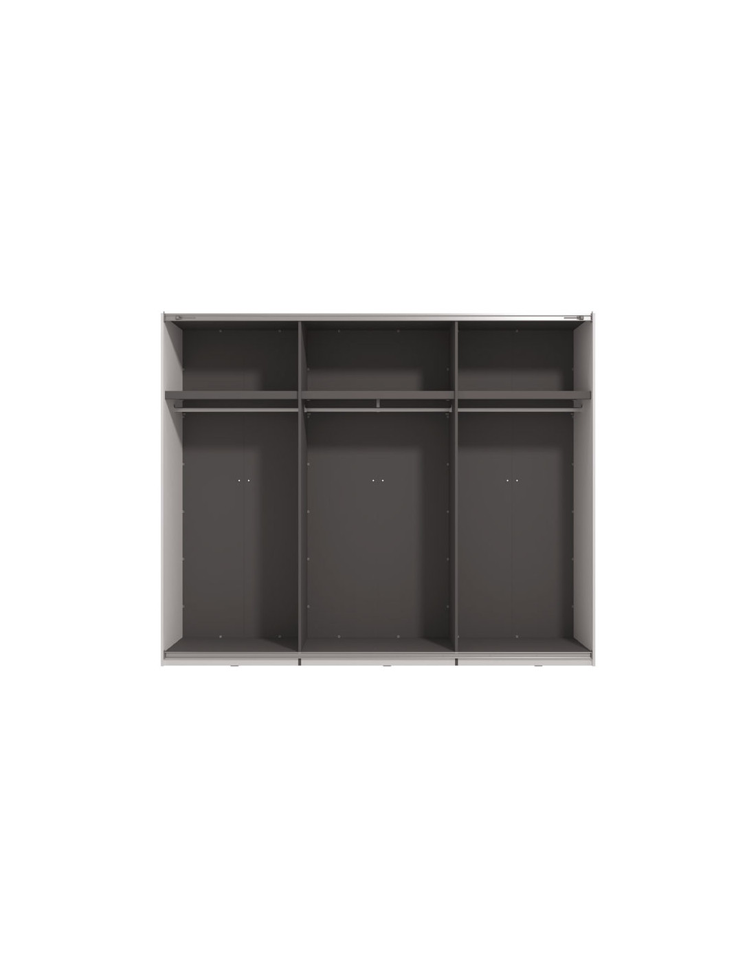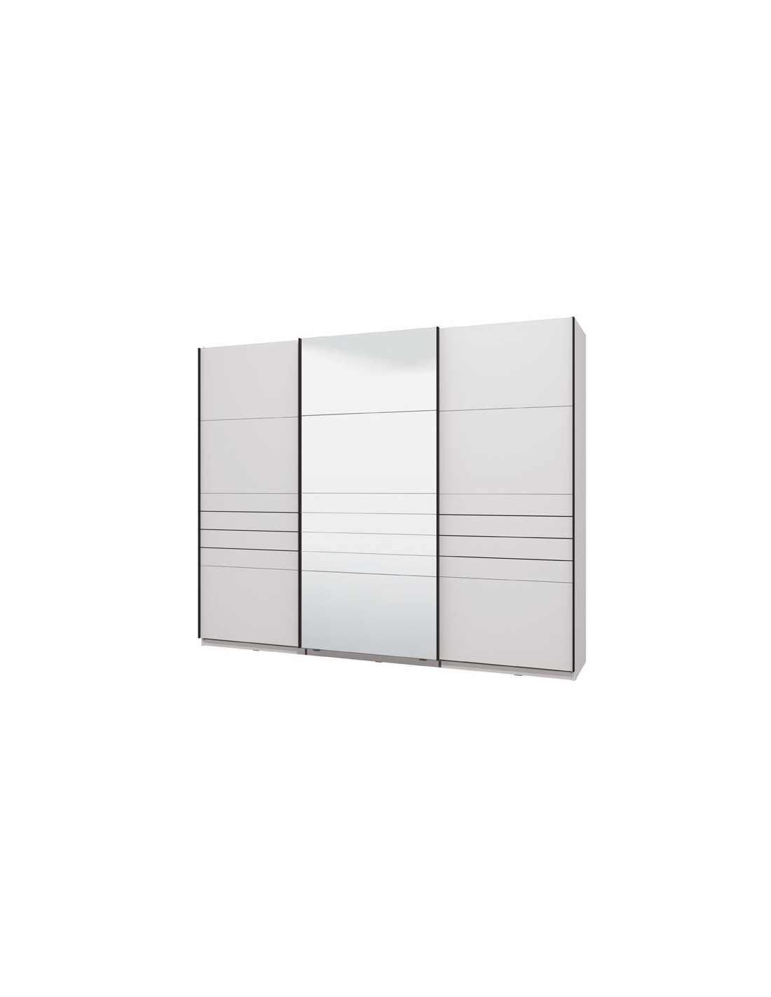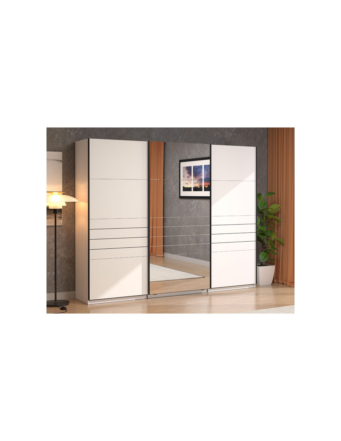 Ormar VEYMONT 270 OG h217 s trokrilnim kliznim vratima, u bijelom dekoru i segmentom s ogledalom na središnjoj fronti, doprinosi funkcionalnosti i estetici interijera. Dio kolekcije ormara VEYMONT elegantno je i vrlo atraktivno dizajnersko rješenje, čija izražena estetika doprinosi cjelokupnom ambijentalnom dojmu. Korisni prostor ovog modela sastoji se od šipki za ormar i po jedne praktične police s lijeve i desne strane. Ima mogućnost dodavanja seta polica prikladnih za ovaj model ormara ili drugih funkcionalnih nadogradnji, kao i mogućnost ugradnje usporivača za klizna vrata.