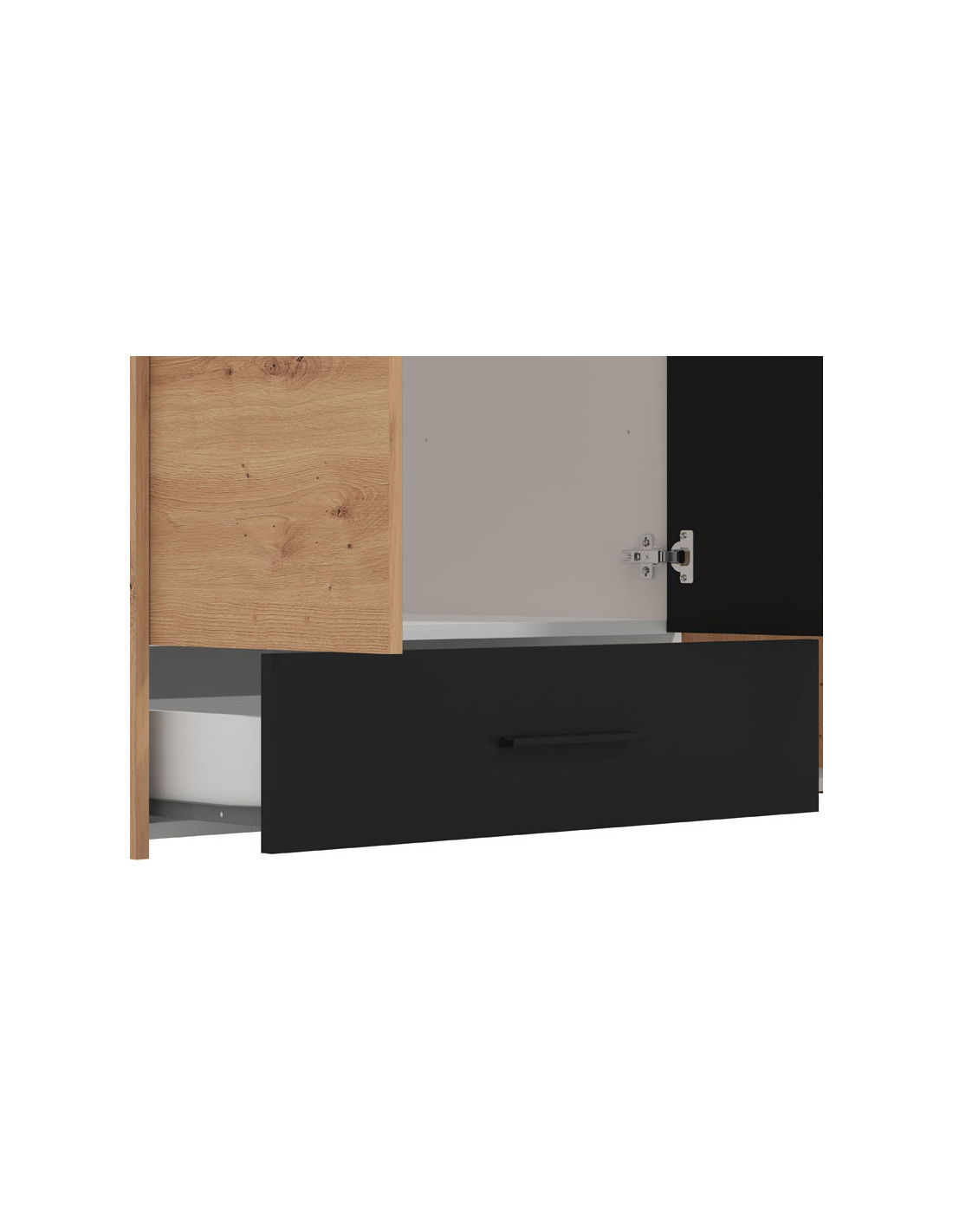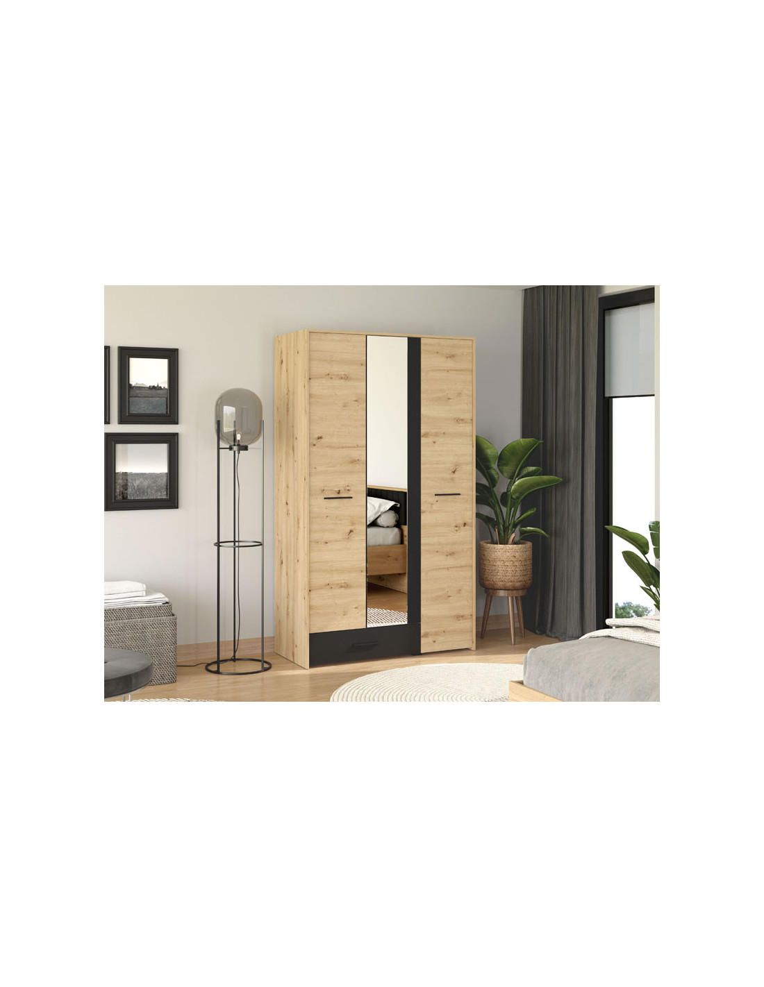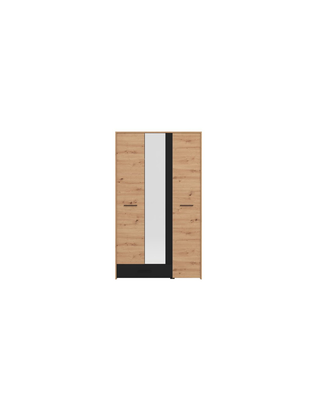 Ormar VARADERO 3K1F1O, u dekoru artisan hrasta i crne boje, dio je istoimene kolekcije elemenata za spavaću sobu. Ima vrlo funkcionalan uporabni prostor sa sustavom polica, kao i dio sa šipkom za garderobu i policom iznad nje. Dodatna estetska pogodnost je ogledalo u središnjem dijelu.
