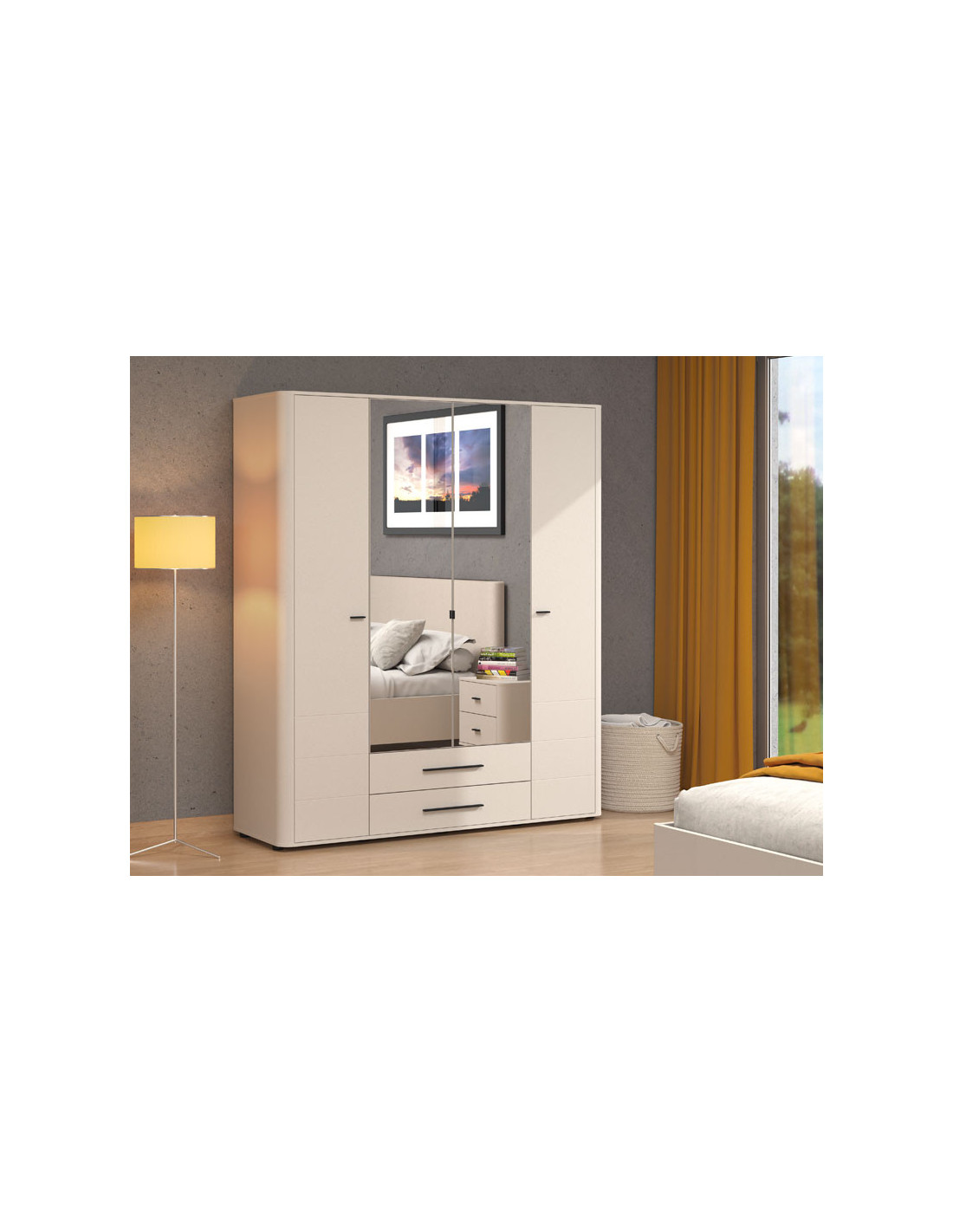 Ormar SERDICA 4K2F2O h211, u kombinaciji dekora kašmira i mat folije kašmira, predstavlja atraktivno i funkcionalno dizajnersko rješenje za opremanje modernog ambijenta spavaće sobe. Ovaj četverokrilni ormar, s dva ogledala u središnjem dijelu, doprinosi izraženoj estetici, eleganciji, ali i praktičnosti ambijenta spavaće sobe. Korisni prostor ovog modela sastoji se od šipki za ormar, pregrada i dvije ladice. Dio je istoimenog sustava namještaja za spavaće sobe SERDICA, s modernim dizajnom, zaobljenim rubovima na elementima i visokim nogama koje doprinose atraktivnosti moderno dizajniranog interijera.