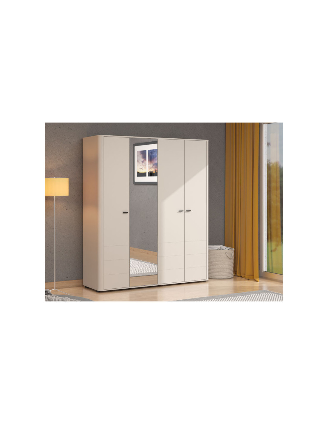 Ormar SERDICA 4K1O h211, u kombinaciji dekora kašmira i mat folije kašmira, predstavlja atraktivno i funkcionalno dizajnersko rješenje za opremanje suvremenog ambijenta spavaće sobe. Ovaj četverokrilni ormar, s dva ogledala u središnjem dijelu, doprinosi izraženoj estetici, eleganciji, ali i praktičnosti ambijenta spavaće sobe. Korisni prostor ovog modela sastoji se od šipki za ormar, pregrada i dvije ladice. Dio je istoimenog sustava namještaja za spavaće sobe SERDICA, s modernim dizajnom, zaobljenim rubovima na elementima i visokim nogama koje doprinose atraktivnosti moderno dizajniranog interijera.