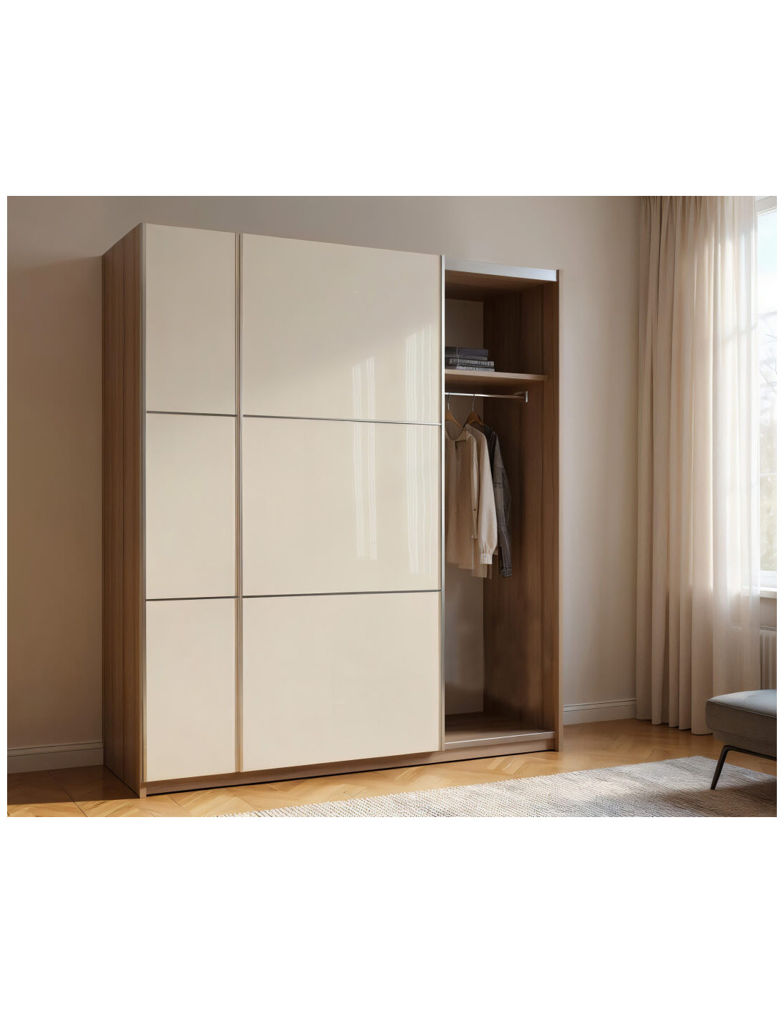 ELEGANCE LINE američki ormar AP 180 pravo je rješenje za postizanje praktičnosti interijera i maksimalnog iskorištenja raspoloživog prostora. Unutrašnjost ormara je dvodijelna. Jedan dio američkog ormara sadrži samo šipku za garderobu, a drugi dio je podijeljen policama za odlaganje robe, s 2 ladice na dnu, zajedno s šipkom za garderobu. Izrađen je od univerzalne debljine 18 mm i ima mehanizam za sporo zatvaranje.