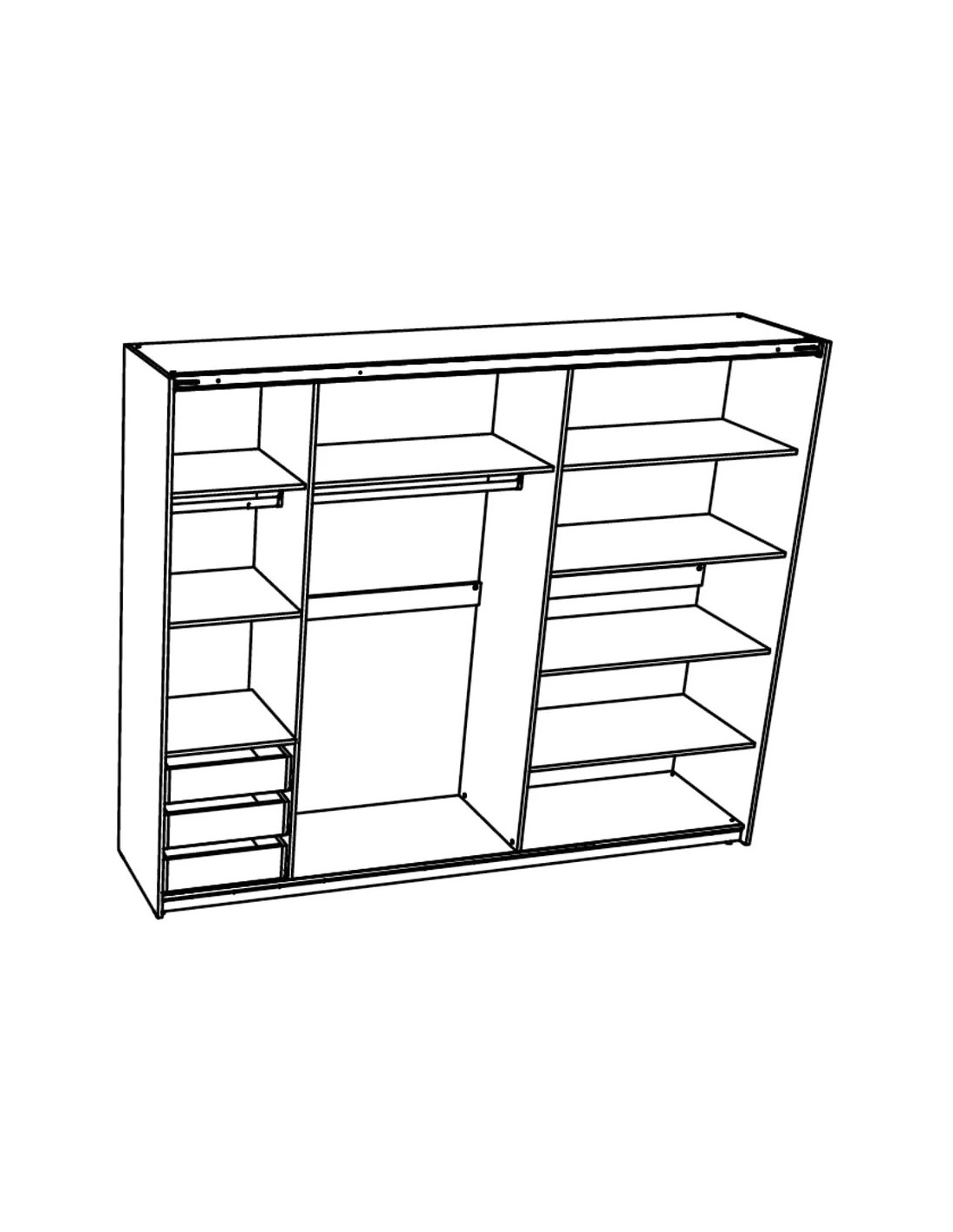 Američki ormar ELEGANCE LINE AP 270 dizajniran je kako bi svojim dizajnom i iskoristivim prostorom unio maksimalnu organizaciju u spavaću sobu. S raskošnim dimenzijama i unutarnjim rasporedom s policama (desni dio) i vješalicama za odjeću (lijevi i središnji dio), zadovoljava potrebe za pohranom u ormaru. Lijevi dio također sadrži 3 ladice na dnu. Dva dijela američkog ormara sadrže šipku za garderobu, a jedan dio je podijeljen policama za pohranu odjeće. Izrađen je od profinjenog univara debljine 18 mm.