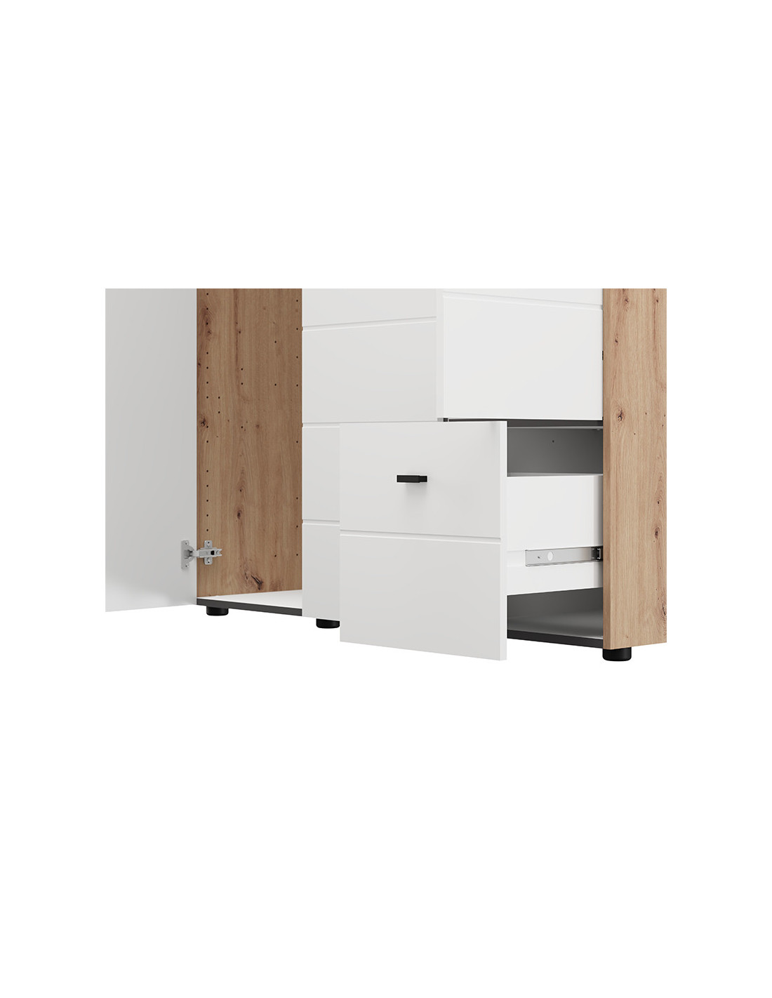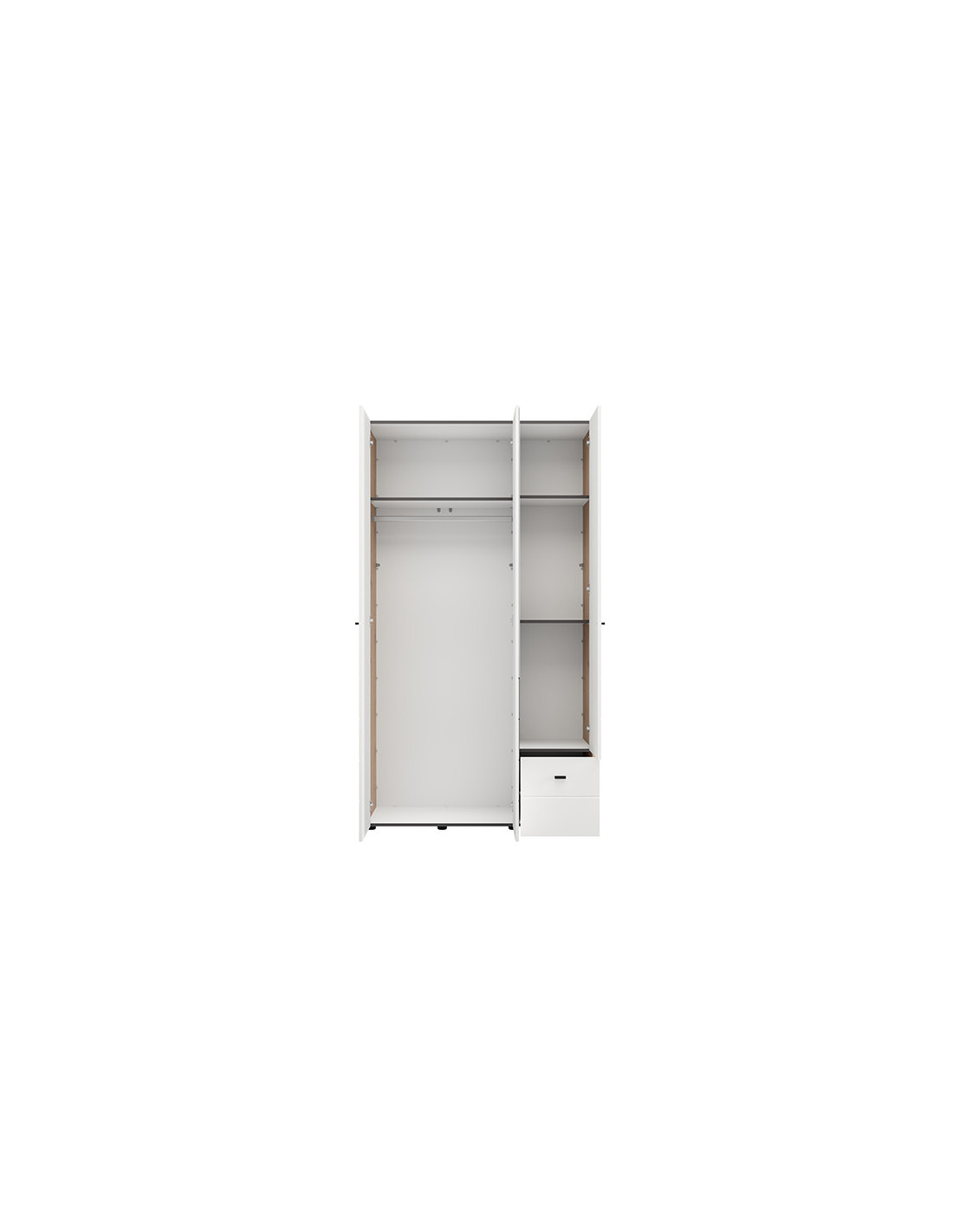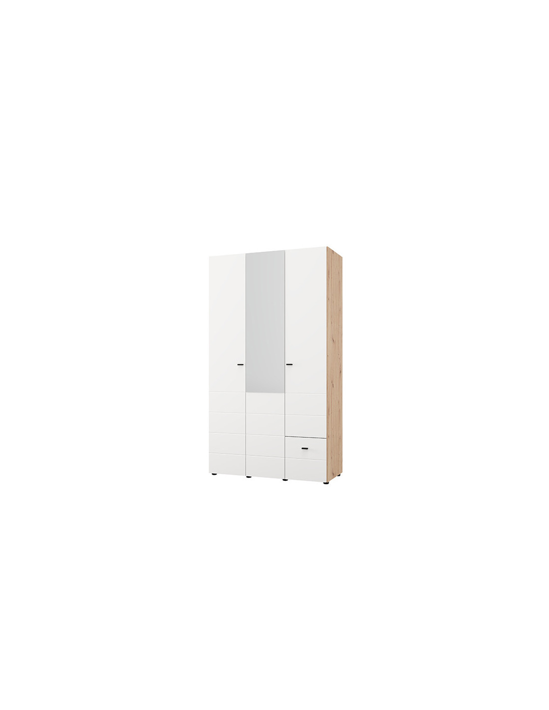 Ormar NEVIS 3K1F1O h207, u kombinaciji artisan hrasta i bijele boje, funkcionalno je i moderno rješenje za pohranu odjeće. Korisni prostor uključuje dvokrilni dio s vješalicom za odjeću, jedan pregradni segment i jednu duboku ladicu, što omogućuje praktičnu i preglednu organizaciju odjeće i dodataka. Postoji mogućnost dodavanja seta polica za još bolju organizaciju unutarnjeg prostora. Ogledalo dodatno doprinosi funkcionalnosti i vizualno povećava prostor.