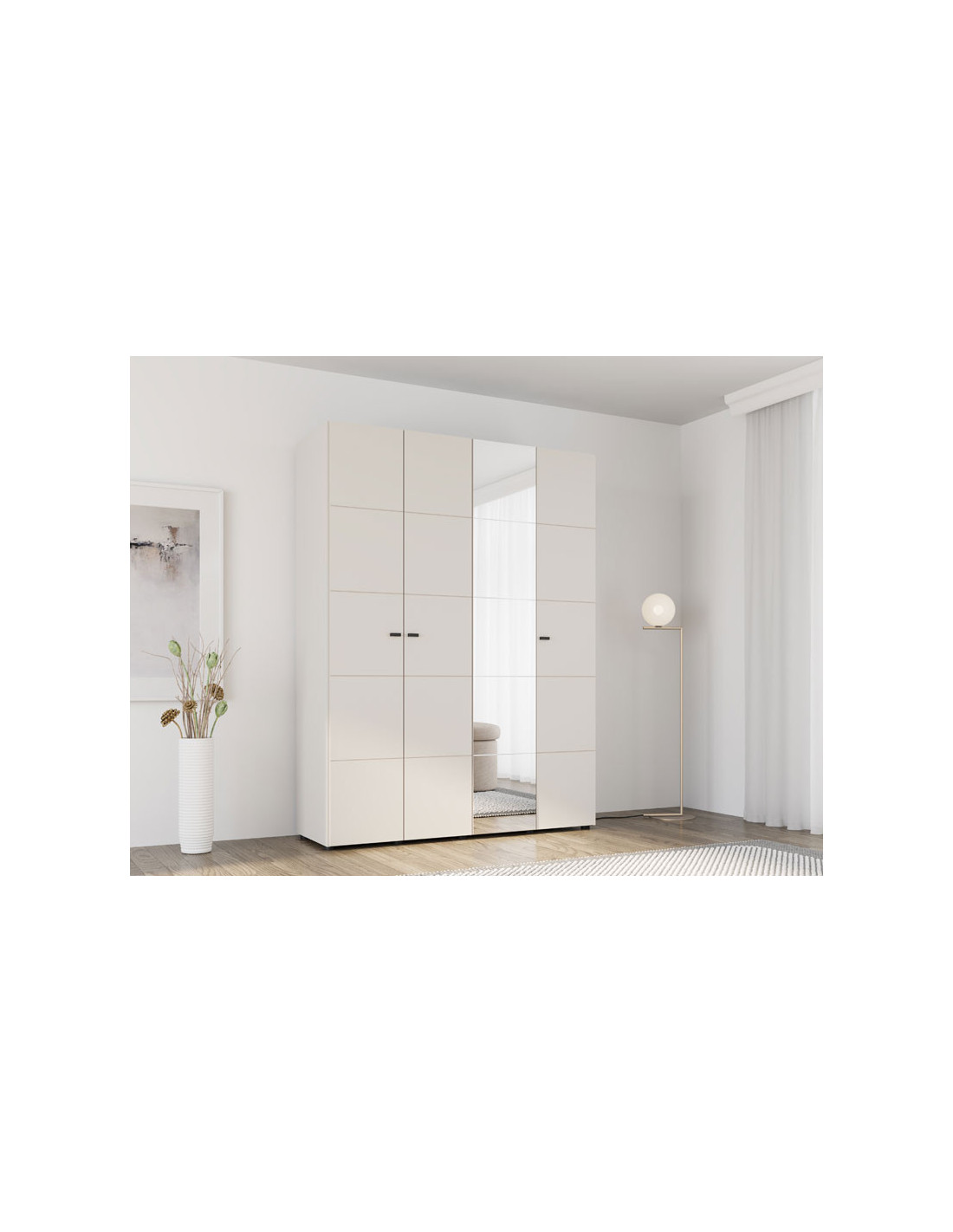 Ormar SALAMIS 4K1O h207, izrađen u elegantnoj kašmir boji, doprinosi smirenom i modernom izgledu spavaće sobe, dok ogledalo na jednoj fronti dodatno poboljšava funkcionalnost i vizualni doživljaj prostora.
