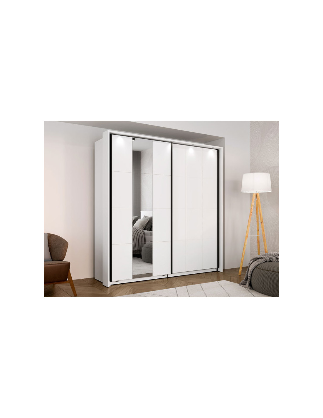 Ormar SALAMIS 200 OG h205 dio je istoimene kolekcije dekoracija za spavaće sobe SALAMIS, s modernim i minimalističkim dizajnom.