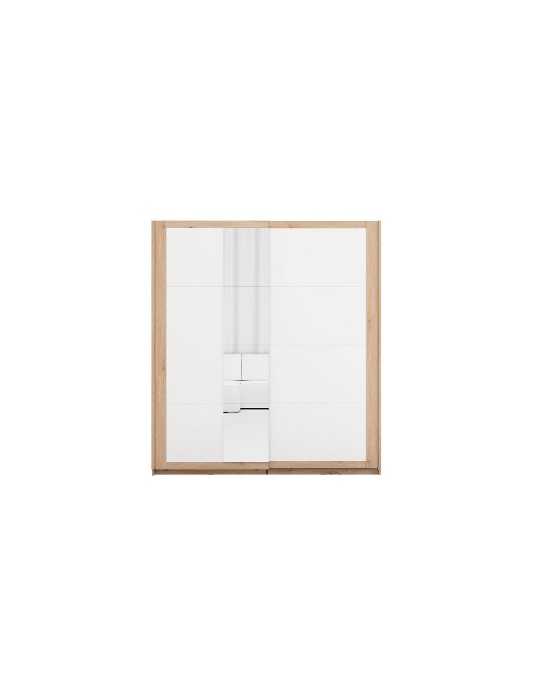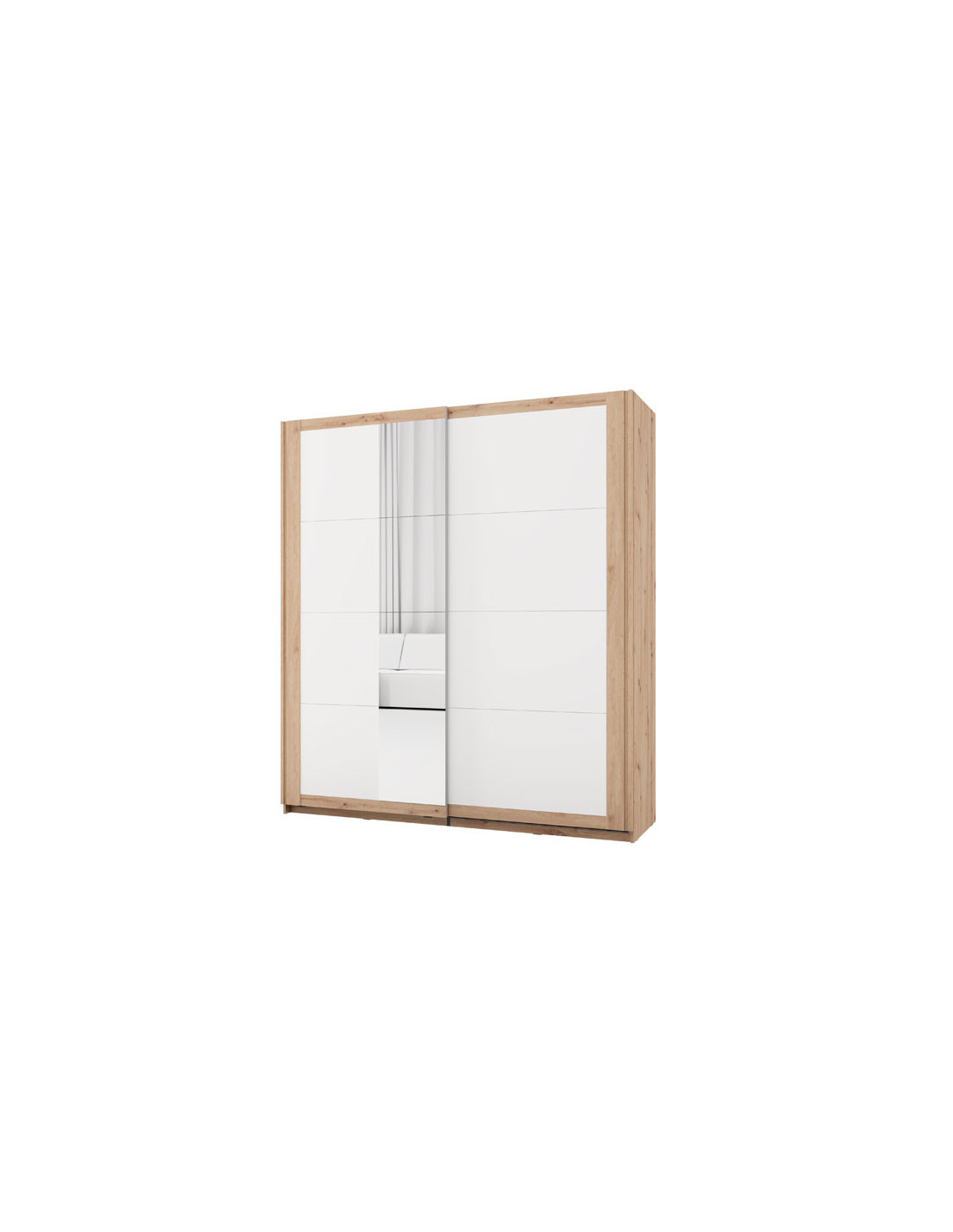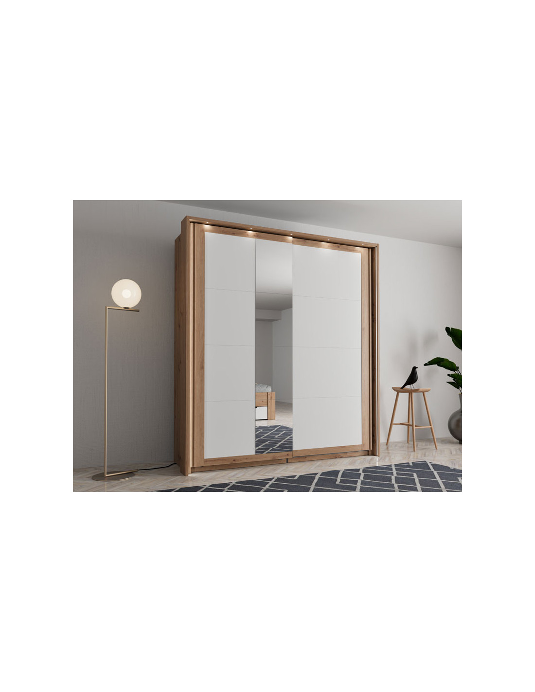 Ormar CARTENA 200 OG h217, izrađen u kombinaciji bijelog dekora, hrasta i folije od hrasta, doprinosi modernom i elegantnom izgledu spavaće sobe, naglašavajući kontrast i precizan geometrijski oblik. Jedna fronta ormara opremljena je ogledalom, što dodatno poboljšava funkcionalnost i vizualno proširuje prostor.