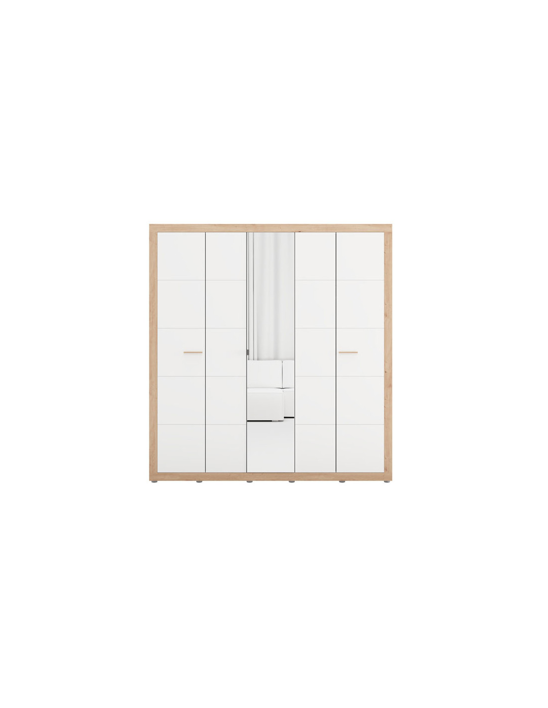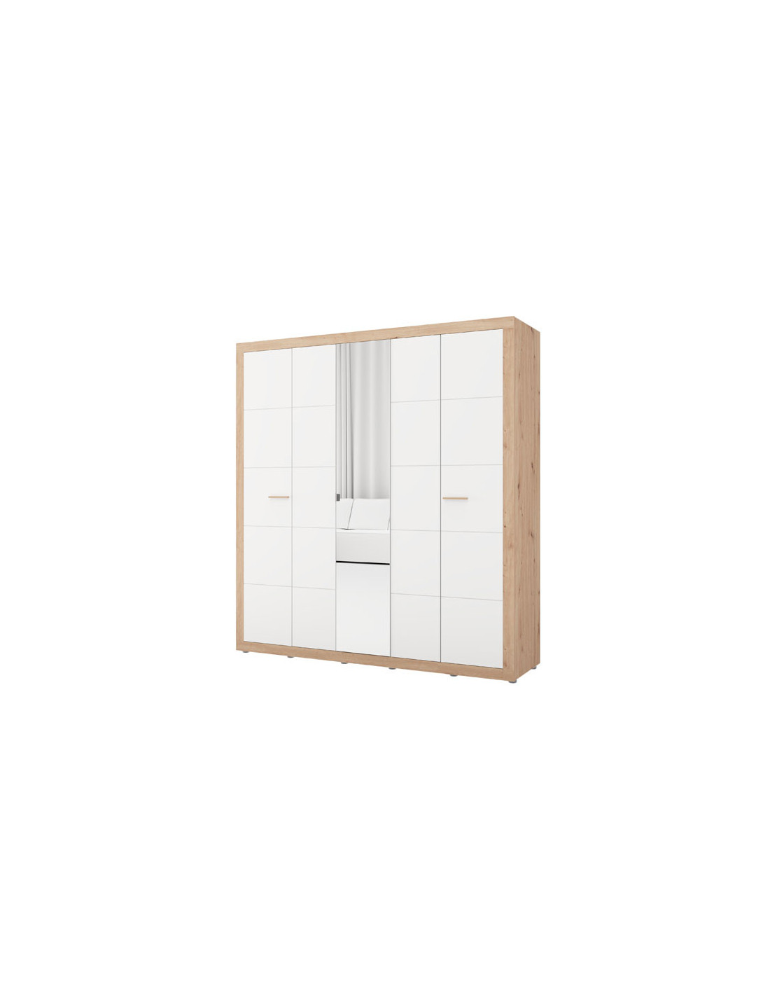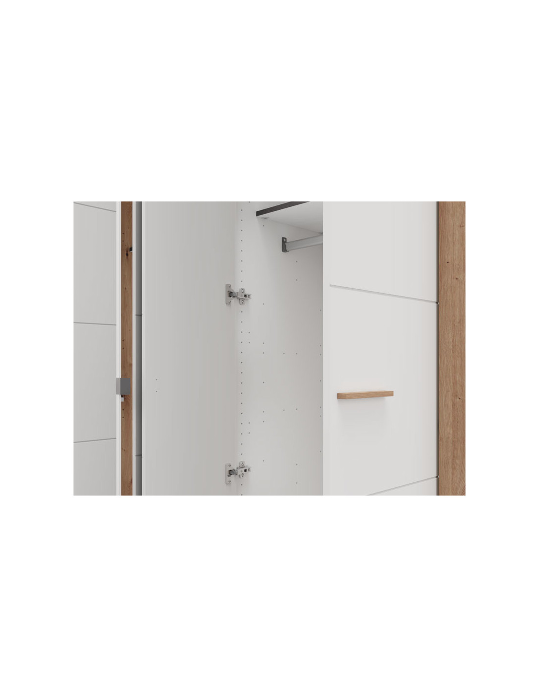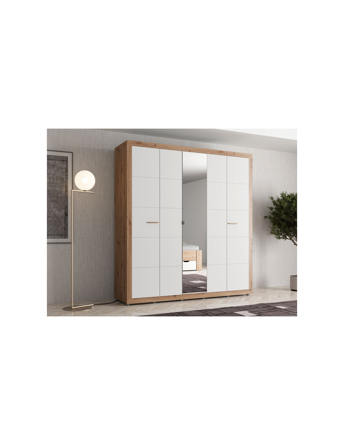 Ormar CARTENA 5K1O h207, izrađen u kombinaciji bijelog dekora, hrasta i folije od hrasta, doprinosi modernom i elegantnom izgledu spavaće sobe, naglašavajući kontrast materijala i preciznu geometrijsku liniju dizajna. Središnja fronta ormara opremljena je ogledalom, što dodatno poboljšava funkcionalnost i vizualno proširuje prostor.
