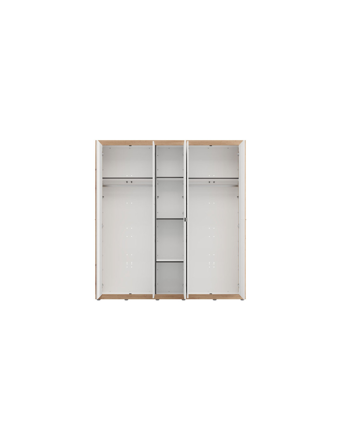 Korisni prostor ormara s pet krila organiziran je tako da dva dvokrilna dijela sadrže šipku za garderobu, dok je središnji dio opremljen policama, što omogućuje pregledno i praktično skladištenje ormara.