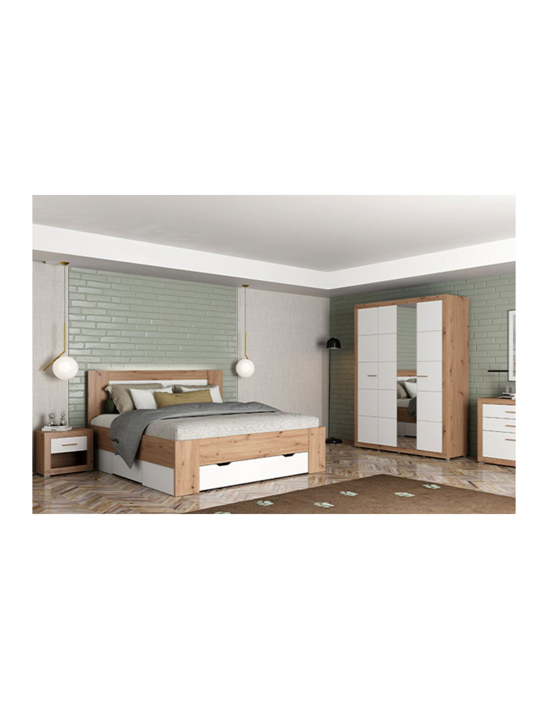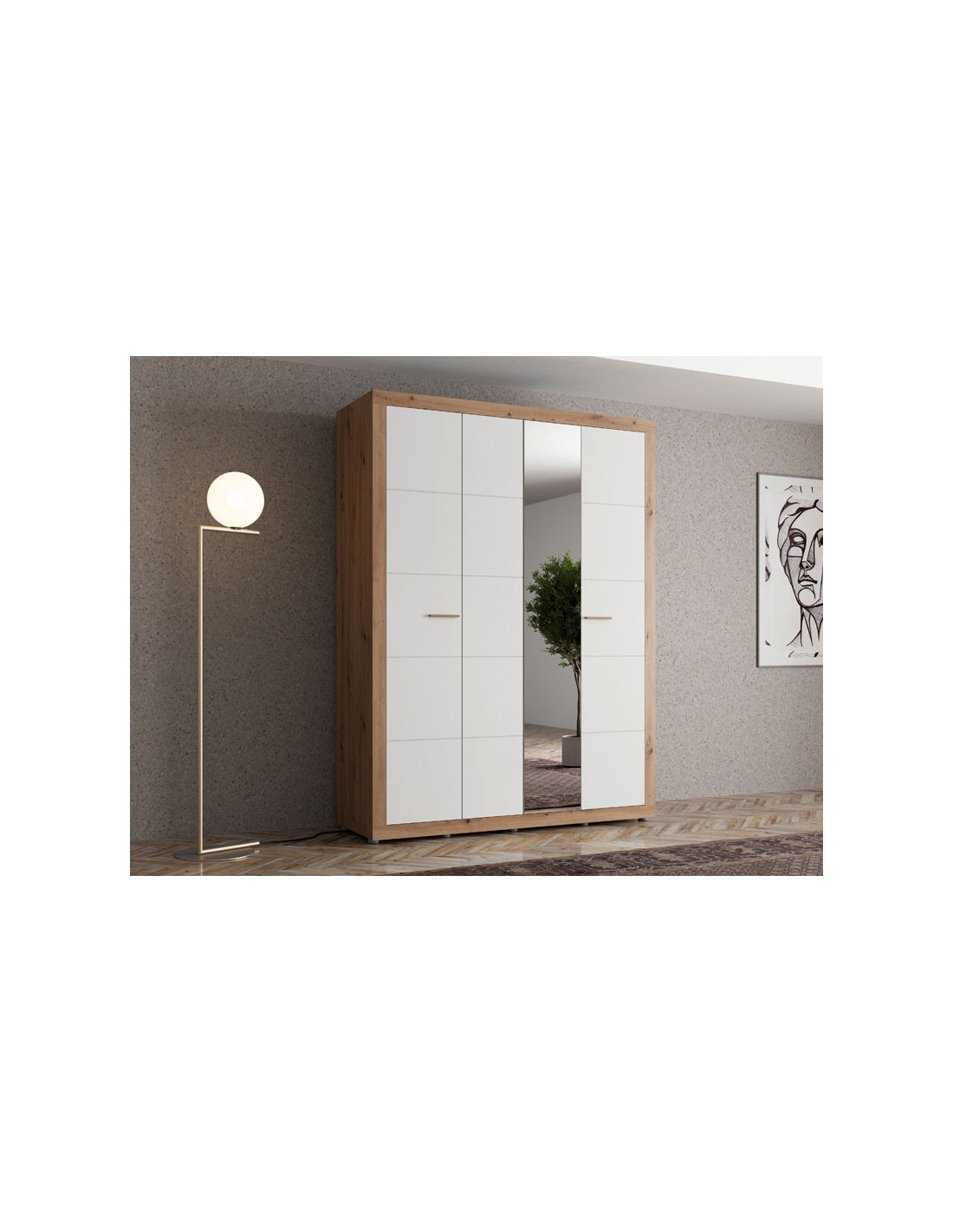 Ormar CARTENA 4K1O h207, izrađen u kombinaciji bijelog dekora, hrasta i folije od hrasta, doprinosi modernom i elegantnom izgledu spavaće sobe, naglašavajući kontrast materijala i preciznu geometrijsku liniju dizajna. Jedna fronta ormara opremljena je ogledalom, što dodatno poboljšava funkcionalnost i vizualno proširuje prostor.