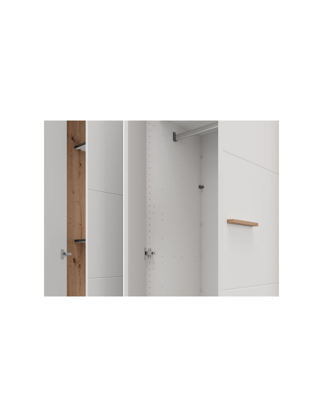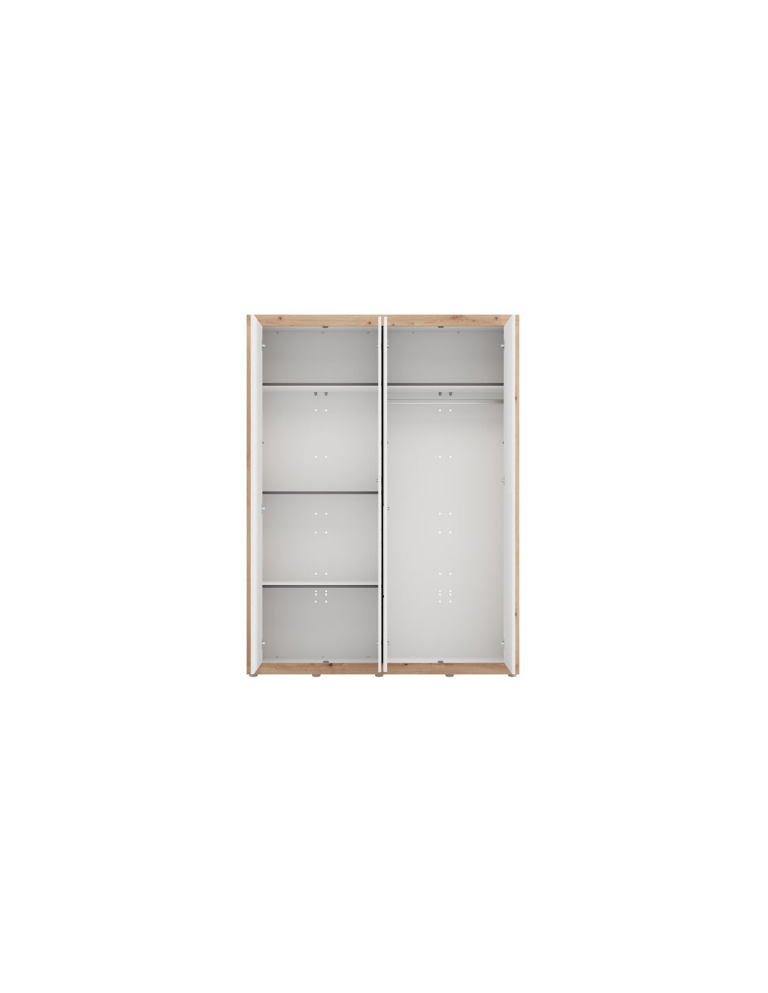 Korisni prostor četverokrilnog ormara organiziran je tako da jedan dvokrilni dio sadrži šipku za garderobu, dok je drugi dvokrilni dio opremljen policama za pregledno i praktično skladištenje odjeće i sitnica. Ormar također nudi mogućnost naknadnog dodavanja seta polica, što dodatno poboljšava funkcionalnost unutarnjeg prostora.